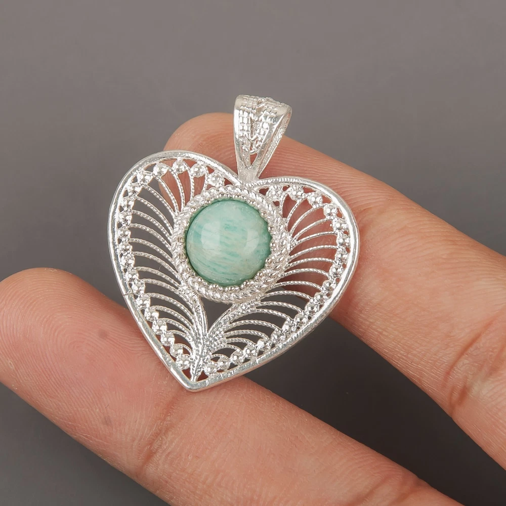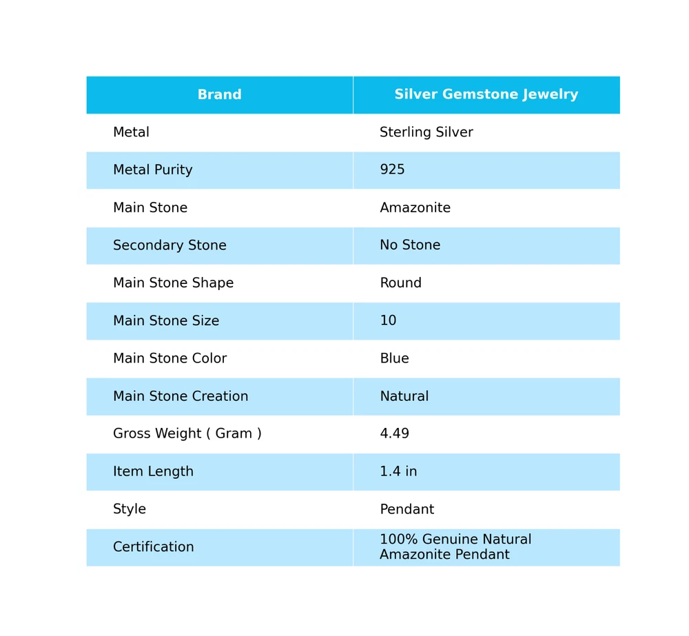 Welcome to Jaipur Silver Gallery Gift For Her 925 Sterling Silver Natural Amazonite Gemstone Jewelry Pendant Love Handmade Pendant, Sterling Silver Pendant, Amazonite Pendant, Handcrafted Pendant SKU : - JSCP-15-19 Gemstone : - Amazonite Stone Shape : - Round Metal : - Sterling Silver Metal Purity : - 925 Pendant Length : 1.4 Inches Pendant Width : Inches _______________________________________________________________________________________ Amazing Properties of Silver ****************************** Tough and Long-lasting: Silver is incredibly strong, built to withstand daily wear and tear as well as tough environmental conditions. Easy to Shape and Design: Silver is like clay for skilled craftsmen, allowing them to create beautiful and intricate designs effortlessly. Great at Conducting Energy: When it comes to heat and electricity, silver is the go-to. It can quickly and efficiently transfer energy, making it ideal for various applications. Keeps Things Clean and Safe: Silver has a natural ability to keep harmful bacteria at bay, making it a reliable choice for promoting cleanliness and well-being. 3 Underrated Benefits Of Silver ****************************** Gorgeous Charm: Silver jewelry shines brightly, enhancing any outfit and fitting everyone's style with ease. Gentle on Skin: Silver is kind to your skin, reducing the chance of allergies and making it a favorite choice for accessories. Healing Vibes: Some believe silver jewelry has a soothing touch, possibly aiding in easing issues like arthritis, anxiety, and the blues. _______________________________________________________________________________________ For Mother's Day Gift For Father's Day Gift For Promise For Valentine' Day For Halloween Party For Christmas Day Gift For New Year Party For Mom For Her _______________________________________________________________________________________ If you need more help or want design tips, just give us a shout! We're lightning-fast in getting back to you. Every single thing we create is made by hand in our special workshop, and we put a whole lot of love and care into every piece. Thank you for stopping by! We're confident you'll have an amazing time shopping with us. We're here to make sure every moment you spend with us is filled with delight and satisfaction. Happy shopping!