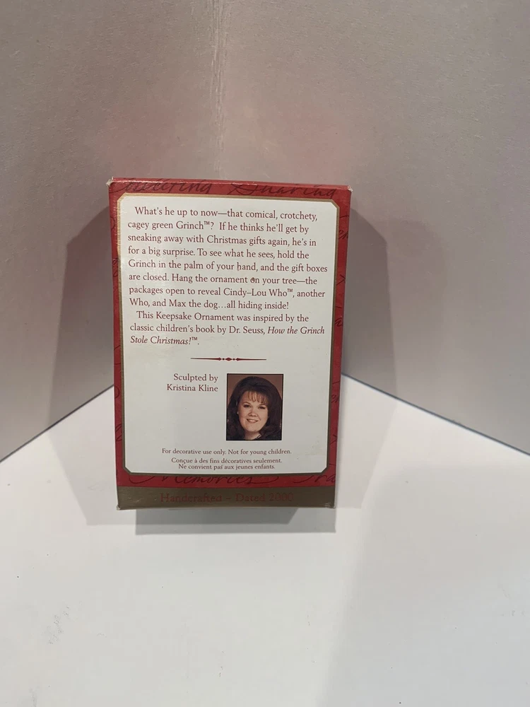 Original/Licensed Reproduction:OriginalYear Manufactured:2000Item Width:3 ingtin13:015012569537Recipient:AnyoneItem Height:4 inUPC:015012569537Price Tag Attached:YesBox Condition:Near Mint to MintCharacter:Grinch, Cindy Lou Who, Max the DogBrand:HallmarkModified Item:NoTheme:ChristmasItem Condition:Excellent Preowned ConditionTime Period Manufactured:2000-2009Franchise:Dr. SeussType:OrnamentRetirement Status:RetiredSet Includes:OrnamentVintage:YesCollection:Dr. SeussSubject:GrinchColor:MulticolorOccasion:ChristmasMPN:QXI5344Item Type:Decorative Tree Ornament - Not a toy
