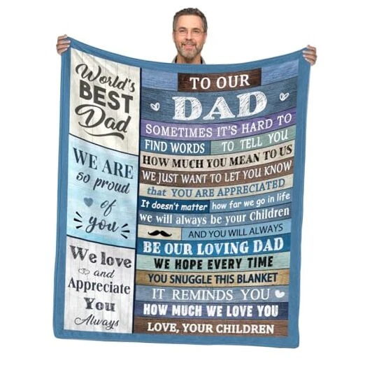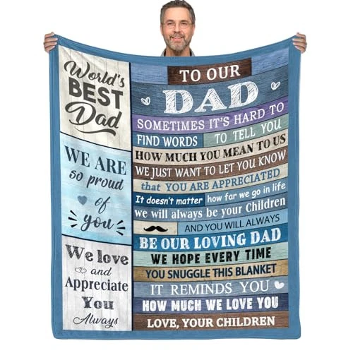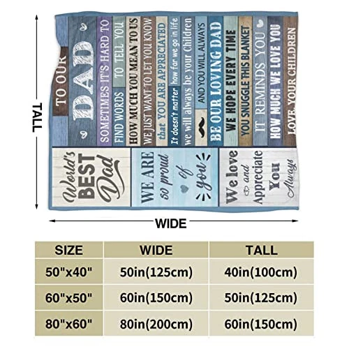Return Policy Fast Delivery Trusted seller Gifts for Dad Blanket, Dad Blanket, to My Dad Gift, Birthday Gifts for Dad, Dad Birthday, Dad Gifts from Kids Daughter Son Throw Blanket 60" X 50" -Dad Birthday Gifts Product Description AWESOME GIFT: This loving to dad blanket is a great birthday gift or fathers day gift for dad. SIZE: 60 × 50 Inches(150 × 125cm), it is suitable for both indoor and outdoor activities, make you feel better when your are relaxing on sofa or couch. MATERIAL: This blanket made of ultra-soft micro flannel, comfortable and warm, suitable for all season. OCCASIONS: Lightweight and foldable, convenient to carry. Great blanket to keep warm for reading, working, watching TV, outdoor activities like travelling, camping. ABOUT THE WASH: Easy to care, hand wash and machine washable, quick drying, durable, do not bleach. Shipping Returns Payment Shipping Shipping is FREE to all addresses other than APO/PO boxes in the lower 48 states. All our stock ships from US-based warehouses. Shipped via USPS or UPS (depending on location and package weight) Unless stated otherwise, all orders will ship within 24-72 hours of your payment being processed. Check our feedback to see the great reviews of FAST shipping we offer. Returns Seller does not accept returns Payment We currently accept payment via eBay managed payments only. Once payment is cleared, we will dispatch your shipment within 1-3 business days. Please refer to the "Shipping" tab for more information regarding shipping speed to your destination.