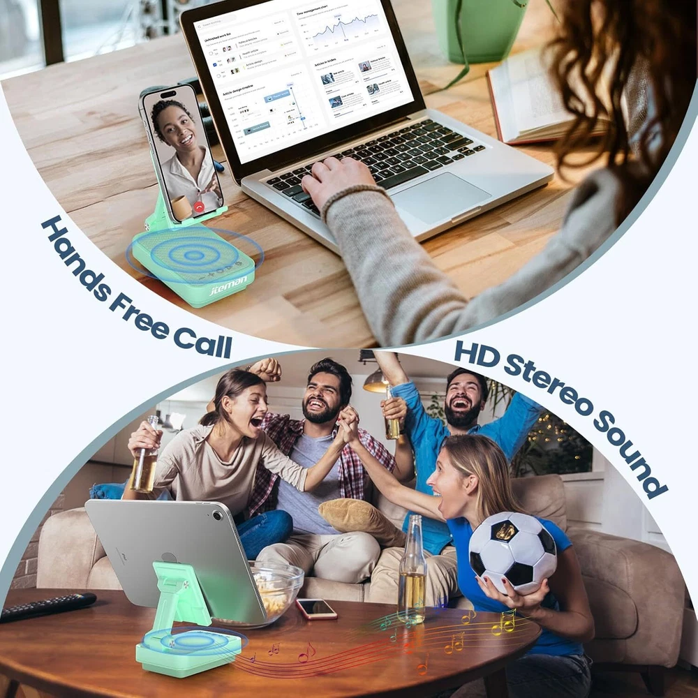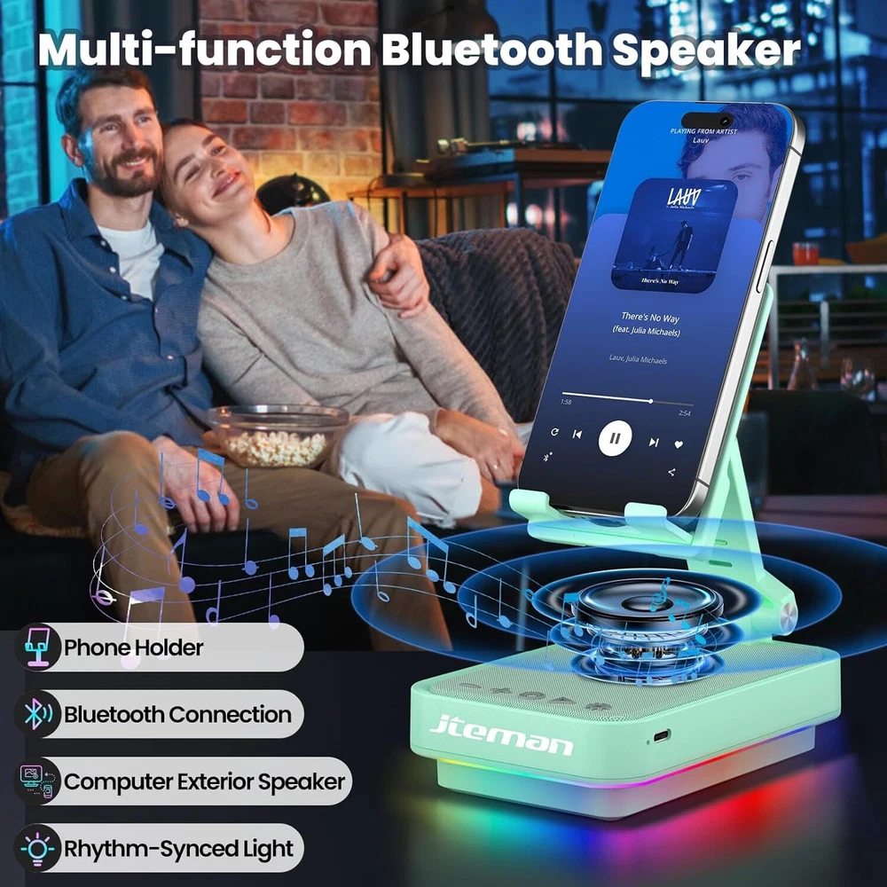 【3 IN 1 Multi-function Phone Stand+Bluetooth Speaker+Light】Our phone stand speaker with light combines cell phone stand, Bluetooth speaker and atmospheric light in one, the atmosphere light at the bottom can jump with the rhythm of the music. The loud Bluetooth speaker built-in 4Ω5W Power Speaker, provide HD stereo surround sound. The cool gadget is a great gift choice for men women. 【Rhythm-Synced Light Show】The Bluetooth speaker with lights has 5 monochrome lights and 6 mixed lighting modes, 3 of the mixed lighting modes will dance with the beat of the music. 4 brightness options, you can easily customize the light brightness. Turning on the color-changing lights to play music during the evening would be an awesome experience! 【Height and Angle Adjustable & Anti-slip & Foldable】The height and angle of the phone stand holder can be adjusted, you can easily adjust your device to find comfortable viewing angle. The panel, groove, and base are covered with anti-slip silicone to support your device firmly. Enjoy portability with a foldable design, perfect for travel or daily use. 【Universal Compatibility with Phone Tablet】The cell phone stand for desk supports for most 4-13" smartphones, tablets, e-readers, Kindel, Switch, iPad and more. Bluetooth 5.3 easily connects your device without any latency. The wireless speakers with Bluetooth compatible with iPhone, Samsung, Android smartphones, Computer, and most devices with Bluetooth. 【Cool Gadgets for Men Women】The portable Bluetooth speakers with stand is a great birthday gifts for men, women, father, mother, wife, husband, friends and anyone you love. Also perfect for mothers day gifts, fathers day gifts, anniversary gifts, graduation gifts, retirement gifts, teacher appreciation gifts, Thanksgiving gifts, Christmas gifts and more.
