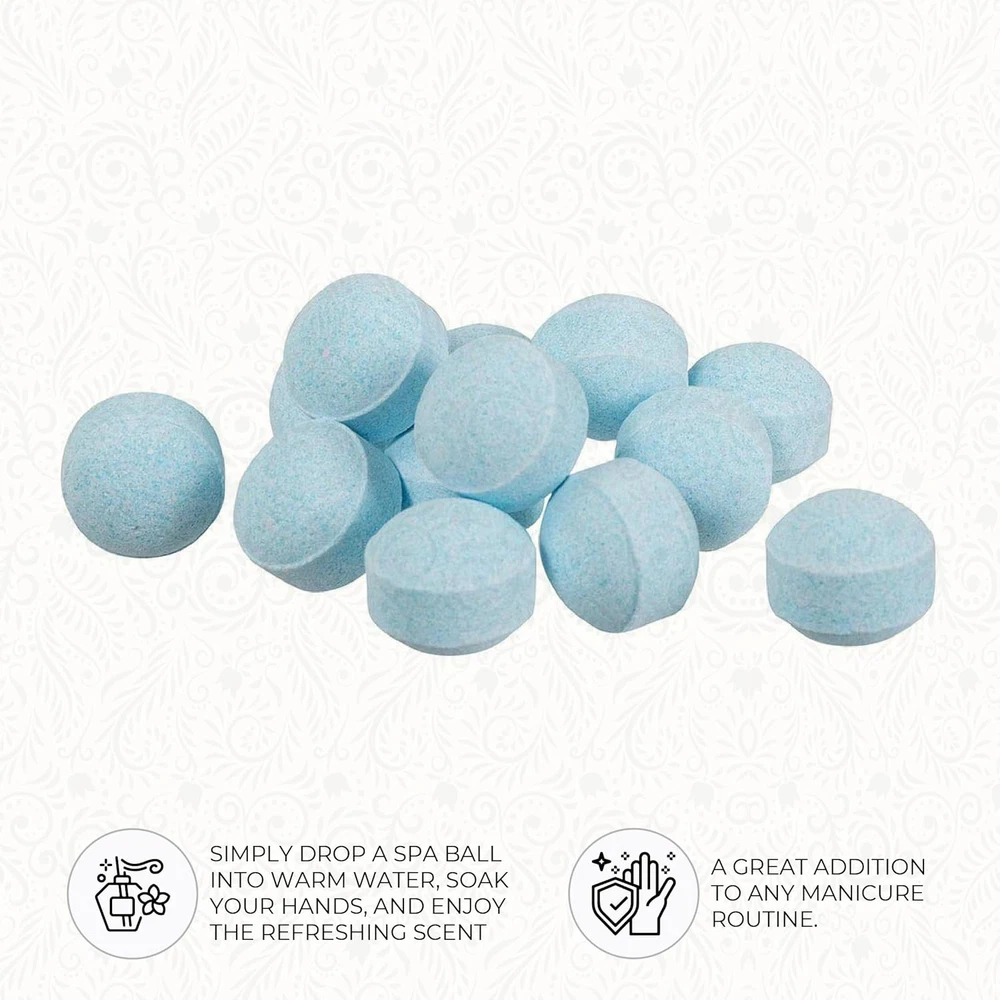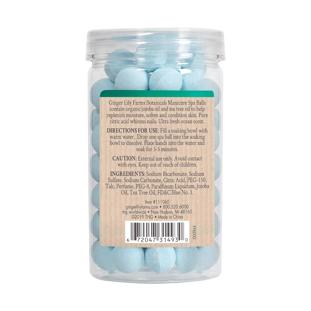Manicure Spa Balls: Ginger Lily Farms Botanicals Manicure Spa Balls prepares nails and cuticles for manicure service. Natural & Organic Spa Balls: These natural and organic spa balls contain organic jojoba oil and tea tree oil to help replenish moisture, soften and condition skin. Easy to Use: To use, drop one Manicure Spa Ball into a bowl with warm water to dissolve, place hands into the water and soak for 3-5 minutes. Just sit back and relax while soaking! Scented Spa Balls: The fresh scented spa balls add a little extra touch in the manicure bowl. The pure citric acid in the manicure balls whitens nails and softens the cuticle which saves time. Quantity: The 8oz pack contains 80-count of ocean scented manicure spa balls.