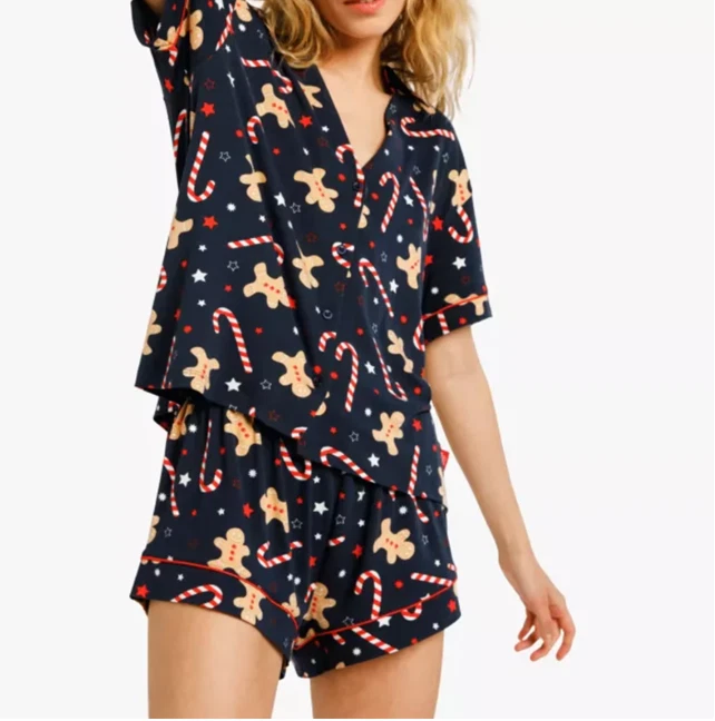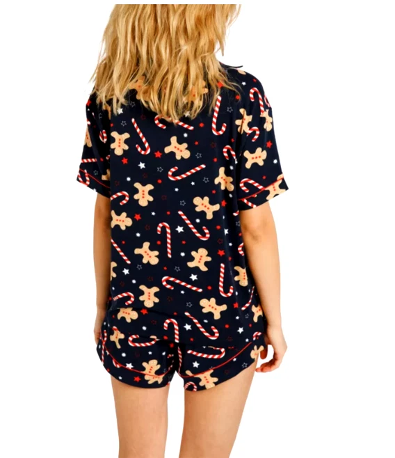 Celebrate the holiday season in comfort and style with this festive Women’s 2-Piece Christmas Pajama Set ! Featuring an adorable gingerbread man print, this set includes a short-sleeve button-up shirt and matching shorts, perfect for cozy sleepwear or lounging during the holidays. Festive Design: Features a cute and playful gingerbread man print, perfect for getting into the Christmas spirit. Comfortable Material: Made from soft, breathable fabric that’s gentle on the skin and ideal for restful nights. Short-Sleeve Button-Up Shirt: Classic design with a relaxed fit for easy wear and holiday charm. Matching Shorts: Elastic waistband ensures a secure yet comfortable fit for lounging or sleeping. Versatile & Stylish: Perfect for holiday mornings, Christmas parties, or as a thoughtful seasonal gift. Sizing: Fits a US 4-8 best, depending on how you would like it to fit.