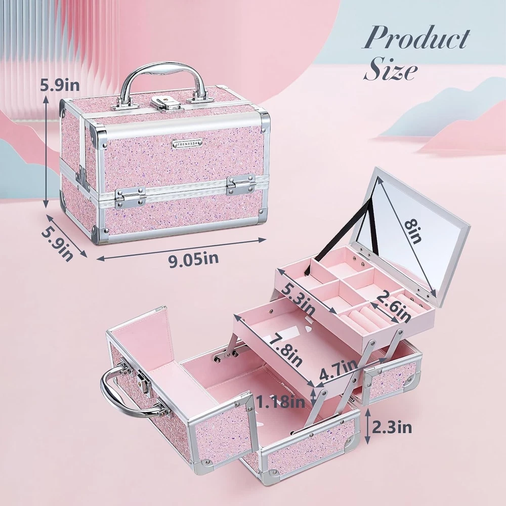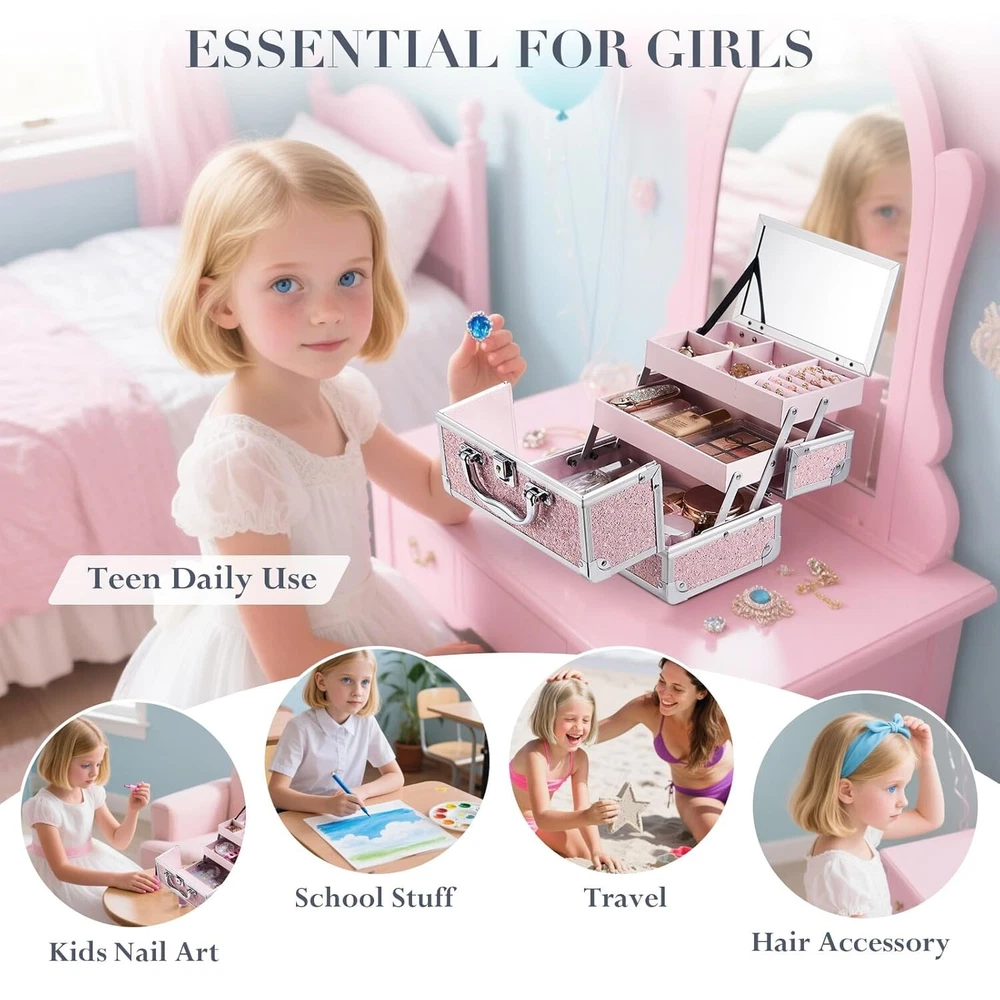 Girls' Shiny Pink Makeup Organizer - Portable, Lockable with Mirror & Trays ‹ › ‹ › ‹ › ‹ › ‹ › ‹ › ‹ › ‹ › ‹ › ‹ › Girls' Shiny Pink Makeup Organizer Elevate the beauty experience for your little princess with our chic and portable Shiny Pink Makeup Organizer. Perfectly sized at 9 inches x 6 inches x 6 inches , this elegant train case is not just a makeup box; it’s a treasure chest for her imagination, ideal for slumber parties or hosting a delightful play spa day. Key Features: Durable Design: Made from high-quality ABS with aluminum accents and reinforced metal corners for enduring style and lightweight functionality. Organized Storage: Multi-functional layout with four compartments for earrings, a dedicated ring case, and two tiered, stain-proof trays for all her makeup essentials. Convenient Mirror: Features an extendable cantilever design with a built-in mirror, allowing her to view all her favorite items at a glance while getting ready. Lockable and Portable: Designed with a generous, non-slip handle, this makeup organizer is easy to carry. The lockable mechanism with key ensures her cosmetics are protected and secure. Travel Ready: Compact and easy to store, making it the perfect companion for refreshing her look anytime, anywhere. Why Choose Our Makeup Organizer? This Shiny Pink Makeup Organizer is more than just a case; it embodies creativity, organization, and style. The combination of portability and durability means your little girl can take her essentials wherever she goes, while the thoughtful compartments keep her treasures tidy. The lockable feature adds an important level of security for her beloved collection, giving peace of mind for parents and empowering independence for her. The Perfect Gift: This elegant makeup case makes for a delightful gift for birthday parties, summer holidays, sleepovers, or makeovers! It’s perfect as a party favor, stocking stuffer, or back-to-school surprise. Encourage a passion for beauty and creativity with this stunning organizer! Order the Girls' Shiny Pink Makeup Organizer today and let her beauty shine wherever she goes! Shipping Free & Fast Shipping - We offer free shipping to most of the USA with a normal delivery time of 3-7 days. However, due to the current situation, additional delivery time (up to 3 weeks) may be required for some items. Alternative Carriers - We may use alternative carriers (e.g. USPS, FedEx, UPS, etc.) to ensure your package arrives safely and on time. Due to the use of multiple carriers, we are unable to provide a tracking number automatically. Handling Time - Orders are processed and shipped within 1-2 business days of receiving cleared payment. Shipping Restrictions - Shipping to Alaska, Hawaii, Puerto Rico, Guam, and other US territories may incur shipping charges or delivery restrictions. Please contact us before ordering, or your order can be refunded/cancelled. State Restrictions - There may be restrictions based on your state of purchase. For example, certain items may not be shipped to California due to state regulations. Contact for Tracking Updates - If you require tracking updates or have any concerns about the delivery of your order, please feel free to contact us, and we will be happy to assist you. Return 30-Day Hassle-Free Returns - We want you to be completely satisfied with your purchase. If you are not, you can return the item within 30 days of receiving it for a full refund or exchange. Easy Return Process - To start a return, simply contact us and we will provide you with a prepaid return shipping label and detailed instructions. Restocking Fee - There are no restocking fees for returns. However, the buyer is responsible for return shipping costs if the return is not due to a seller's error. Refund Processing Time - Refunds will be processed within 5 business days of receiving the returned item in its condition. Payment We accept all major credit cards, PayPal, and Apple Pay for your convenience. Your payment information is secure and encrypted to ensure a safe and seamless transaction. Please complete your payment within 3 days of purchase to avoid any delays in shipping. Feedback Your feedback is extremely important to us. We strive to provide the best products and customer service possible. If you are satisfied with your purchase, please take a moment to leave us a positive review. If you have any concerns or issues with your order, please contact us before leaving negative feedback. We are committed to resolving any problems and ensuring your satisfaction. Contact Us If you have any questions or concerns, please feel free to out to our customer support team. You can contact us through the eBay messaging system. We are available Monday to Friday, 9:00 am to 5:00 pm EST, and we will do our best to respond to your inquiry within 24 hours. Buy it now and enjoy a pleasant shopping experience! Model: Makeup Case Organizer Unit Quantity: 2.2 Material: Aluminum,Metal,Plastic,ABS Features: Heavy-Duty,Mirror,Tiered,Portable,Lockable Type: Makeup Case Color: Pink Item Weight: 2.2 lb Unit Type: lb