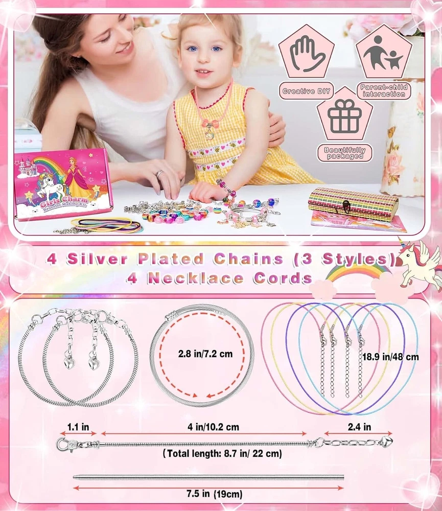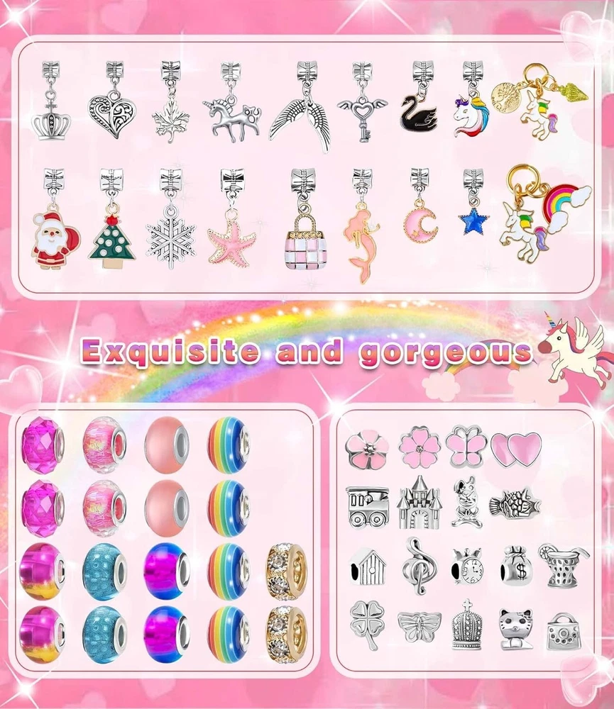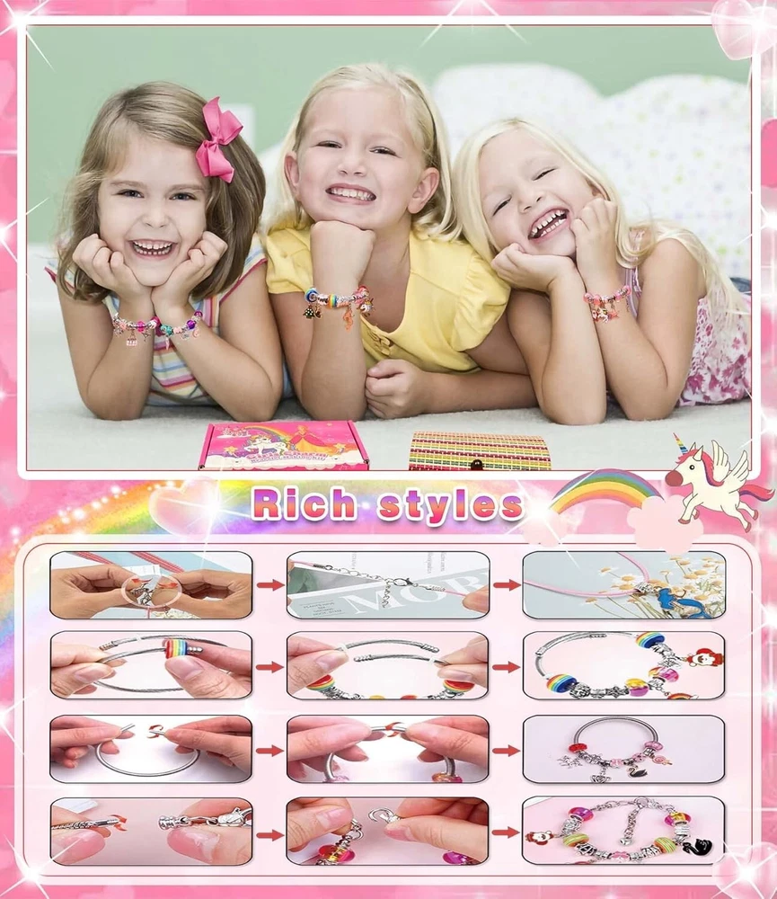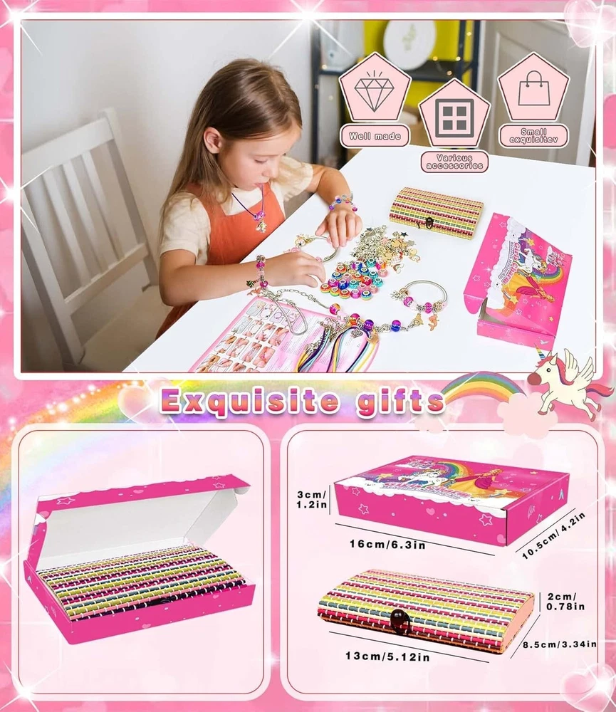 Girls Toys Age 6-12 Gifts for 5 6 7 8 9 10 Year Old Girls Arts and Crafts New Color: Colorful unicorn beautiful bracelet Bracelet making kit for girls kids: 4 necklace cords, 10 colored bead, 4 colored glass beads, 4 rainbow beads, 18 large hole metal beads, 18 pendants, 2 silver plated chains, 1 stainless steel bracelet, 1 spring bracelet, 1 User manual, 1 color wooden box. The colorful accessories can let girls match. Can let them match out four different styles of bracelets and four necklaces, jewelry making kit, girls gifts 8-12 years old. Exquisite Christmas gifts. Girls toys. Girls gifts 6 7 8 9 10 11 12 years old: unique color box design, exquisite color wooden boxes, beautiful accessories, beautiful bracelets and necklaces Cords. These are beautiful girls' Christmas gifts, birthday gifts, party gifts, children's day gifts, bracelet making gifts for girls kids teens. Gifts for Teen Girls. Perfect gift for girls kids age 5-12. Crafts for kids 6-8. Teenager gifts for girls. Quick collocation of beautiful bracelets: Beautiful bracelets in three styles. Bracelet with heart-shaped lobster clasp: just rotate and screw out the lobster clasp, and install accessories such as pendants into the bracelet. Stainless steel bracelet: just put accessories into it. Spring bracelet: rotate and unscrew the spring, install the accessories, and then rotate the spring again to complete. Charm Bracelet Making Kit for Girls. Toy for girls age 8-12. Gifts for Girls Kids Teens. Exquisite color box and wooden box: Exquisite unicorn color box and colorful wooden storage box are the best gifts for girls, and also convenient for storing accessories. Kids Jewelry Making Kits is a beautiful Christmas gift and birthday gift. Girls toys age 5 6 7 8 9 10 11. Gifts for teenage girls. Gifts for 6 7 8 9 10 11 year olds girls. Teenage girls gifts. Toys for 6-12 year olds girls. Toys for girls. Arts and crafts for girls kids ages 5 6 7 8 9 10 11 12: Colorful pendants and exquisite colored beads can let girls match beautiful bracelets and necklaces, Like a beautiful handicraft. Kids' craft kits. Crafts for Girls Ages 8-12. DIY Craft for Girls. Crafts for kids 6-8. Christmas gifts for kids. Teen girls gift ideas. Craft kits for girls age 8-10. Bracelet making kit for girls. Girls toys age 6 7 8 9 10 11.