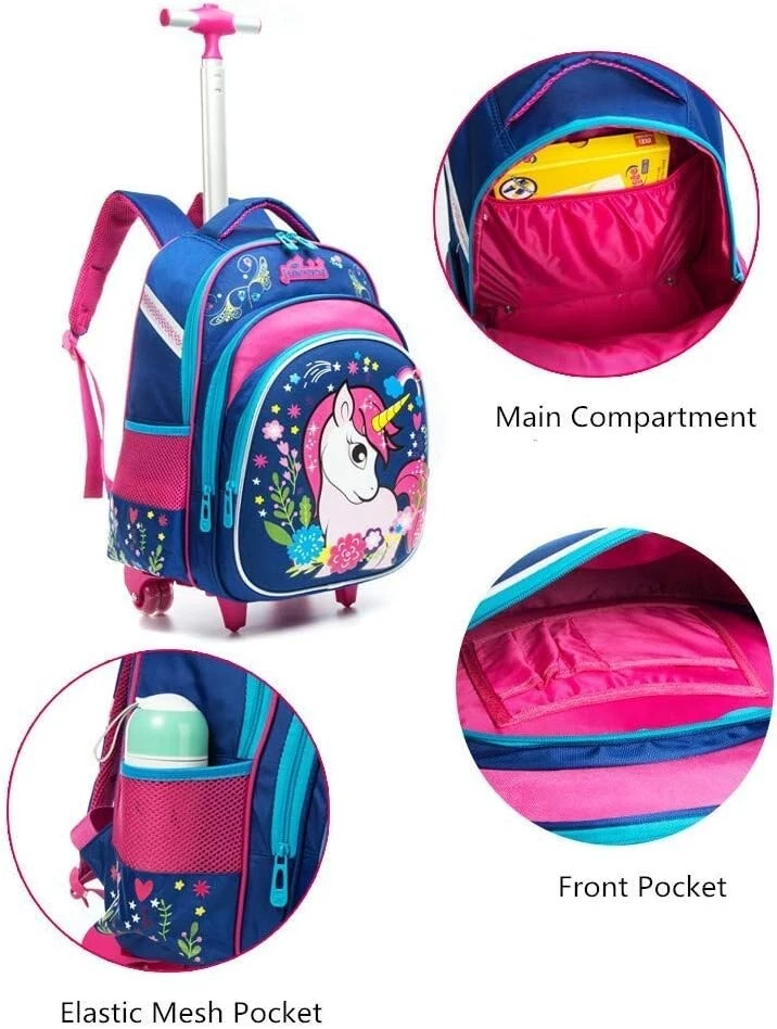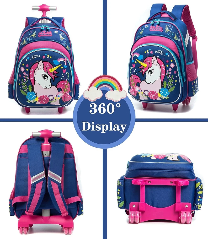 Girls Unicorn Rolling Backpacks Kids Backpack with Wheels for Girls School Bags with Lunch Box 3 in 1 Kids Rolling Backpack """,lunch bag:9""",pencil """,highest height of trolley is ";Multi-function for kids,as a luggage to reduce load,or as a backpack,or a handbag with a handle on the top of backpack. Girls unicorn rolling backpack capacity:1 large main pocket adopt with 1 laptop compartment;2 zipper front pockets for IPAD/A4 size items;2 mesh pockets for water bottles;1 special pencil case which can hung on the backpack;1 lunch bag with adjustable straps which can be as shoulder bag or a handle bag. Unicorn school bags details:Noiseless 4 wheels design with high-strength aluminum alloy rod,front pocket adopt EVA material. Kids backpack quality:Nylon material made,designed breathable back and padded shoulder Straps,they greatly reduced the the pressure in the back and rod and the bag can't be removed ,please note) No matter you are teen girls,boys,go to school,outside sports,or a travel,you can choose one to used in any place you want to carry your laptop,books, for Primary school students 3 in 1 girls unicorn rolling backpack will bring happiness to your kids!Backpack """,lunch bag:9""",pencil """;Highest height of trolley is ";Multi-function for kids,as a luggage to reduce load,or as a backpack,or a handbag with a handle on the top of backpack.