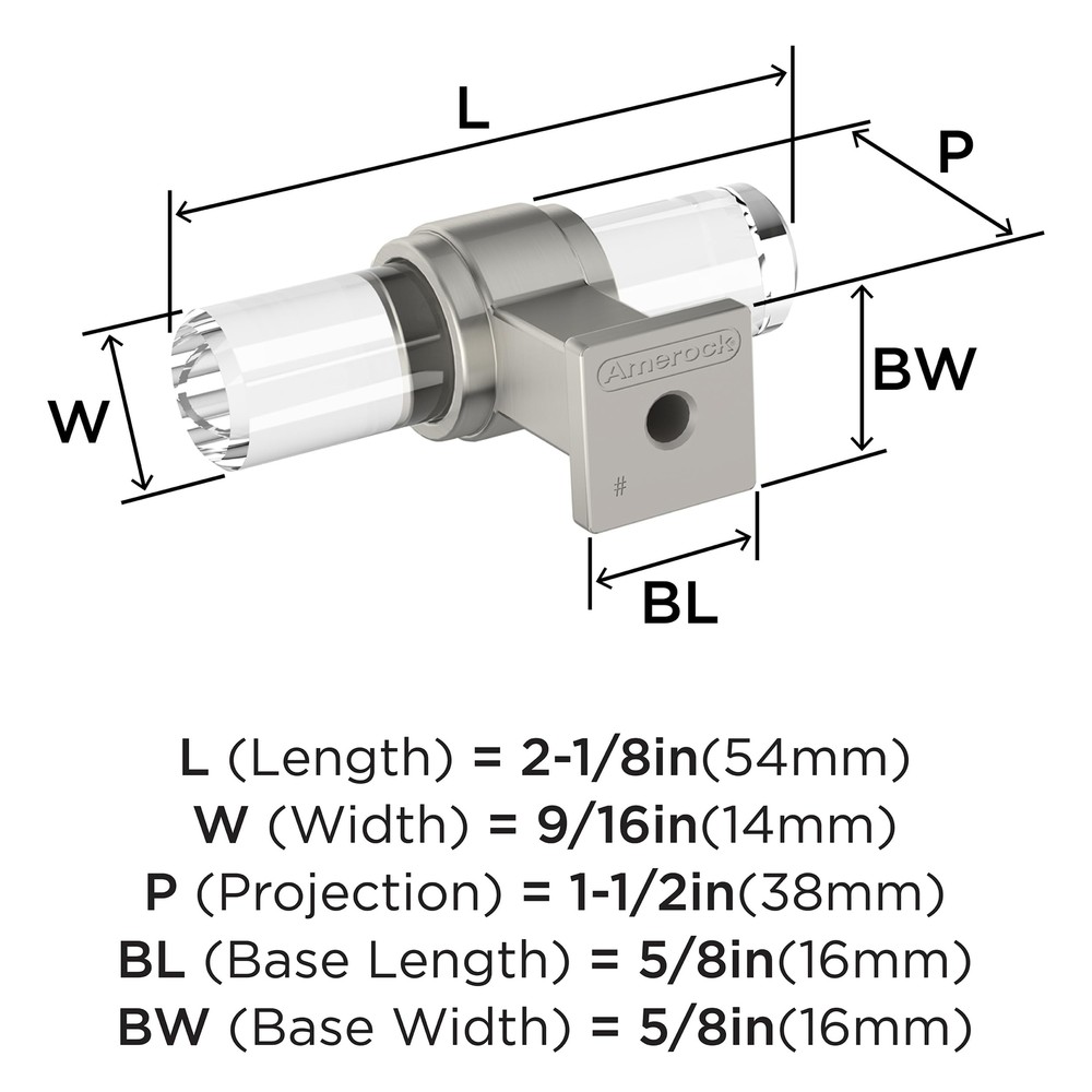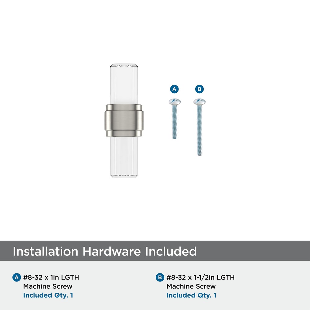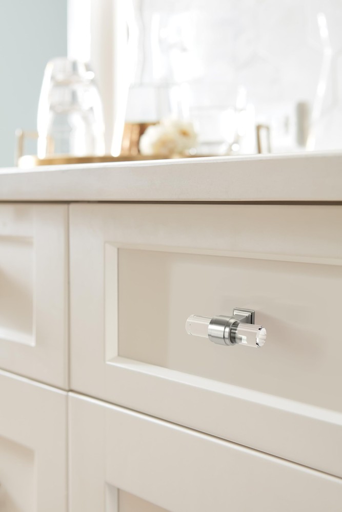The BP36977CG10 Glacio 2-1/8 inch (54mm) Length Knob is finished in Clear/Satin Nickel. In the Glacio collection, graceful metallic mountings hold clear accents that seem to float above the surface for an ethereal look and feel. Enduring and versatile, ’s satin nickel marries delicate brushing with a subtle warm hue to produce an approachable, classic presentation that resonates across all design styles. Founded in 1928, ’s award-winning home solutions including decorative and functional cabinet hardware, bath accessories, decorative hooks and wall plates have built the company’s reputation for chic design accessories that inspire homeowners to express their personal style. offers a variety of styles and finishes at affordable prices that add the perfect finishing touch to any room. VERSATILE - Contemporary style adds an easy designer upgrade to any cabinet drawer, cabinet door or furniture piece DURABLE - High quality /glass construction for lifelong durability CONVENIENT - Mounting hardware included for quick and easy installation - Coordinates seamlessly with finishes from popular plumbing and lighting brands DISCLAIMER - We do our best to show colors accurately, but they might look different on your screen due to individual monitor settings