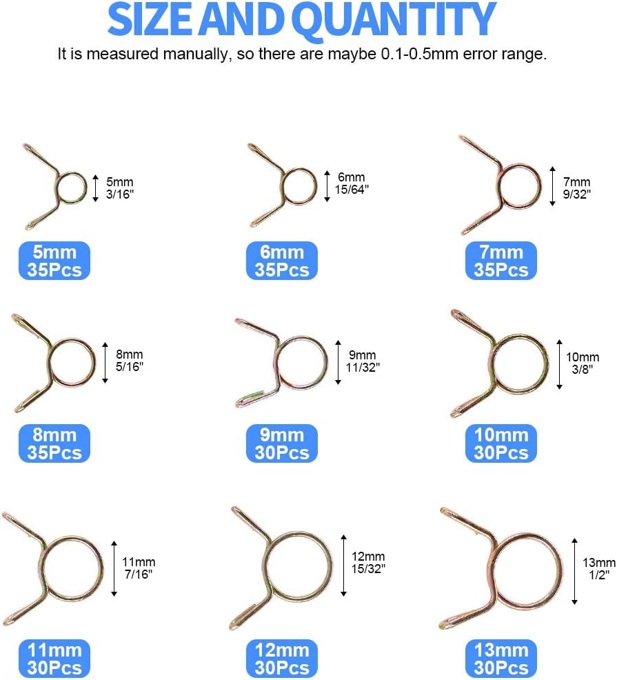 Glarks 290Pcs Fuel Line Hose Water Pipe Air Tubing Spring Clips Clamps Bronze Product Details Material: Spring Steel Brand: Glarks Color: Bronze Style: Clamp Item Weight: 249 Grams Manufacturer: Glarks Part Number: GLLADGSHG-290 Item Weight: 8.8 ounces Package Dimensions: 7.76 x 5.43 x 0.67 inches Item model number: GLLADGSHG-290 Is Discontinued By Manufacturer: No Item Package Quantity: 1 Batteries Included?: No Batteries Required?: No Material: Spring Steel Brand: Glarks Color: Bronze Style: Clamp Item Weight: 249 Grams Manufacturer: Glarks ☆【Product Type:】High quality fuel line hose tubing spring clips clamps assortment kit. ☆【Wide Hose Clamp Size:】 In this set, we provide 9 size of hose clamps which are 35pcs 5mm, 35pcs 6mm, 35pcs 7mm, 35pcs 8mm, 30pcs 9mm, 30pcs 10mm, 30pcs 11mm, 30pcs 12mm, 30pcs 13mm, total 290pcs packed in a plastic box, easy to storage and carry. ☆【Durable Quality:】 All the hose clamps are made of spring steel 65Mn, with zinc plated on the surface, corrosion and rust resistant, durable enough not easy to break. ☆【Save Time and Money:】These fuel injection line style hose clamps are polished smooth to avoid damage to the hose, excellent for sealing hoses against loss of liquid, saving your time and money on costly repairs the pipe. ☆【Function and Use:】These clamps are locking secure and tight, widely used in most motorcycles, boats, ATVs, snowmobiles gas tubing pipes. Glarks 290Pcs Fuel Line Hose Water Pipe Air Tubing Spring Clips Clamps Assortment Kit 『Specifications:』 ✔ Product Type: Spring clips clamp ✔ Material: 65Mn Spring Steel, Zinc Plated ✔ Main Color: Bronze Tone ✔ Inner Diameter Included: 5mm, 6mm, 7mm, 8mm, 9mm, 10mm,11mm, 12mm, 13mm 『Feature:』 ☛ Made of spring steel 65Mn, durable enough not easy to break. ☛ Smooth surface finish can avoid damage to the hose, excellent for sealing hoses against loss of liquid. ☛ Perfect used in most motorcycles, boats, ATVs, snowmobiles and all kinds of gas tubing pipes. 『Package Detail:』 - 5mm ------------- 35pcs - 6mm ------------- 35pcs - 7mm ------------- 35pcs - 8mm ------------- 35pcs - 9mm ------------- 30pcs - 10mm ----------- 30pcs - 11mm ----------- 30pcs - 12mm ----------- 30pcs - 13mm ----------- 30pcs Total Quanyity: 290Pcs 【Note】: ♥ Please check the specific size of the product according to the second picture. Due to manual measurement, there may be errors, please don't mind. ♥ If you have any questions, please feel free to contact us and we will try our best to help you.