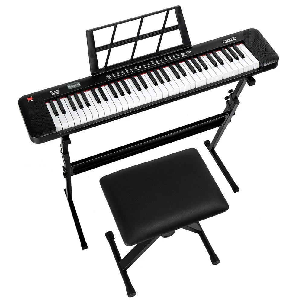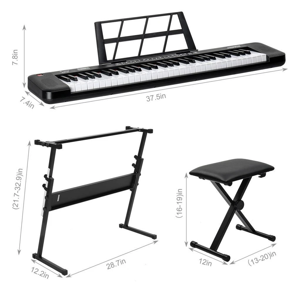 Introductions: Glarry GEP-109 61 Key Lighting Keyboard complete with 200 timbres, 200 rhythms, 60 demo songs and LED display with 3 teaching modes(Single-finger; Follow; Concert), it's perfect instrument for a beginning player. Complete with built-in two stereo speakers provide excellent sound quality, At the same time we also give away one headphone so you don't worry will disturb others' relax when you are playing. Features: 1. 61 Piano-Styled Keys/LED Display 2. 200 timbres, 200 rhythms, 60 demo songs 3. 3 digit LED digital display 4. 2 ways to power: DC 5V or 4 pcs AA batteries (not included) 5. Record/Program/Playback/Sustain/Chord/Sync/Start/Stop 6. Double keyboard: When the function of this key is On, the key will be played as C4-B5 in the scale of C3-B4, and C5-C8 will be played as C4-C7 Friendly reminder::Remember to take out of the AC adapter and Mic from the foam Specifications: Brand:Glarry Model:GEP-109 Keyboard Color: Black Suitable for keyboard piano players both Adults and Children Material: Non-toxic environmental protection PVC Piano Keyboard Dimensions:37.4 in x 7.67 in x 2.55in Piano Set Gross Weight: 20.46 lbs/ 9.3kg Piano Net Weight:4.4lbs/ 2kg Piano Stand Weight: 4.18 lbs/ 1.9kg Piano Bench Weight: 5.94 lbs/ 2.7kg Keyboard Number of keys: 61 Key Keyboard width:0.78 in Metronome:1/4, 2/4, 3/4, 4/4 Split keyboard Control: 24 keys in left hand, 37 keys in right hand Sustain: Yes Vibrato: Yes Sounds Polyphony (max): 8-note Demo Songs:60 Rhythm:200 Timbre:200 Accompaniment styles: Not applicable Connectivity USB Connectivity: NO Bluetooth: No Recording: Yes Playback: Yes MIDI Connectivity: No Teaching Modes :Single-finger; Follow; Concert Headphone Jacks: 1 (1/8" jack) Microphone Jacks 1 (1/8" jack) Display: Backlight LED Built-in Speakers: Yes (2 X 3W ) Power: Adapter included DC 5V Batteries: Applicable, 4 pcs AA batteries (not included) Package Includes: 1 x Keyboard 1 x Headphone 1 x Microphone 1 x Music Rest 1 x Power Adapter 1 x Piano Stand 1 x Piano Bench 1 x Manual