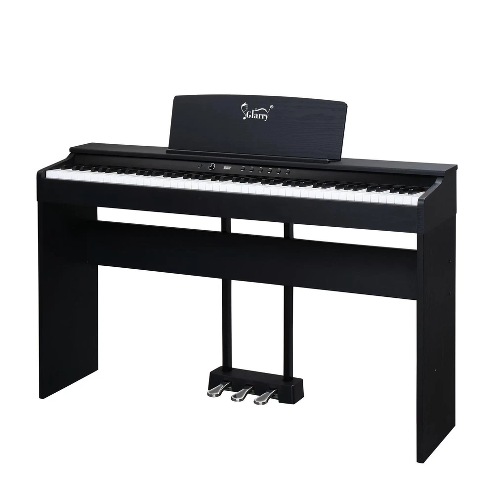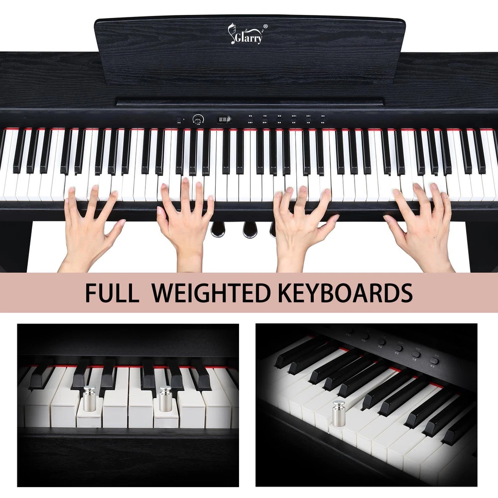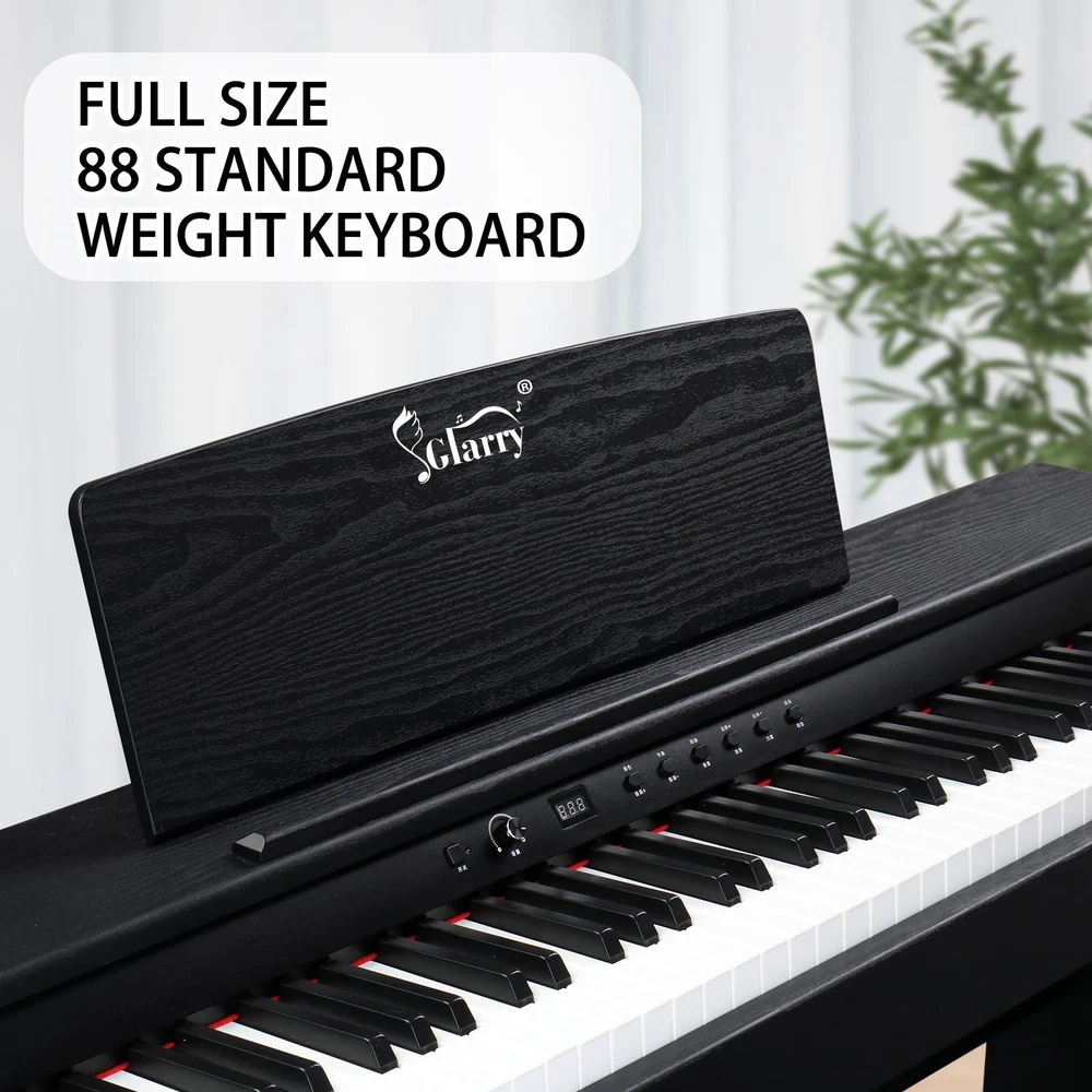 listing template VISIT OUR STORE SIGH UP FOR EMAIL Glarry 88 Keys Full Weighted Keyboards Digital Piano With Cover & Music Stand GDP-104 / GDP-815 GDP-104 GDP-815 GDP-105/8816A Introductions: Glarry 88 Keys Digital Piano Full Weighted Keyboards adopts the High Quality DREAM sound source, digital sampling, has 3 Pedal System (Soft/Sustain/Sostenuto Pedal), which can bring you the most striking sound effects. At the same time we have functions: Metronome, Touch/transpose control, Split/Touch Control, Volume Control, USB, Midi input/output, Record/Play, Audio input/output. Through the connection of Midi input and APP, you can realize the follow-up function, easy for beginners to learn. Our 88 key piano with two Dual Bluetooth, Audio Bluetooth and MIDI Bluetooth. Connect a COMPUTER or tablet with a USB cable for multimedia interaction. After the piano is turned on, Bluetooth will be automatically turned on. The mobile phone can search the MIDI Bluetooth signal of this piano. After the connection, the playing software on the mobile phone can realize the wireless connection with the piano. Features: 1. High Quality DREAM sound source 2. 64 Polyphony/ 20 Demo Songs/ 128 Rhythm/ 128 Timbre 3. Built-in two 10W Stereo Speakers 4. 3 Pedal System: Soft pedal-Soften the tone; Sustain pedal-Continuously increasing lengths of sustained notes, from slight to full; Sostenuto pedal-Press the pedal halfway down to get a partial damper effect 5. Dual Bluetooth, Audio Bluetooth and MIDI Bluetooth. Connect a COMPUTER or tablet with a USB cable for multimedia interaction 6. After the piano is turned on, bluetooth will be automatically turned on. The mobile phone can search the MIDI Bluetooth signal of this piano. After the connection, the playing software on the mobile phone can realize the wireless connection with the piano Specifications: Brand: Glarry Piano Color: Black Piano Dimensions: 49.4 in x 12.79 in x 27.95 in Package Dimensions: 52.36 in x 16.33 in x 11.61 in Package Weight: 58.3 lbs / 26.5kg Model: GDP-104 Keyboard Number of Keys: 88 Key (A1-C9) Action: Full Weighted Action Key Type: Piano-style Metronome: Yes Touch/transpose Control: Yes Split/Touch Control: Yes Sounds Sound Source: High Quality DREAM sound source Polyphony (max): 64-note Demo Songs: 20 Rhythm: 128 Timbre: 128 Connectivity MIDI Connectivity: MIDI over USB Bluetooth: Audio Bluetooth and MIDI Bluetooth USB Connectivity: NO Recording: Yes Headphone Jacks: 1 (1/8" Jack) Pedal Inputs: 3 Storage Type: Internal (64M 16M) Expandability Available: No AUX Input: Yes Line Output: Yes Line Input: Yes Onboard Features Recording/Playback MIDI Sequencer Accompaniment Styles: Comprehensive Chord Accompaniment Preset Songs: 20 Display: Backlight LED Built-in Speakers: Yes (2* 10W) Package Includes: 1 x Digital Piano 1 x Power Adapter 1 x Triple Pedals 1 x Headphone 1 x Headphone Adapter 1 x USB Cable 1 x Android Cable 1 x Piano Cloth 1 x Piano Cover 1 x Keyboard Sticker 1 x Music Clip 1 x Screwdriver, Screw Accessories and Manual Glarry GDP-105/8816A Features: 1. European custom Dream Sound source 2. 64 Polyphony/ 128 Demo Songs/ 128 Rhythm/ 380 Timbre 3. Built-in two 20 W Stereo Speakers 4. 3 Pedal System:Soft pedal-Soften the tone;Sustain pedal-Continuously increasing lengths of sustained notes,from slight to full;Sostenuto pedal-Press the pedal halfway down to get a partial damper effect 5. Dual Bluetooth,Audio Bluetooth and MIDI Bluetooth,Connect a COMPUTER or tablet with a USB cable for multimedia interaction. 6. After the piano is turned on, bluetooth will be automatically turned on. The mobile phone can search the MIDI Bluetooth signal of this piano. After the connection, the playing software on the mobile phone can realize the wireless connection with the piano. 7. Supports Cubase,FI Studio,Logic,Live ect. arrangement software Specifications: Brand:Glarry Piano Color: Black Piano Dimensions:50 in x 12.79 in x 30.51in (without music stand) Piano Dimensions:50 in x 12.79 in x 38.14in (with music stand) Keyboard key Dimensions: Black key width 0.41in, press depth 0.37in; White key width is 0.866in and the press depth is 0.43in Package Dimensions:52.95 in x 16.92 in x 11.81 in Package Weight: 66 lbs/ 30kg Model:GDP-105 Keyboard Number of keys: 88 Key (A1-C9) Action: Full Standard Weighted Action Key Type: Piano-style Metronome:Yes Touch/transpose control: Yes Split/Touch Control: Yes Sounds Sound Source: European custom Dream Sound source Polyphony (max): 64-note Demo Songs:128 Rhythm:128 Timbre:380 Connectivity MIDI Connectivity: MIDI over USB Bluetooth:Audio Bluetooth and MIDI Bluetooth USB MIDI Connectivity: Yes Recording:Yes Headphone Jacks: 1 (1/8" Jack) 3 Pedal inputs: Soft/Sustain/Sostenuto Pedal Storage type: RAM 64KB,FLASH 128M Expandability Available: No AUX Input: Yes Line Output: Yes Line Input: Yes Onboard Features Recording/Playback MIDI Sequencer Accompaniment Styles: Comprehensive Chord Accompaniment Preset Songs: 128 Display: Backlight LED Built-in speakers: Yes (2* 20W) Package Includes: 1 x Digital Piano 1 x Power Adapter 1 x Triple Pedals 1 x Headphone 1 x Headphone Adapters 1 x USB Cable 1 x Android Cable 1 x Piano Cloth 1 x Piano Cover 1 x Keyboard Sticker 1 x Music Clip 1 x Screwdriver , Screw Accessories And Manual You might like this more>> Portable Princess Castle Play House Blue Large Kids Play Tent $23.79 Double Shoe Rack Closet Shelf Storage Organizer $19.49 Oil Painting Easel Sketch Box Portable Folding $57.49 FCH L-Shaped Corner Computer Desk Home Office Desk $109.99 10 Tier Durable Storage Organizer 30 Pair Shoe Tower $18.99 24 Slots PU Leather Wrist Watch Box Display Case Organizer $16.99 Shipping Policy 1. Ship from New Jersey by Standard Int'l Shipping, and only to VERIFIED PAYPAL ADDRESS . 2.International Buyers – Please Note: a. Import duties, taxes and charges are not included in the item price or shipping charges. These charges are the buyer’s responsibility. b. Please check with your country’s cust
