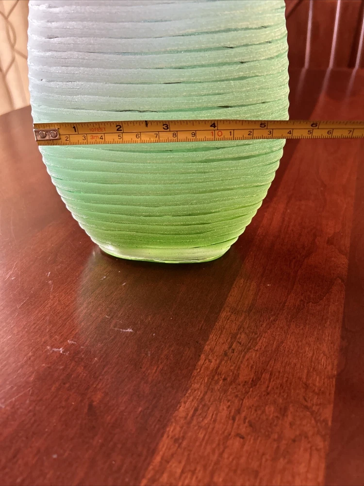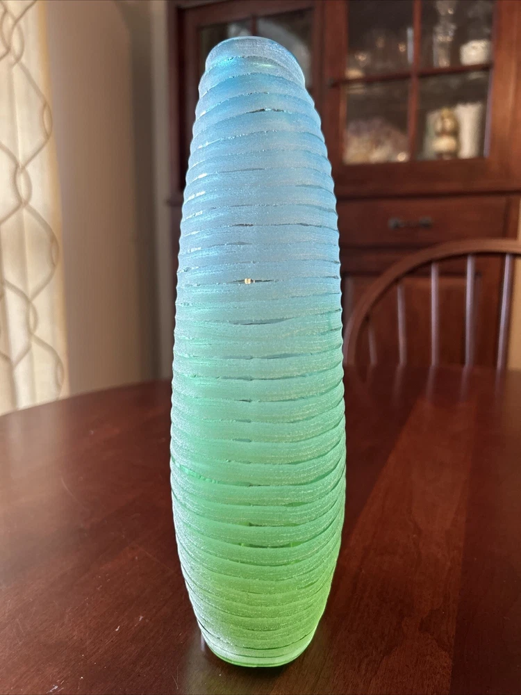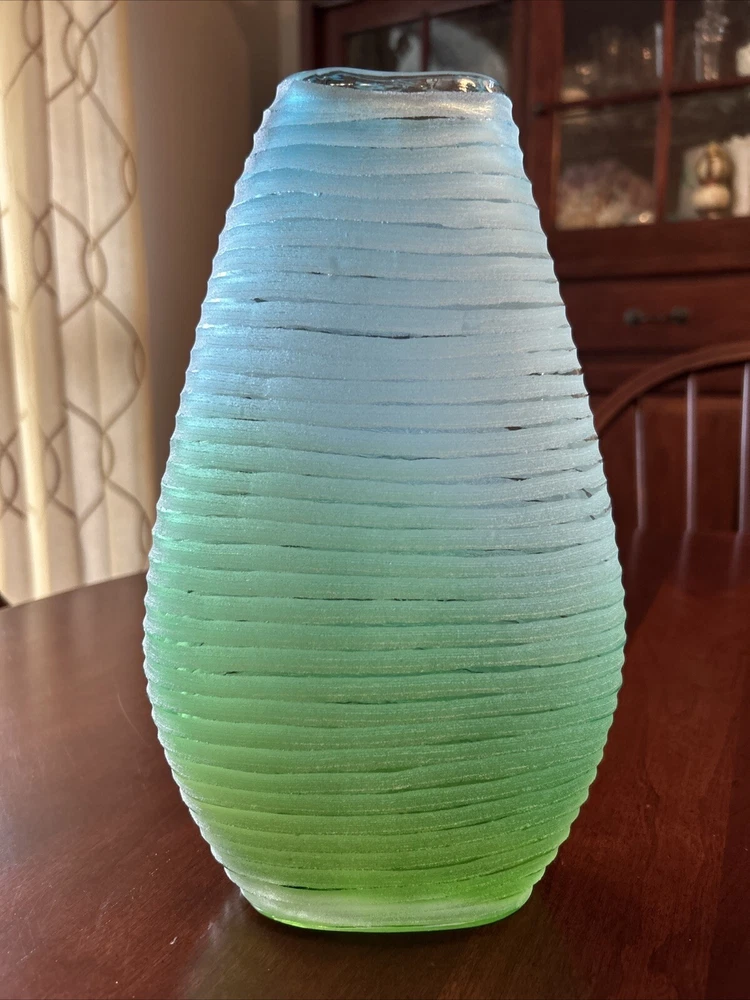 Crafted with attention to detail, this glass vase would be an attractive element to a beach themed space. Its layered glass pattern has an ombre effect, fading gracefully from a rich green to a serene blue. The frosted sandblasted finish adds a tactile dimension to the piece, making it a standout decorative item for any space. The vase stands 10.5 inches in height and measures 6 inches in width, providing a substantial and elegant canvas for your favorite blooms or as a standalone statement piece. This piece blends seamlessly with a variety of decor styles, bringing a touch of coastal charm to your home.