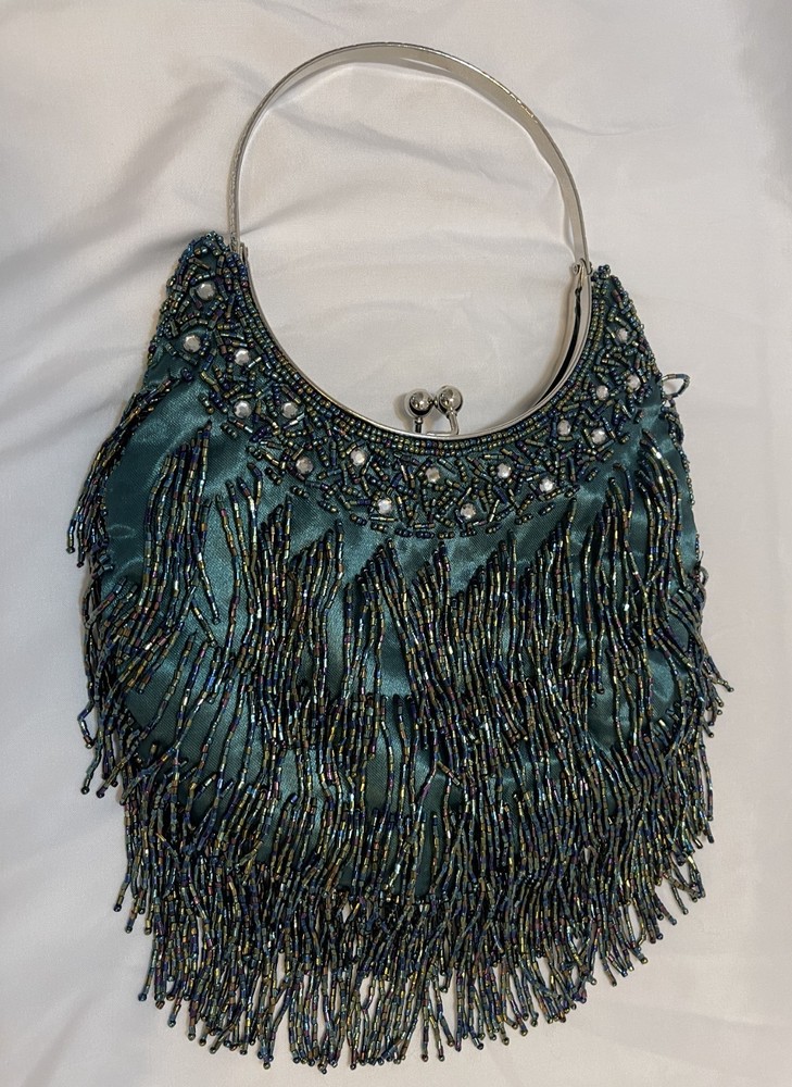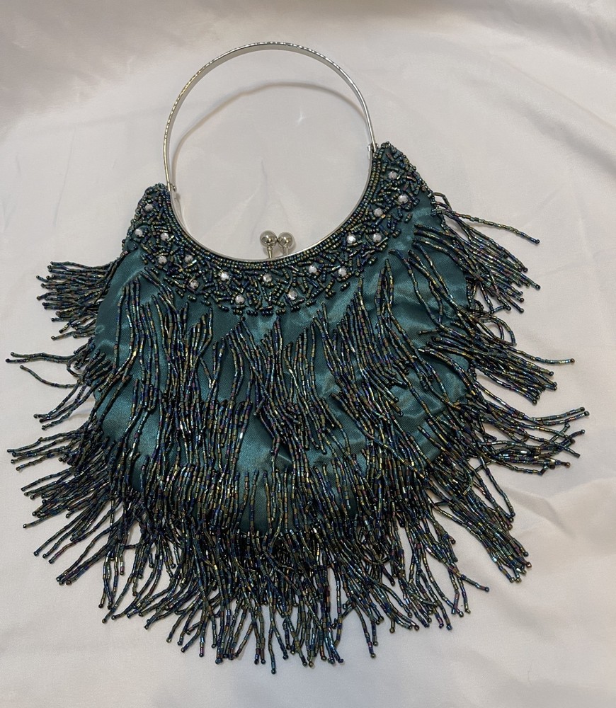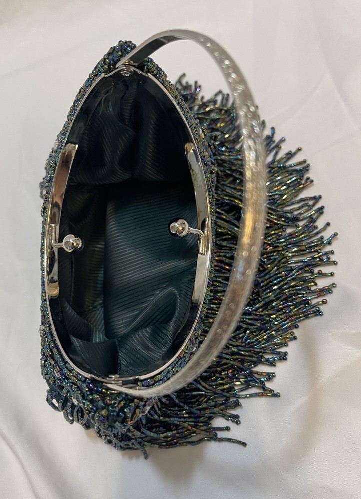Stunning satin turquoise hand-beaded peacock fringe purse with round metal handle and jewel embellishments. Silver frame evening bag with round handle and kiss clasp closure. Turquoise satin lining with pocket. Approximate size is 14 x 10 x 2 inches