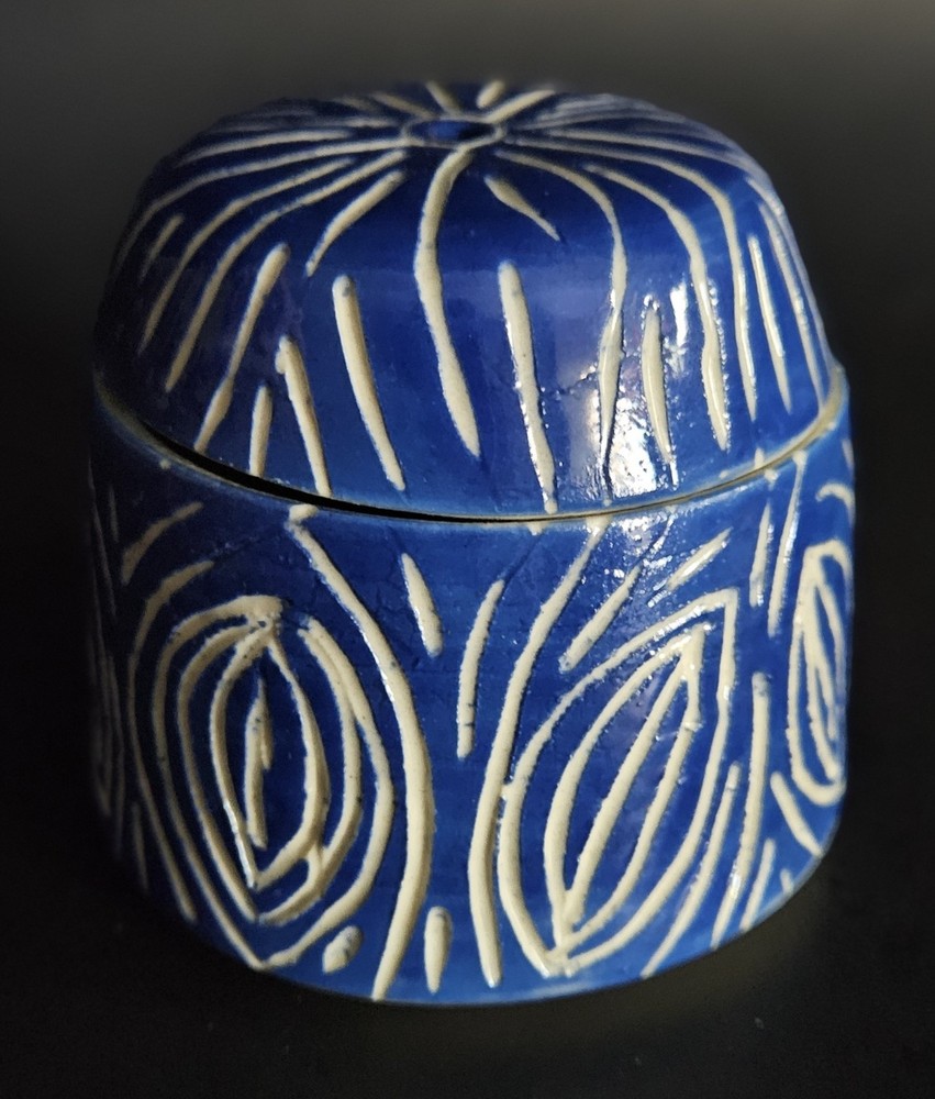 Handmade, hand carved artisan teinket/ keepsake box with lid. 2.5"H x 2.5"W at base. No chips, cracks or damage. Excellent condition. Signed LRT 2009 on bottom.