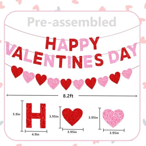 30 Days Return Policy Fast Delivery Trusted seller Glitter Happy Valentines Day Banner Party Decorations,with Shiny Heart Banner & Red Pink Heart Swirls Balloons Set,for Home Indoor Valentines Day Party Decor Supplies Product Description Package:1pc glitter HAPPY VALENTINES DAY banner,1pc glitter heart banner,10pcs pre-strung heart swirls with glitter red pink heart cutouts,4pcs heart balloons Pre-assembled: NO DIY ! Valentine banners and hanging heart decorations are pre-assembled and ready to use,which can save your time and effort during the process of party preparation Sturdy Shiny Materials: Reusable.Happy valentine's Day party decorations set are made of glitter sturdy cardstock. Sufficient hardness to maintain good plasticity.Enough to be reused many times and they fold up for easy storage Large Size: 8.2Ft valentines day banner and heart banner, 18inch red heart balloons, heart swils cutout 5.9 x 5.9 inch. You can hang heart decorations on above the room ceiling/wall/table/fireplace/blackboard Wide Applications:This romantic valentines day banner will add to romantic decorations for special night.Can be used for Valentine's Day party decor, anniversary! Show your love with our elegant love heart banners hanging swirls decorations for office home classroom Shipping Returns Payment Shipping Shipping is FREE to all addresses other than APO/PO boxes in the lower 48 states. All our stock ships from US-based warehouses. Shipped via USPS or UPS (depending on location and package weight) Unless stated otherwise, all orders will ship within 24-72 hours of your payment being processed. Check our feedback to see the great reviews of FAST shipping we offer. Returns As our valued customer, we will do our best to make sure the product you receive arrives to you on time and as expected. If you are not satisfied with your purchase, please contact us within 30 days of receiving your order to process a return. Payment We currently accept payment via eBay managed payments only. Once payment is cleared, we will dispatch your shipment within 1-3 business days. Please refer to the "Shipping" tab for more information regarding shipping speed to your destination.