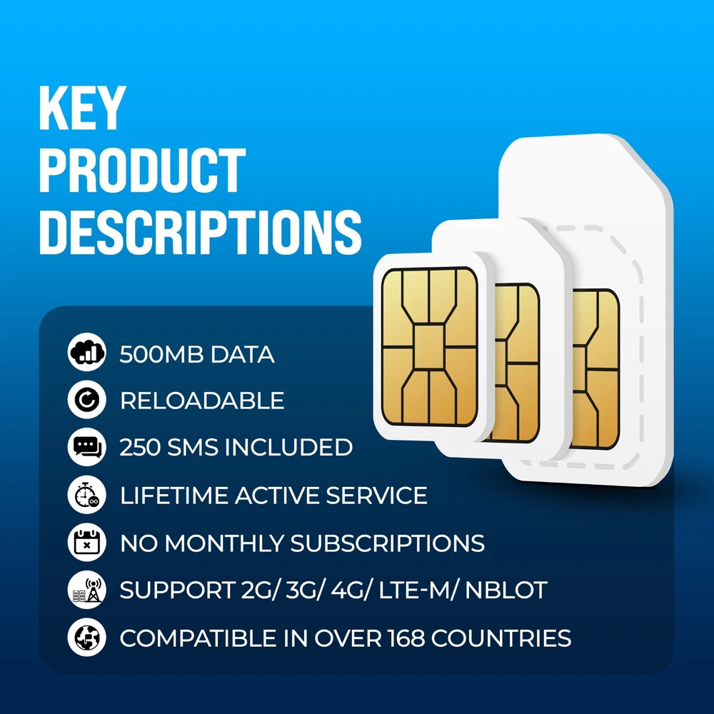 Purchase includes SIM card & prepaid active service for 5+ years. For use with IoT devices only. Simplify your IoT connectivity with the Global IoT SIM Card , designed for seamless and cost-effective operation worldwide. Ideal for smart devices, tracking systems, IoT sensors, and more, this SIM card delivers reliable connectivity without the hassle of monthly subscriptions. Key Features: Lifetime Active Service : Stay connected without worrying about expiration dates or renewal deadlines. No Monthly Subscriptions : Pay once and enjoy peace of mind with no recurring fees. 500MB of Data Included : Perfect for IoT applications, ensuring your devices stay online and operational. 250 SMS Included : Enable essential messaging features for your IoT devices. Global Compatibility : Works in 168+ countries , ensuring your devices remain connected, wherever they are. Multi-Network Support : Compatible with 2G, 3G, 4G, LTE-M, and NB-IoT , providing unmatched flexibility and performance. Reloadable : Need more data or SMS? Easily reload your SIM for uninterrupted connectivity. Why Choose This SIM Card? Designed with the Internet of Things in mind, this SIM card ensures reliable and global connectivity for a wide range of applications, from smart homes to industrial monitoring systems. Whether you’re managing fleet tracking devices or building smart city infrastructure, our SIM card offers the perfect solution for your needs. Get Connected Today! Say goodbye to the hassle of multiple SIM cards or expensive data plans. Experience the ultimate convenience and value with the Global IoT SIM Card. Perfect for your connected world, no matter where you are.