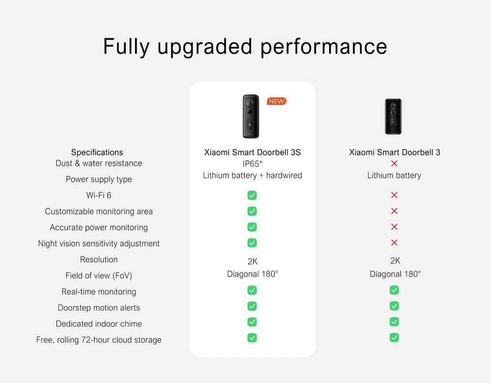 Xiaomi Smart Doorbell 3S Main Features ● Ultra-clear 2K resolution With a 3MP (2048×1536) resolution,it is more detailed than a 1080p doorbell. ● See more with the diagonal 180° ultra-wide view The new-generation ultra-wide camera increases the vertical angle to 107°, to ensure clear, panoramic monitoring of the entire area in front of the door. ● IP65 Weather Resistance An IP65 rating keeps reliable monitoring in different weather conditions. Easily handles outdoor environment of both heat and cold. ● Two power supply modes Two power supply modes are supported. You can choose either a lithium battery or hardwired power supply according to your needs. ● Voice assistant compatibility Supports Alexa & Google Voice Assistant ● Dedicated indoor chime The high-volume wireless chime rings even when disconnected from the internet ● Two-way audio communication, smart voice changer When someone rings the doorbell, you can view them in the doorway and communicate with them via your smartphone. Voice modification support conceals your gender and age, and protects your privacy ● Free 72h cloud storage Watch videos recorded in the last 72 hours for free without purchasing a microSD card or subscribing to cloud services, and check recordings of abnormal doorstep movement anytime, anywhere Detailed parameters Xiaomi Smart Doorbell 3S Remote monitoring for peace of mind at home Head to toe* with the diagonal 180° ultra-wide view The new-generation ultra-wide camera increases the vertical angle to 107°, to ensure clear, panoramic monitoring of the entire area in front of the door. Ultra-clear vision with 2K resolution, clearer than 1080P 2K resolution images are higher quality and record more details than 1080P images, allowing you to see visitors' faces more clearly. Superior night vision: See clearly in low or no light The new night vision sensitivity adjustment function can help avoid inaccurate night vision switching. The 6 built-in 940nm high-power infrared illuminators* are activated automatically when it turns dark. You can see clearly even in low or no light. Professional IP65 water and dust resistant design No fear of adverse weather conditions The IP65 water and dust resistance rating enables stable performance in adverse weather conditions. Supports both a lithium battery and hardwired power supply* Two power supply modes are supported. You can choose either a lithium battery or hardwired power supply according to your needs. Ultra-high capacity lithium battery Only needs charging 3 times a year* The built-in 5200mAh high-capacity lithium battery makes frequent charging and battery replacement unnecessary. The Type-C charging port enables faster and easier charging*. Multiple theft prevention features Fully encrypted to protect your privacy Forced removal alarm + powerful 3M adhesive + screw fixing + strong doorbell and user account pairing*. When the doorbell detects that it is being removed, it will trigger an alarm, record video, and send a notification to your phone. Equipped with the Xiaomi Security Chip, the doorbell can fundamentally prevent privacy leakage caused by video streaming, device forgery, etc. 24-hour smart motion detection Automatic video recording of abnormal motion on the doorstep and notifications sent to your smartphone* Equipped with a human body sensor and AI human shape detection technology for all-day monitoring of abnormal movement. Any abnormal motion on the doorstep is immediately recorded and sent to your smartphone. New customizable monitoring area You can customize the monitoring area as needed to receive only the notifications you care about. Free, rolling 72-hour cloud storage* Watch videos recorded in the last 72 hours for free without purchasing a microSD card or subscribing to cloud services, and check recordings of abnormal doorstep movement anytime, anywhere. Supports Alexa & Google Voice Assistant Voice control works with Amazon Alexa or Google Assistant. Real-time remote monitoring A doorbell that's also a monitor Two-way audio communication with visitors via your smartphone anytime, anywhere. Supports remote doorbell wake-up to check abnormal movement by the door. Supports personalized settings and customizable auto-replies Record a fun welcome message that will automatically play when visitors press the doorbell. The wireless chime rings even when disconnected from the internet With 4 volume settings to choose from, the dedicated high-volume indoor chime can be heard clearly in noisy environments. The "Do not disturb" mode mutes the chime when you don't want to be interrupted. Compatible with Wi-Fi 6 standards for efficient transmission without lag Equipped with a Wi-Fi 6* transmission chip for fast and stable video transmission. Tookfun Easy to use The device connects through Mi Home APP, this is the global version and cannot connect to mainland China servers, you can choose the server in your country Package Contents Xiaomi Smart Doorbell 3S, mounting base, angle holder, chime, removal pin, Type-C charging cable, screws bag (wall screw x 2, wa plug x 2,angle holder screw x 2), U-type extension wire x 2, insulating cap x 2, U-type double terminal wire, user manual, attention sticker, warranty notice *When the doorbell is installed at a height of 1.5 meters, it can capture full-body footage of visitors 1.1 meters away from it. *The hardwired power supply mode is only applicable to houses with a doorbell wire reserved at the door. The power supply requirements are as follows: 8-24VAC, 10-40VA. *Battery life and battery data are from the MadV laboratory. The standard capacity of the battery is 5200mAh. Under laboratory conditions, the doorbell was usable for 4.2 months in standard mode, at normal temperature (25°C) and pressure, with 20 10-second videos taken every day and no other operations used. Battery life and capacity may vary slightly due to individual product differences, service environment, and other factors. *The doorbe