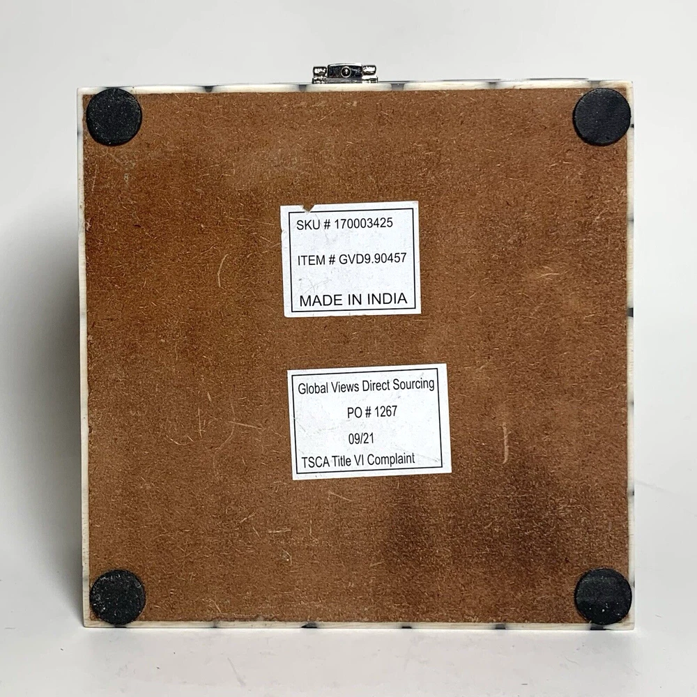 Global Views Storage-Trinket-Keepsake Box Substantial Wooden Inside Inlaid Bone and Resin Black, Grays & Cream Silver toned secure latch and hinges 6" Square A few shallow surface scratches on top. Several tiny chips along edges, on one corner and at base of back right hinge None obviously noticeable. ***I've pointed out a few in close-up photos*** Note: Vintage and pre-owned items will almost always show some signs of usage and wear. I try to describe each item as accurately as possible. ***Please view and enlarge all images for detail and condition verification*** I will gladly combine shipping when feasible. Please contact me for rates if purchasing multiple items. My goal is to provide excellent customer service. If you have any concerns upon receipt, please contact me immediately.