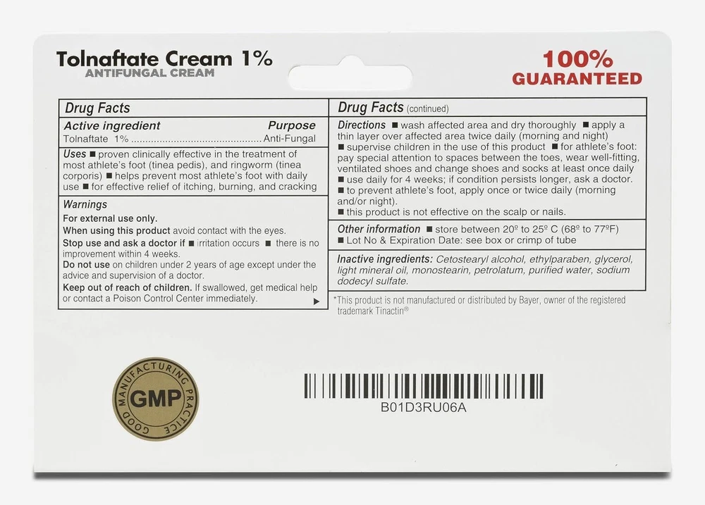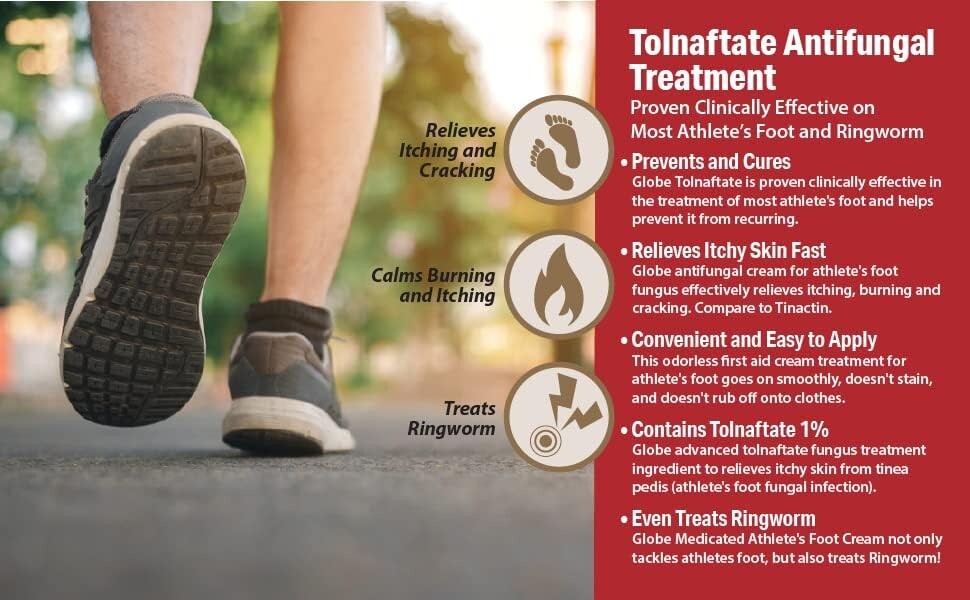 PREVENTS AND CURES: Globe Tolnaftate is proven clinically effective in the treatment of most athlete's foot and helps prevent it from recurring. RELIEVES ITCHY SKIN FAST: Globe antifungal cream for athlete's foot fungus effectively relieves itching, burning and cracking. Compare to Tinactin. CONTAINS TOLNAFTATE 1%: Globe advanced tolnaftate fungus treatment ingredient to relieves itchy skin from tinea pedis (athlete's foot fungal infection). CONVENIENT AND EASY TO APPLY: This odorless first aid cream treatment for athlete's foot goes on smoothly, doesn't stain, and doesn't rub off onto clothes. EVEN TREATS RINGWORM: Globe Medicated Athlete's Foot Cream not only tackles athletes foot, but also treats Ringworm!