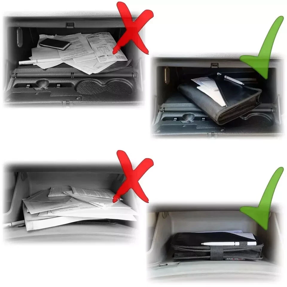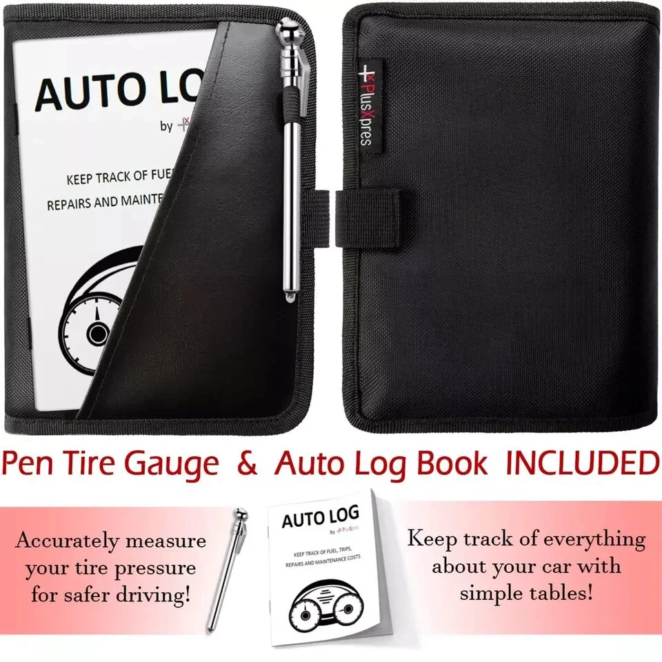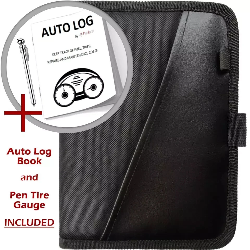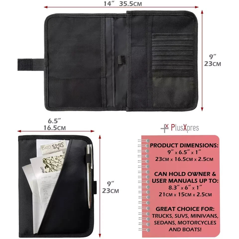 Glove Box Compartment Organizer - Car Document Holder - Owner Manual Case Pouch - Vehicle Storage Wallet for Registration & Insurance Card - Premium Auto Paperwork Holder - Log Book included - Black ✓ Free 30 Day Returns ✓ Free Shipping PERFECT SIZE - The size of this car document case was designed to fit most glove box compartments, larger car or truck consoles, and door pockets. Fits all your important documents and paperwork perfectly and hassle-free. Fits automotive owner manuals up to 8.3” x 6” x 1” (21cm x 15cm x 2.5cm), also fits tablets and e-readers up to 8”. CONVENIENT ORGANIZATION - This glove box console organizer features five interior pockets for service and car user manuals, repair receipts, maps, registration and insurance, eight credit or business card pockets, one vinyl clear pocket for ID or roadside assistance card, exterior quick access pocket, interior & exterior pen or tire gauge loops. AUTO LOG BOOK & PEN TIRE GAUGE INCLUDED - We are including an easy to use Car Log Book, includes 4 categories (Fuel Log, Trip Log, Maintenance & Repairs, and Notes). A Tire Gauge is also included, so you can accurately measure your tire pressure for safer driving. SIMPLE & PRACTICAL - This stylish and compact vehicle storage wallet was designed with enough room to hold everything in one place and keep your important documents protected and safe from tearing, bending or being ruined by moisture. This auto document case makes it easy to find what you need when you need it. DURABLE CONSTRUCTION & QUALITY MATERIALS - Our products are backed by high-quality polyester construction, reliable durability, quality top stitching, heavy duty hook and loop fastener, scratch and tear resistant structure. It’s a great choice for Trucks, SUVs, Minivans, Sedans, Motorcycles, and Boats. The PlusXpres Glove Box Organizer folds compactly in a stylish and efficient way to clean up and organize your car. It is designed to keep all your important documents and paperwork neat, organized, but also nearby, out of sight and easy to find. We know you spend a lot of time in your car, which means there is a lot of important information you need to keep on hand in case you get pulled over, need an oil change or just want to keep all your service and repair receipts organized. That's why we designed our Glove Box Document Holder as a premium Car Manual Case to help you with all of the above and to make your life easier. We are including a great, easy to use and compact Auto Log Book, to match your Glove Box Compartment Organizer. Includes 4 categories (Fuel Log, Trip Log, Maintenance & Repairs, Notes) to help you record and keep track of everything about your car with simple tables. Ideal for car enthusiasts, car restoration, business owners, or general use. Keeping a log book of your vehicle not only helps you keep your car running and functioning for a long time, but it also adds a level of authenticity to the value of your vehicle. Product specifications: - Main pocket can hold owner manuals up to 8.3” x 6” x 1” (21cm x 15cm x 2.5cm); - Eight credit or business card pockets; - Five interior pockets for service and car user manuals, repair receipts, maps, registration & insurance; - One vinyl clear pocket for ID or roadside assistance card; - Exterior stress reducing quick access pocket to hold coupons, reward cards, parking change, and other frequently used paperwork; - Interior and exterior elastic loops to hold pens or a tire gauge within easy and fast reach; - Easy and hassle-free access to all of your important documents due to the heavy duty hook & loop fastener; - Compact, lightweight with high-quality and durable polyester construction.