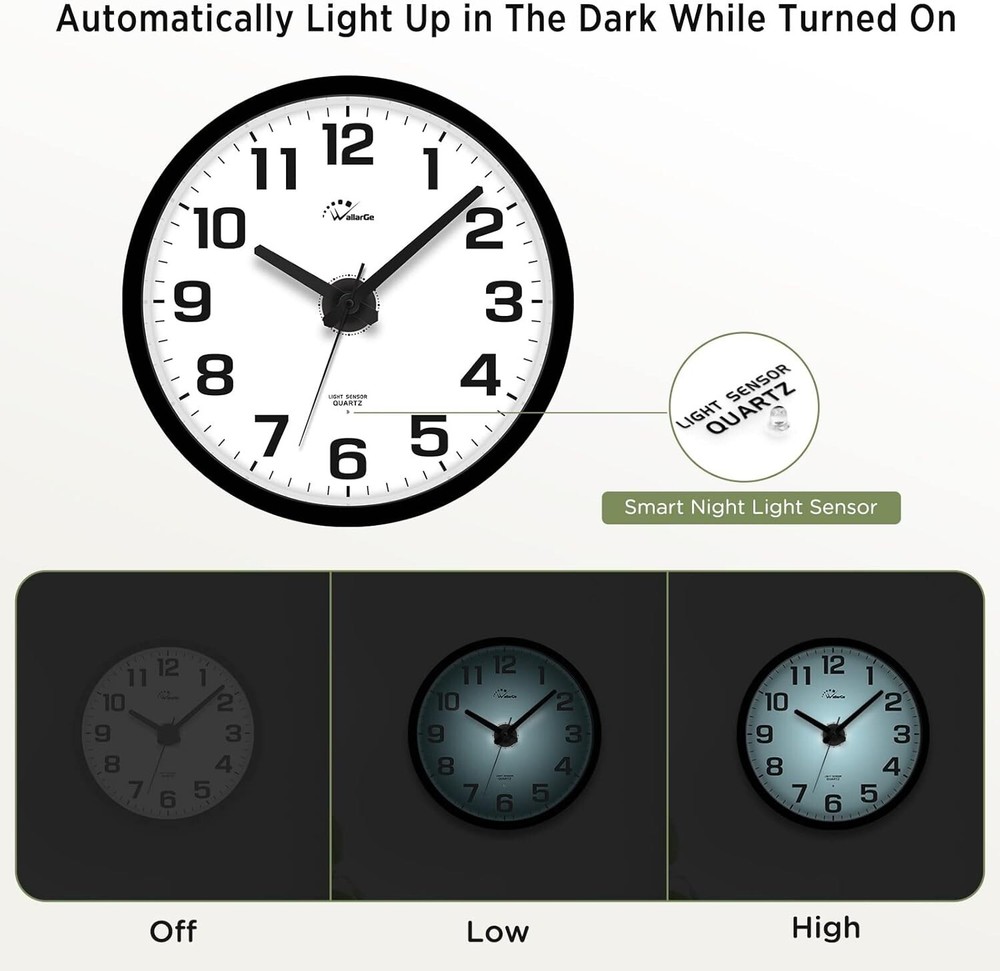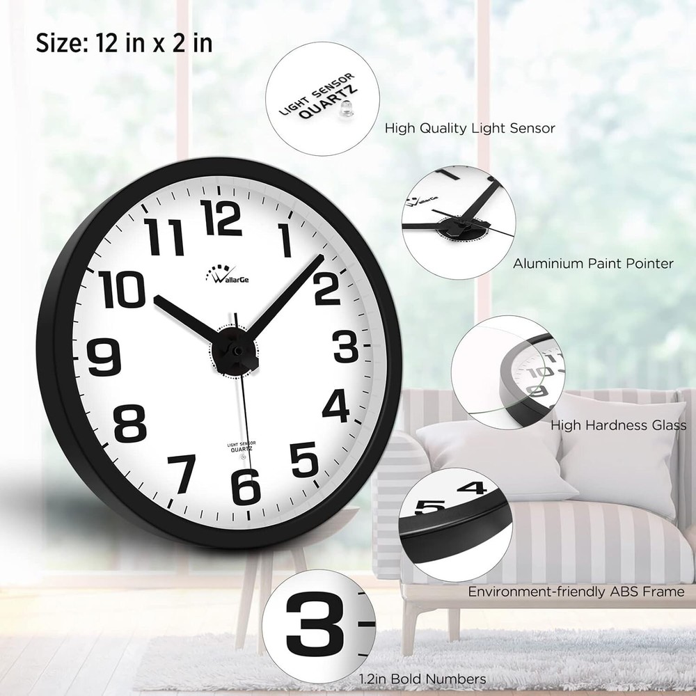 WallarGe Night Light Wall Clock for Bedroom - Silent Lighted up Wall Clock Glow in The Dark, Battery Operated for Living Room/Kitchen, Easy to Read Large Digital Display, 12 Inch Wall Clocks Battery Operated - This wall clock required 1 "AA" battery for clock movement and 3 “AA” batteries for energy saving light sensor. The light sensor and the clock movement operate independently, easy to use. (Batteries not included) Adjustable Brightness Smart Light - The clock is equipped with a high quality smart light sensor, so it will automatically turn on or off the night light depending on the surrounding light brightness. It is available in 3 levels of brightness: Off-Low-High. Silent Wall Clock, Non-Ticking - These wall clocks use superior precise quartz movement to make sure true silence and accuracy time with the smooth second hand. You no longer have to worry about its annoying clicking noises at night. Excellent Clocks for Living Room Decor - Modern design and practical house decorations, suit for living room, kitchen, backyard, garage, office, gym and so on. It come with 1 hook for easy hanging. 12” Clock Dial,1” Bold Numbers - Large white dial against white bold numbers creates easy viewing, add adjustable night lights, mate it easy to read the time from across the room both day and night.