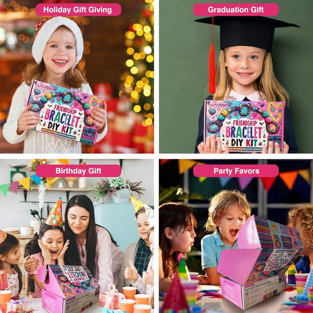 Comprehensive Bead Collection for Endless Creativity: Explore your creativity with a diverse assortment of beads in this Dupamind DIY kit. Featuring 1800 pieces of 9mm colorful pony beads, 600 pieces of glow-in-the-dark beads, and 400 pieces of specialty beads including letter beads, fruit beads, eye beads, smiley face beads, pendants, lobster clasps, and more—every component shown in the image is included. This extensive variety allows for limitless design possibilities. Glow-in-the-Dark Magic: Illuminate your creations with the unique glow-in-the-dark beads included in this Dupamind set. Perfect for adding a mystical touch to your jewelry, these beads emit a soft, captivating glow in dark environments, making your handmade pieces stand out no matter the setting. Durable, High-Quality Materials: Craft with confidence knowing your jewelry is made to last. Our pony beads, glow-in-the-dark beads and accessories are crafted from top-notch materials, ensuring your DIY creations are comfortable to wear, resistant to fading, and waterproof. Whether you're at the beach, by the pool, or in the shower, your jewelry will remain as vibrant as ever. All-Inclusive Crafting Tools: This Dupamind kit includes everything you need to start crafting right away. With easy-to-use tools and a wide array of colorful and stylish components, you can effortlessly design and create unique bracelets and necklaces that reflect your personal style. A Perfect Gift for Creative Fun: This Dupamind DIY bracelet kit is an excellent way to engage with children and encourage creativity. It’s ideal for family activities, providing a screen-free, hands-on experience that fosters imagination. Whether as a birthday gift, party favor, or friendship bracelet, this kit is a delightful present for kids, family, friends, or yourself. Product Description
