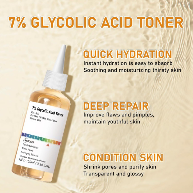 Glycolic Acid Serum for Face 7% Strength - Extra Large Size (3.88Oz) New Formula US Warehouse - FREE & FAST Shipping in US Product Description: These statements have not been evaluated by the FDA. This product is not intended to diagnose, treat, cure, or prevent any disease or health condition. Exfoliating Power: Experience the transformative effects of our 7% Glycolic Acid Toner, designed to gently exfoliate the skin, revealing a perfect and more radiant complexion while reducing the appearance of fine lines and uneven texture. Pore Minimizer: Formulated to shrink pores, this toner is your go-to solution for achieving tighter and more refined skin, making it an essential part of your skincare routine. Soothes and Hydrates: Designed with a hydrating formula, the 7% Glycolic Acid Toner not only soothes skin irritation but also delivers essential moisture, leaving your skin feeling refreshed and comfortable. Improve Blemishes and Acne: Target blemishes and acne effectively with our toner, which helps to clear and prevent breakouts while promoting an even skin tone for a clearer, healthier appearance. Anti-Aging Benefits: Incorporate anti-aging skincare into your regimen with our 7% Glycolic Acid Toner, which works to improve skin texture and diminish fine lines for a youthful glow. Feedback: 1.Any question for your order, please contact us in time, we will reply to you within 24 hours and give you a satisfactory answer. 2.If you are satisfied with our products and services, hope to take up your a little precious time to leave feedback reviews for our products.Thanks! 3.Your satisfaction is our effort. Welcome to order again! Have a great day! Our Policy: 100% Satisfaction Guarantee 20% of restocking fee will be charged for return item