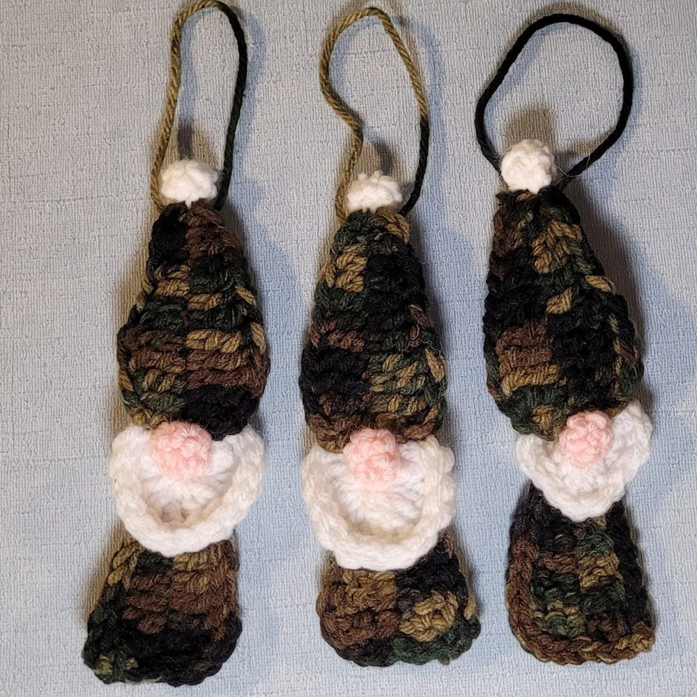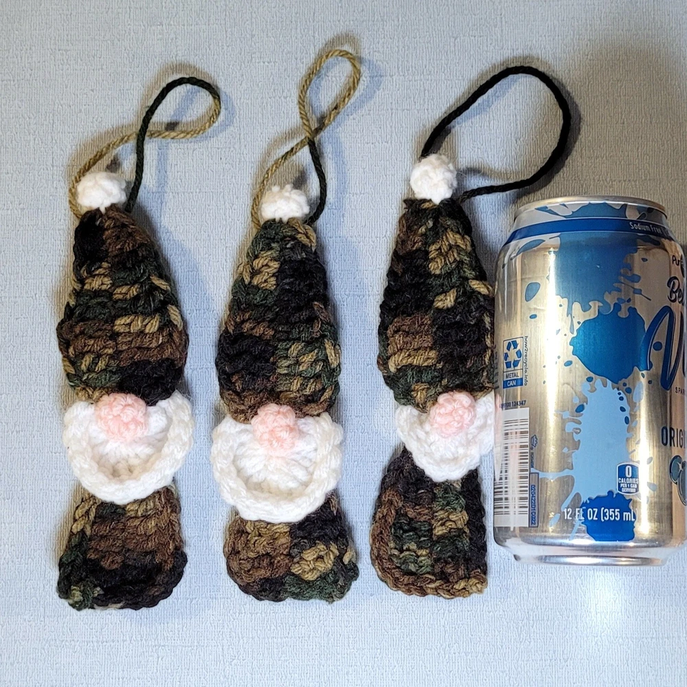 These Gnome Christmas Ornaments Set of 3 are a super-cute addition to your decorations! Handmade crochet from camouflage acrylic yarn, each gnome has a white beard and a pink puffy nose. Each ornament is about 6 inches tall & 2 inches wide, and has a 3 inch hanging loop. They are the perfect size for office decorations, attach to a package as an "extra" gift, or divide up for teachers' or colleagues' gifts. Ready-to-Ship, USPS Ground Advantage. International Shipping as well as expedited shipping are available; please contact me PRIOR to making your purchase (buyer pays in full). Please note-due to the handcrafted, 1-of-a-kind, “imperfectly unique” nature of this item, all sales are final & returns are not accepted. Confirm sizes & color; contact me if you have questions! 15% Bundle Discount when you spend $15 -just add to your cart! Thanks for looking! (Props not included with purchase.)