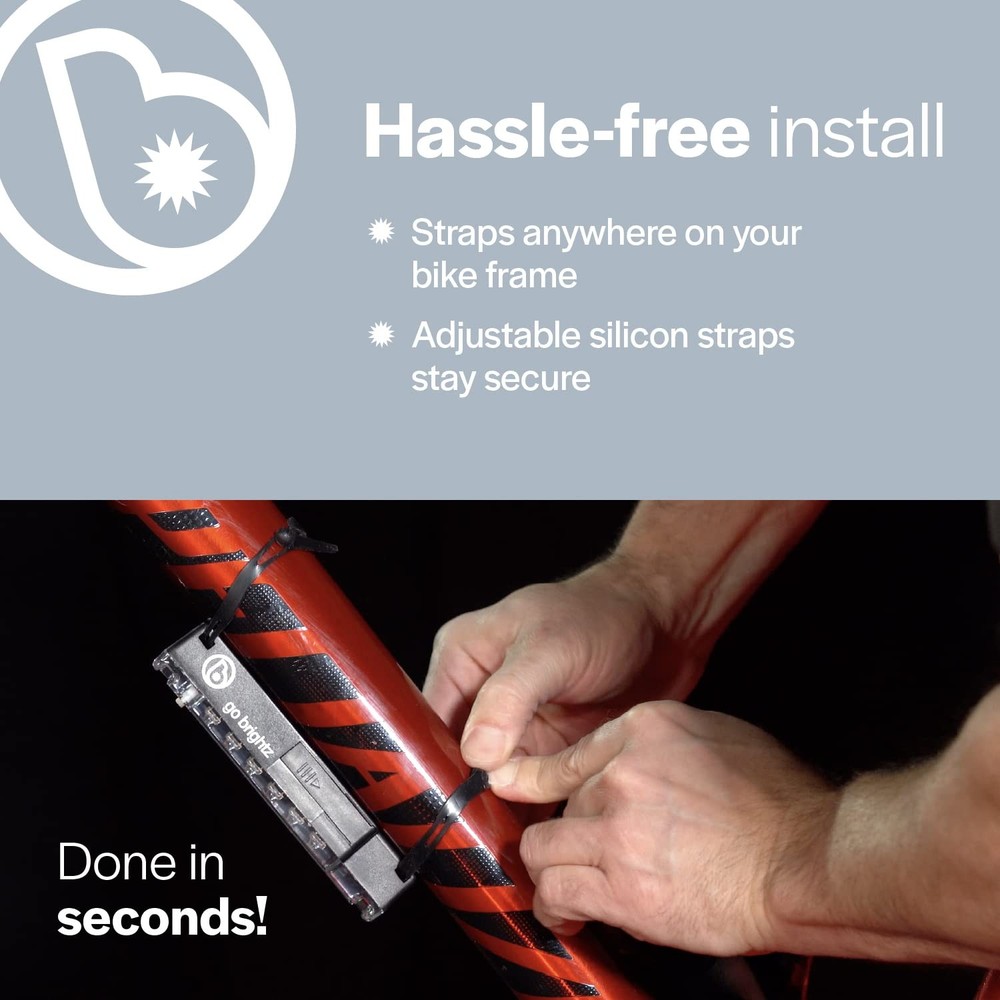 Cruise along with style with a bright, colorful LED light bar for your bicycle that produces brilliant colors and a wide under glow everyone can see. When you’re cruising around taking, taking your favorite trails, or just enjoying a nice ride around the neighborhood at night you want to be seen but you also want to have a little fun. That’s why we created this GoBrightz LED Bicycle Frame Light that produces warm, vibrant color that lights up the night with style. Like under glow you’d find on a street racing car our frame-mounted LED light bar is small and compact but produces a vibrant color that lets you be seen and lets you have more fun when you’re riding in all your favorite places. Product Details: Colorful LED Bicycle Frame Light Produces a Soft, Warm Under Glow Four (4) Lighting Modes Available Frame-Mounted Illumination Non-Skid Barrier for Frame Protection Water Resistant ABS Plastic (On and Off Switch) Four (4) Plastic Ties for Secure Installation AAA Battery Powered (Not Included) Give your bike a colorful under glow with a frame-mounted LED light bar for your bicycle that turns an average ride into a more exciting nighttime experience. Get one today by clicking Add to Cart above now. BIKE FRAME LIGHT BAR – a high-intensity LED light that mounts to your bike frame our Go bike lights make it easier for you to be seen while riding bikes at night in the city or park providing safety while also enhancing the look of your ride CONSTANT OR FLASHING MODES – these bright colorful bike frame lights not only produce bold and beautiful LED light you can customize your experience between four modes including constant, slow, medium, or fast flashing lights for safety and fun BE COOL BE SAFE AT NIGHT – our LED bike lights make it easier for you to be seen in low light or night conditions by drivers, walkers, and other cyclists. The led bicycle light bar provides a under-glow halo effect on the ground beneath your bike THE PERFECT GIFT - led bike frame light bars make the perfect kid and adult bike accessories. GoBrightz are known to be popular Christmas gifts and stocking stuffers and fun birthday presents all year long for men, women, girls and boys of all ages INSTALLS IN MINUTES – our waterproof neon bright led bicycle lights are designed to attach to the front part of the frame and holds firm when you’re riding your favorite roads and trails. It even includes easy-to-install installation instructions