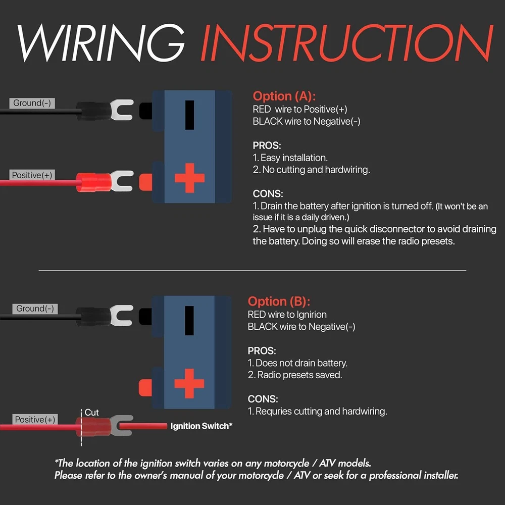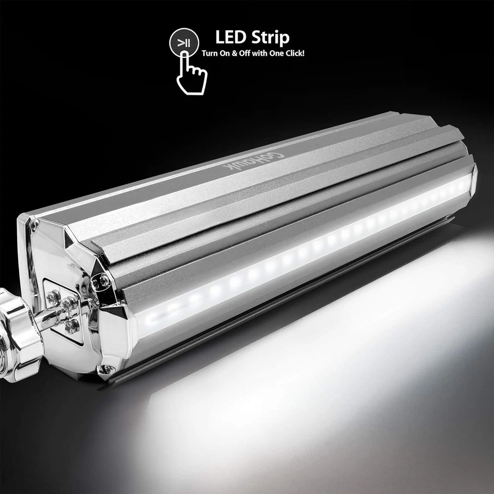 =============================================================== =============================================================== 1) Bluetooth Wireless 2) 24 White LEDs Strip 3) USB 2.0 4) AUX-IN 5) FM Radio 6) Display with Clock Cover: 87.5 - 108 MHz Sensitivity: ≤37dB Distortion: ≤0.5% SNR: ≥40dB LED Color: White Body Color: Silver Side Plate Color: Chrome Mounting Clamp Color: Silver Rated Voltage: 12V DC Max Input Power: 12W x 2 Rated impedance: 4 - 8Ω Bluetooth Ver.: 4.0 Bluetooth Protocol: AVRVP1.0, GAVDP1.0, ADVTP1.0, A2DP1.0 Wireless transmission range > 15m Frequency range:20Hz - 20KHz 3.5mm Audio Jack: No AUX-IN: 3.5mm USB: Support USB Drive in mp3 format USB Charging: No Dimensions: Speaker Width(Body): 9-3/4 in. Speaker Width(Overall): 18-1/4 in. Handlebar Clamp Size: 7/8 to 1-1/4 in. 1 x Speaker Stereo Main Unit 2 x Mounting Clamp 1 x Power Harness 1 x User Manual GoHawk's motorcycle soundbar speaker features an innovative mounting design with a new ball stub design and mounting clamp that supports 7/8" to 1 1/4" handlebars. The 360-degree swivel-able feature allows for custom installation, and the speaker comes with a 59" battery cable harness with a ring terminal connector, making it easy to install. The GoHawk RE9-X model has an overall width of 18-1/4" and is compatible with most motorcycles, ATVs, UTVs, 4-wheelers, go-karts, and golf karts. Before purchase, make sure to measure your handlebar center clearance. If you have a smaller handlebar clearance, consider the RE8 model with an overall width of 16-3/4". GoHawk's dual waterproof motorcycle stereo speakers come with a high-performance power amplifier built-in and 24 white LED strips that can be turned on and off with one click. The speaker clamp has a universal fit for 7/8" to 1 1/4" handlebars, and the aluminum stereo main unit has a satin finish and a digital display for easy use. This motorcycle speaker has Bluetooth wireless capabilities that allow you to stream your favorite music and radio channels from your smartphone. It is compatible with a wide range of devices, including iPhone, iPod, Samsung Android Galaxy S Note series, and any smartphone devices. It also supports USB MP3 files, FM radio, and has a clock display. Enjoy superb crystal sound quality with this advanced waterproof motorcycle speaker designed for 12V applications. The satin-finished stereo unit is built with high-quality aluminum material and is perfect for outdoor use. It's easy to install with all necessary hardware and wiring included, and it comes with a standard 12V power connection for plug-and-play convenience. Brand GoHawk Model Name RE9 X Speaker Type Outdoor, Soundbar Connectivity Technology Bluetooth, Auxiliary, USB Special Feature Waterproof 5961861