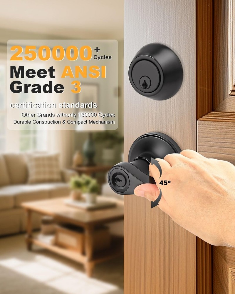 Just installed this lockset and it feels incredibly sturdy! The black finish looks sleek on my front door, installation was straightforward, and the deadbolt operates smoothly. Definitely recommend for anyone needing a reliable upgrade.