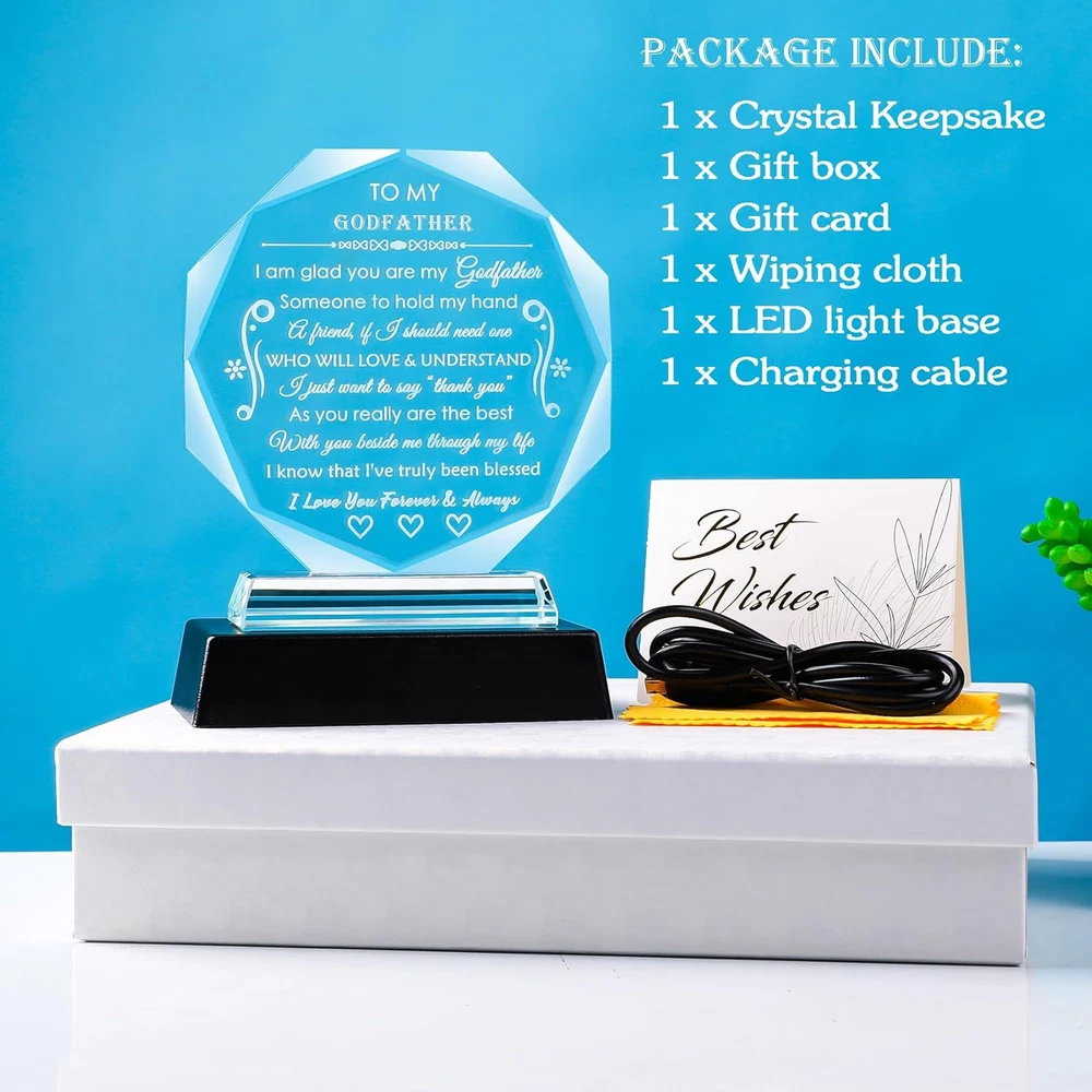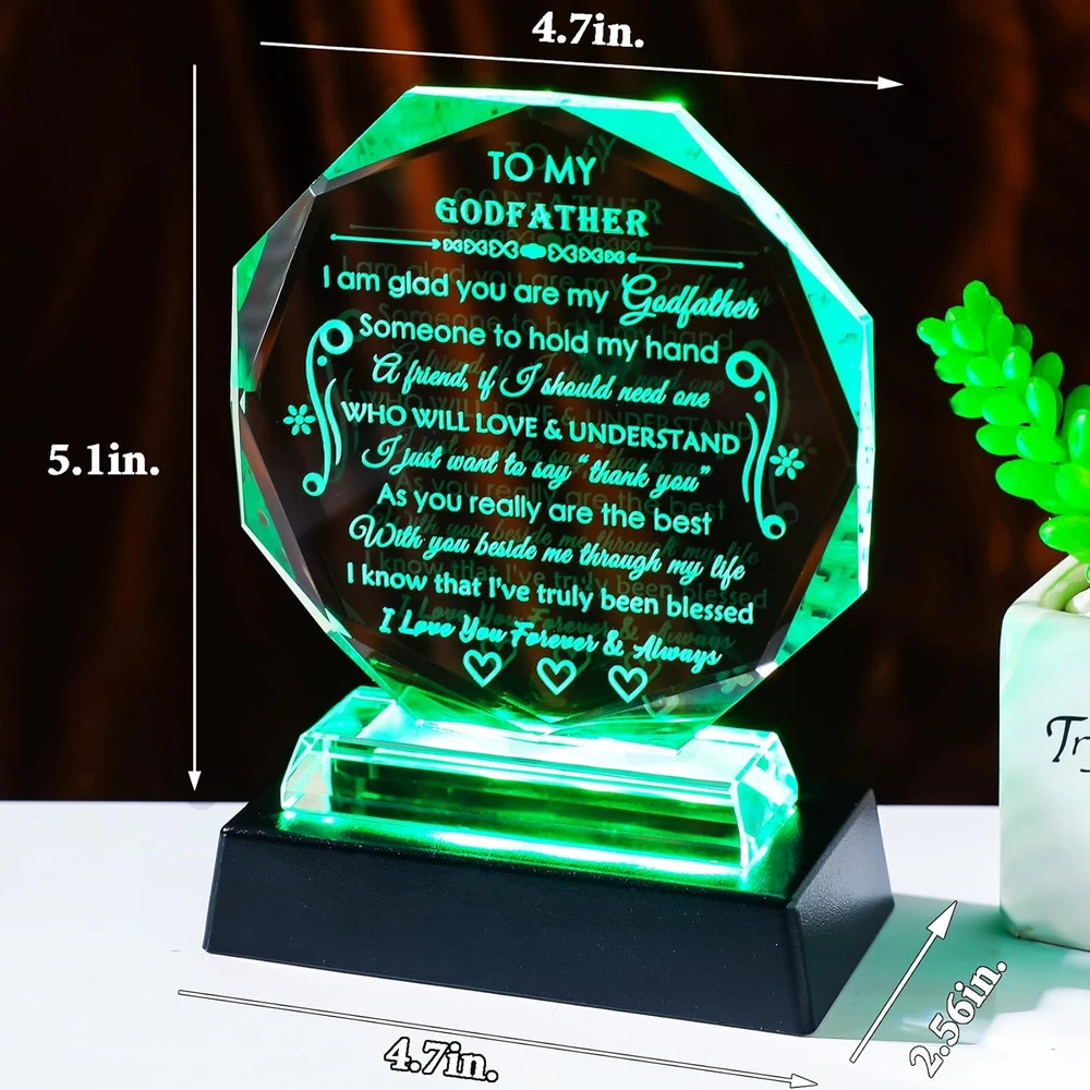 Menu Other Items Feedbacks About Us Contact Us Add To Favorites Godfather Gift with Colorful Base Engraved to My Godfather Crystal Keepsakes Gifts from Godchild on Fathers Day Christmas Thanksgiving Birthday Crystal Gifts for Godfather from Goddaughter Godson 💎QUALITY Glass MATERIAL: This keepsake was made of high-quality glass, transparent and glossier, it can be used for a long time but does not lose its luster. All patterns and words are laser-engraved inside the glass. It is not easy to wear or tarnish 🎁Godfather Gift: This crystal Godfather gift with LED Base is a thoughtful personal birthday Christmas Father's Day gift for a godfather designed especially, one who selflessly helps you and gives you the courage to live when you are in despair, and this bright crystal is like a warm hug that he will cherish forever. Best crystal keepsakes gifts to express your love to him 🎁 BEST GODFATHER GIFT from Godchild: The godfather glass keepsake is a meaningful gift from a goddaughter or godson of any age, to a loving godfather. Whether at baptism or years later for a beloved Godfather's birthday or holiday, the godfather keepsake present will hold a special place in his heart. ✨GREAT HOME DECOR: This crystal keepsake is equipped with an LED light base. This colorful LED base has a variety of colors of lights, which can be adjusted according to your preferences(seven working modes), creating a romantic atmosphere in a darker space. It will be a good home decoration when you put it on the table, wall shelf, or fireplace. It also can use be a night light GIFT BOX PACKING: The crystal gifts come in a stylish gift box with a small clean cloth and a blank gift card(You can write whatever words you want), you can send the gift directly, no need to repack To My Godfather I am glad you are my Godfather. Someone to hold my hand. A friend, if I should need one who will love & understand. I just want to say “thank you”. As you really are the best.With you beside me through my life. I know that I've truly been blessed.I Love You Forever & Always Product Features 1. Made with High-quality Glass Crystal, Making the Crystal More Transparent and Glossier. 2. Laser engraved words and images inside the crystal keepsakes will never fall off, this is an eternal Keepsakes 3. The Exquisite Packing Box Looks Delicate and Classy. Product Specification Color of Crystal: Clear Material: High-Quality Glass Crystal Size:4.72x4.72x0.98" Crystal Glass Weight:1.32 Package Include 1 x heart crystal blocks keepsakes 1 x Nice Gift Box 1 x gift cards 1×flannel 1×USB cable 1× LED Base When you are looking to buy something for godfather who has everything, this is the gift that fits right in and makes a big hit. Make Your Gift Out of the Ordinary! This is the gift that he can see every week and accompany him for a long time. A milestone crystal paperweight for godfather gift on Birthday Christmas Thanksgiving Item Specification Item Thickness 0.98 Inches Style Godfather Gift+LED Light Type Neon Color Clear Material Glass Material Type Glass Shape Heart Theme Words & Quotes Item Dimensions L x W 5.1"L x 4.7"W Pre Printed Text To My Godfather Recommended Uses For Product Gift and decorative item, specifically for a godfather Mounting Type Free Standing Style Name Godfather Gift+LED Included Components 1 x heart crystal blocks keepsakes, 1 x Nice Gift Box, 1 x gift cards, 1×flannel, 1×USB cable, 1 x LED Base Dimensions Shipping Returns Additional Info Product Dimensions: 4.7 "w x 5.1 "w. Weight: 1.7 lb Fast shipping is very important for us. Our standard shipping service is FREE. Your order will be shipped within 1-3 business days upon full payment received. Most items are delivered within 3-5 business days, however, please allow 3-10 business days. We are shipping only to USA. We only ship to the confirmed Paypal address. We reserve the right to cancel any order for any reason at any time. We are not responsible for undeliverable addresses. We offer a 30 day return policy from checkout winning date. Your satisfaction is guaranteed! If for any reason you are unhappy with your item, just return it within 30 days for a full refund, minus shipping cost. Please contact us prior to initiating a return so that we can issue you a refund authorization. Items defective upon receipt must be packaged in their retail packaging as if new and returned with a detailed description of the problem. Return shipping fees are not refundable. We reserve the right to decline any returns if the above guidelines are not followed. All of our items, unless otherwise stated, will only run on 120 volts. Please check to make sure your country complies with these specifications. If you have a problem or question regarding your transaction please contact us before leaving any type of feedback. We will work with you to resolve any problem you may have.