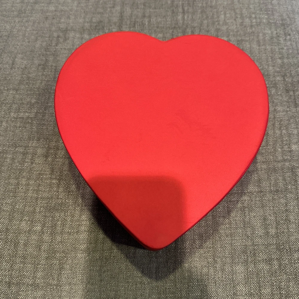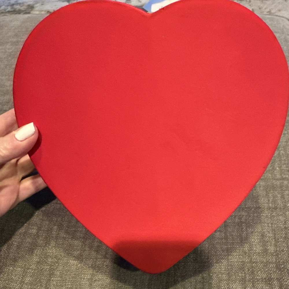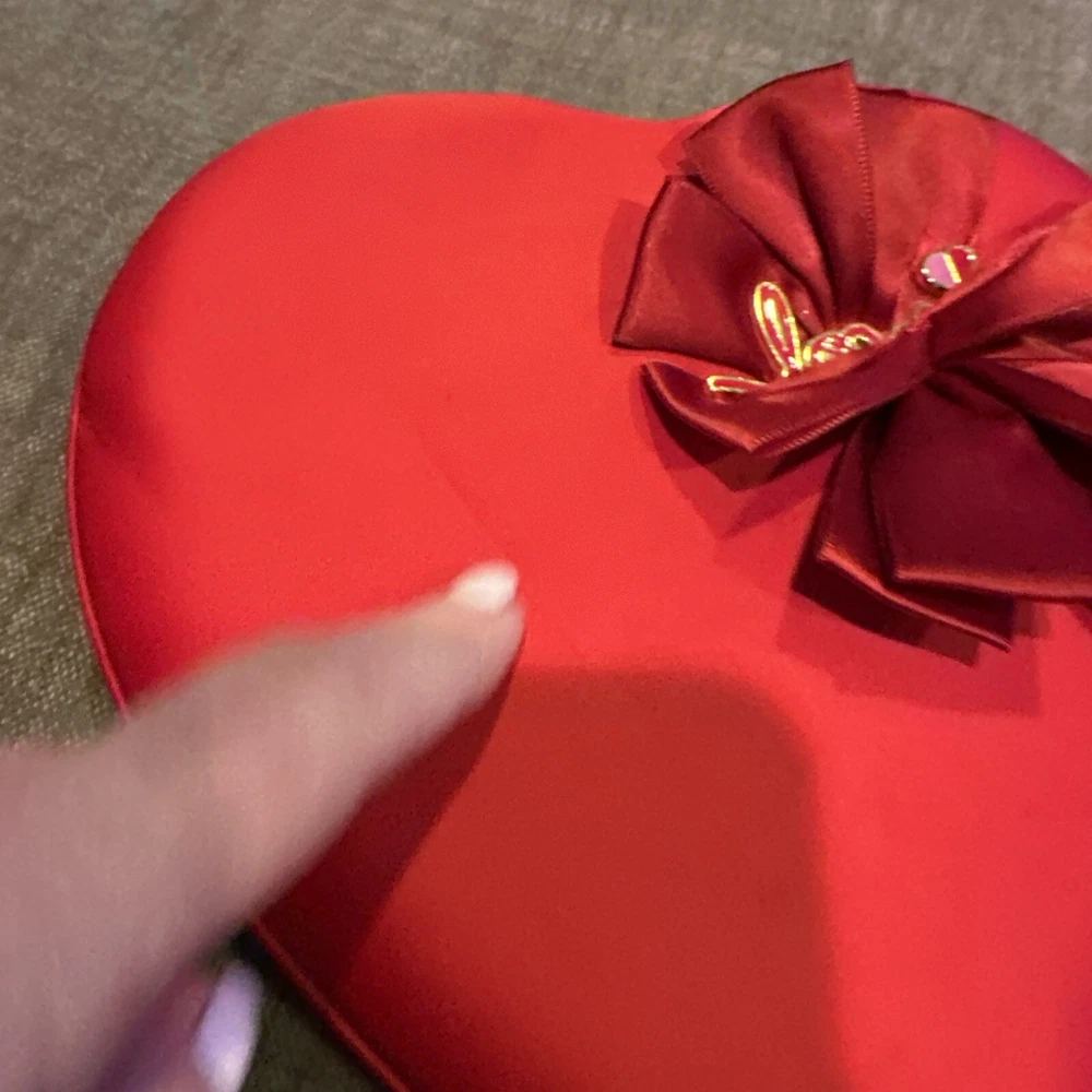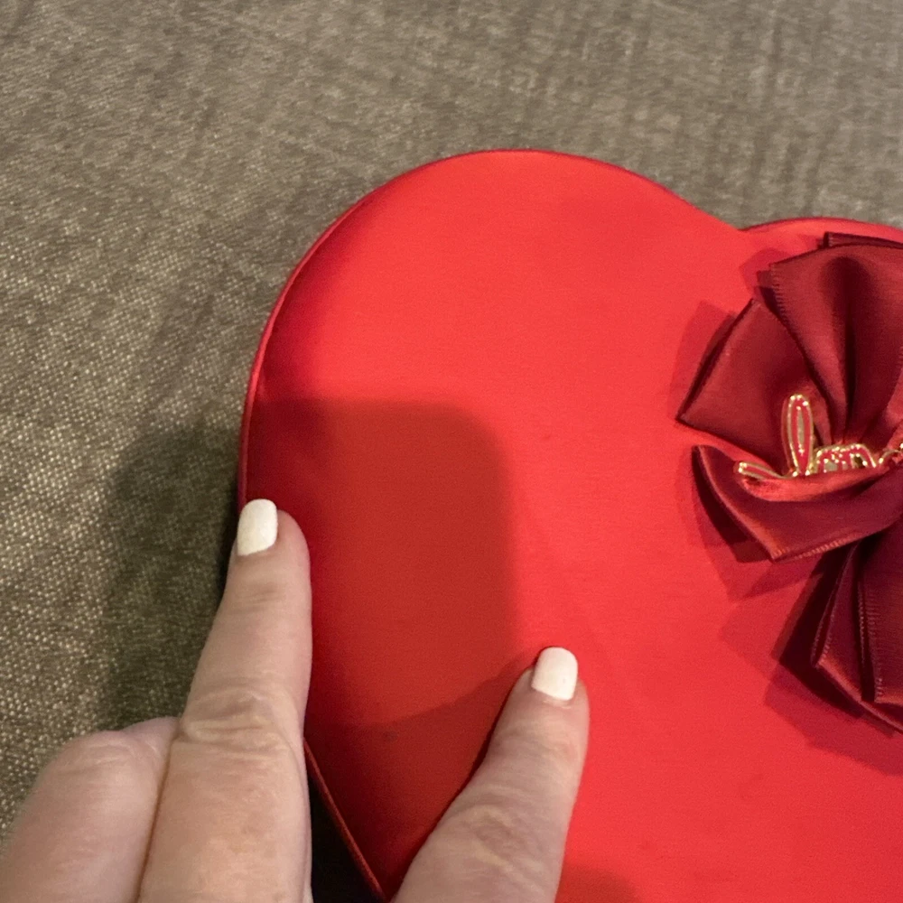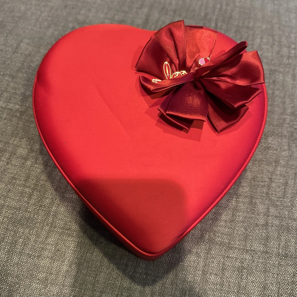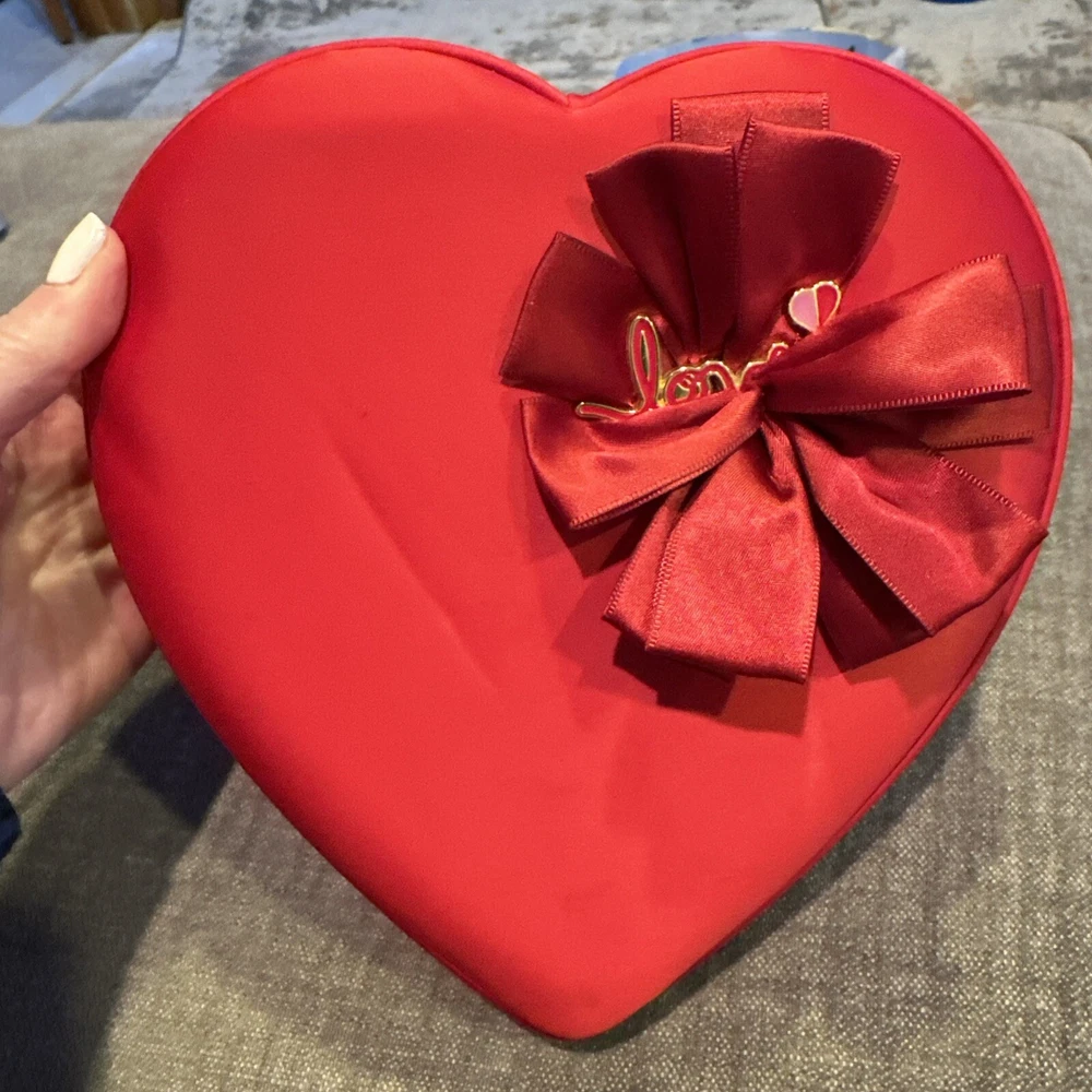 Padded red heart empty Godiva box with a bow and love emblem, the box has two indents pointed out in pics.