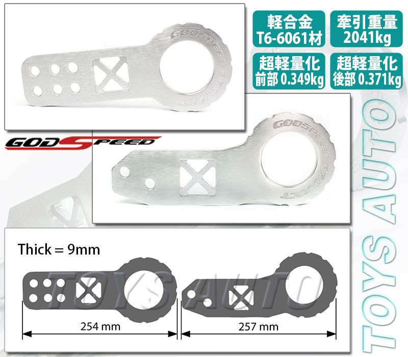 Godspeed Universal CNC 6061 Aluminum Front +Rear Tow Hooks Towing Adapter Silver Item Description: BRAND NEW GODSPEED - Universal Tow Hook (Front + Rear) - Made of CNC Machined from T6 6061 Aluminum - Towing capacity up to 4500lbs (2041kg) - Tow Hook opening: 2.5" (63.5mm), Thickness of the Hook: 9mm - come with bolts washer (19mm bolts) Note: This is universal fit item, it might require modification of front/rear bumper or bumper beam support for installation WARNING: The items in the listing are found to have compounds and chemicals known to the State of California to cause cancer, birth defects, and reproductive harm. Visit p65warnings.ca.gov for detail Please read all our the shipping charge, payment terms and store policy carefully before your purchase. Payment Options Paypal, Credit Card by phone (for US customer only) Sales Tax : Ebay will collect sales tax and remitted Shipping/Handling Rate $0.00 Anywhere within US $35.95 Canada Ground (Not include custom/broker fee) $44.95 Canada & International (USPS priority mail) $69.95 Canada & International (USPS EMS/UPS/Fedex) Insurance included · If you have any question, please contact us by using " ASK A QUESTION " , we will reply ebay message Monday-Friday 9-6 PST · Buyer take your own risks for package lose or damage during the transit when package without insurance or Buyer need to report lose or damage to the shipping carriers by their own when package with insurance. · we reserve the right to choose best shipping method on all order Store Policy: PAYMENT INSTRUCTIONS: PLEASE READ BEFORE YOU PAY THE AUCTION 1. Paypal - We will only ship to the address shown on PayPal’s transaction detail page. Signature require will add for all payment over $250 (NO EXCEPTION) - We reserved the right to hold your order until payment cleared or confirmed. - To help us provide fast service, we recommended you enter the item number, auction title, correct shipping address when you make payment. 2. Credit Cards and Debit cards by phone - Available for US customer only, we accept Visa, Master and Discover and item will be ship to billing address only for security reason. FOR ALL INTERNATIONAL/ CANADA CUSTOMER: ALL import taxes, customs duties, additional charges for customs clearance MUST be borne by the recipient; we have no control over these charges and cannot predict what they may be. Customs policies vary widely from country to country; you should contact your local customs office for further information. When customs clearance procedures are required, it can cause delays beyond our original delivery estimates. -Most of our auto parts are design for US/Canada vehicle. It may fit on foreign vehicle. Please verify with us before purchase. Any purchases without confirmation of fitment will be at your own risk. ADDITIONAL INFORMATION: ** Payment must be made within 5 days after auction ends. Product availability not guaranteed after 5 days and we will file non-paying bidder to eBay ** PROCESSES AND SERVICES - Our Shipment cut off time is 10am PST – Order come in after will be process next following business day (our warehouse will close and not able to process order weekend) - If item is defective. Please contact to us within 5 days after you received the item. No exchange can be made if after 5 days (no exception) EXCHANGES: If you would like to exchange an item for a different one, customer must response all shipping charges. All Exchange item must have RMA# and approved by us WRONG ITEM: If you receive a wrong item, please contact us by using " ASK A QUESTION " . WARRANTY POLICY: - All the performance parts have to install by ASE Certified mechanic/techician in order to cover by our 90 Days or 1 year warranty. Warranty void if customer installs the parts without certified mechanic/technician instructed. - Please contact the manufacturer directly for warranty information. For assistance in contacting the manufacturer, please contact us. RETURN POLICY: - All return must be made within 30 days from the day you received the item. Shipping charge is non-refundable. *Partial Refund - 80% for Item in Brand new condition. And, Partial refund 50-80% of selling price - when item return in opened it, used it, sent it back not in original package, or sent it back in a condition other than the one you sent it in. -All exchange must have RMA number and approval. We will not accept any kind of return or exchange without RMA approval. - FREE SHIPPING ORDER - shipping charge will be deducted from the amount of your refund if the reason for your return is not the result of our company error. Powered by SixBit's eCommerce Solution