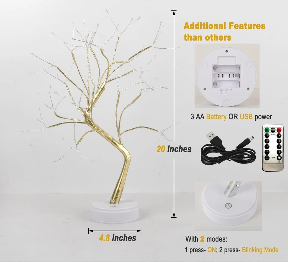 108 LED Twinkle Tree Lamp - Gold Bonsai Light with Remote Control Convenience ‹ › ‹ › ‹ › ‹ › ‹ › ‹ › ‹ › ‹ › ‹ › 108 LED Twinkle Tree Lamp Gold Bonsai Light with Remote Control Convenience Product Highlights: 🎄 Height: 20 inches, featuring a total of 108 bright LEDs across 18 artistic branches. 🎄 Touch sensor switches paired with a remote control for ultimate convenience. 🎄 Crafted from durable plastic and enveloped in radiant gold foil, ensuring long-lasting elegance. Versatile Power Options: 🎄 Can be powered by USB or 3 AA batteries (not included), offering flexibility for any location. 🎄 Use batteries for portability or USB for electricity savings – perfect for any occasion! Important: Please unplug the USB cable when using batteries to avoid damage! Elegant DIY Design: 🎄 Bonsai style design adds vitality and charm to your living space. 🎄 Flexible branches can be easily bent to create your desired shape – ideal for personalizing for any celebration. Modes and Enchantment: 🎄 Premium LED bulbs provide soft, warm white light to enhance your room's atmosphere. 🎄 Available in various lighting modes, including Constant and Breathing modes for ultimate ambiance control. 🎄 Vivid gold branches evoke the serene beauty of white birch under a starry sky. The Perfect Gift: 🎁 Ideal for home and office décor, as a thoughtful gift, or an enchanting night light. 🎁 Perfect for festive occasions: Christmas, Easter, Mother’s Day, weddings, and more! 🎁 A captivating addition to your apartment, dorm, or balcony décor, bringing warmth and elegance into any space. Why Choose the 108 LED Twinkle Tree Lamp? This exquisite Gold Bonsai Light is not just a product; it's an experience. Transform your living spaces with an enchanting glow that brings warmth, elegance, and flexibility. Perfect for any decor theme, it's a charming addition that will captivate hearts, making it an ideal gift or personal treasure for years to come. Illuminate your life with the 108 LED Twinkle Tree Lamp. Order yours today and let your space shine with elegance! Shipping Free & Fast Shipping - We offer free shipping to most of the USA with a normal delivery time of 3-7 days. However, due to the current situation, additional delivery time (up to 3 weeks) may be required for some items. Alternative Carriers - We may use alternative carriers (e.g. USPS, FedEx, UPS, etc.) to ensure your package arrives safely and on time. Due to the use of multiple carriers, we are unable to provide a tracking number automatically. Handling Time - Orders are processed and shipped within 1-2 business days of receiving cleared payment. Shipping Restrictions - Shipping to Alaska, Hawaii, Puerto Rico, Guam, and other US territories may incur shipping charges or delivery restrictions. Please contact us before ordering, or your order can be refunded/cancelled. State Restrictions - There may be restrictions based on your state of purchase. For example, certain items may not be shipped to California due to state regulations. Contact for Tracking Updates - If you require tracking updates or have any concerns about the delivery of your order, please feel free to contact us, and we will be happy to assist you. Return 30-Day Hassle-Free Returns - We want you to be completely satisfied with your purchase. If you are not, you can return the item within 30 days of receiving it for a full refund or exchange. Easy Return Process - To start a return, simply contact us and we will provide you with a prepaid return shipping label and detailed instructions. Restocking Fee - There are no restocking fees for returns. However, the buyer is responsible for return shipping costs if the return is not due to a seller's error. Refund Processing Time - Refunds will be processed within 5 business days of receiving the returned item in its original condition. Payment We accept all major credit cards, PayPal, and Apple Pay for your convenience. Your payment information is secure and encrypted to ensure a safe and seamless transaction. Please complete your payment within 3 days of purchase to avoid any delays in shipping. Feedback Your feedback is extremely important to us. We strive to provide the best products and customer service possible. If you are satisfied with your purchase, please take a moment to leave us a positive review. If you have any concerns or issues with your order, please contact us before leaving negative feedback. We are committed to resolving any problems and ensuring your satisfaction. Contact Us If you have any questions or concerns, please feel free to reach out to our customer support team. You can contact us through the eBay messaging system. We are available Monday to Friday, 9:00 am to 5:00 pm EST, and we will do our best to respond to your inquiry within 24 hours. Thank you for supporting our small family business! UPC: Not Set Size: 20in Item Height: Fairy Light Tree Lumens: Bright Power Consumption: Not specified Unit Quantity: 1 Occasion: Birthday,Christmas,Easter,Graduation,Party,Wedding,Mother's Day Features: With Remote Control,Touch Sensor Switch,Flexible Branches,DIY Design,Different Lighting Modes Light Color: Warm White Control Style: Remote Control,Touch Department: Unisex Baby & Toddler,Kids,Teens,Adults Theme: Not Set Room: Bedroom,Living Room,Office Material: Plastic Character: Not Set Labels & Certifications: Not Set Brand: Unbranded Type: Fairy Light Lighting Technology: LED Light Shape: Tree Sensor Type: Not applicable Installation Area: Indoor Color: Gold Cord Color: Gold Power Source: USB and Battery Number of Settings: Multi LED String/Strip Type: Not applicable Energy Star: Not Set MPN: Not Set EC Range: Not Set LED Chip Code: Not applicable Voltage: Not applicable Output Voltage: Not applicable IP Rating: Not water resistant Character Family: Not Set Manufacturer: Not Set Amperage: Not applicable Number of Lights: 108 Country/Region of Manufacture: Not Set