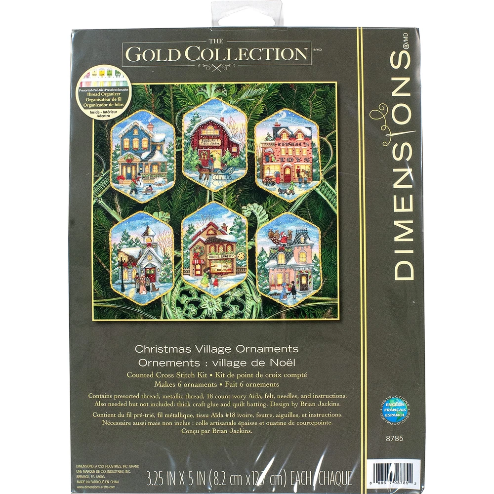 Decorate your Christmas tree with these elegant and festive Gold Collection Counted Cross Stitch Christmas Village Ornaments! This advanced cross stitch kit makes 6 different ornaments, each featuring a or home in a cozy winter village. Specifically designed for experienced needlecrafters, this cross stitch kit uses full and half stitches to create rich detail and depth. When you've finished stitching your Christmas crafts, hang them on your Christmas tree or gift them to a friend! Includes 18 count ivory Aida, cotton and metallic thread, felt, needle, and easy instructions. Makes 6 ornaments. Completed ornaments measures 3.5'' x 5''. Christmas Village counted cross stitch ornament kit includes 18 count ivory Aida, cotton and metallic thread, felt, needle, and easy instructions. Christmas Village craft kit makes (6) cross stitch ornaments. Completed Christmas Village ornaments measure 3.5'' x 5'' Decorate your Christmas tree with these beautifully detailed cross stitch ornaments, featuring shops and homes in a cozy Christmas village. This advanced cross stitch kit uses full and half stitches to create detail and depth in these festive DIY Christmas ornaments.