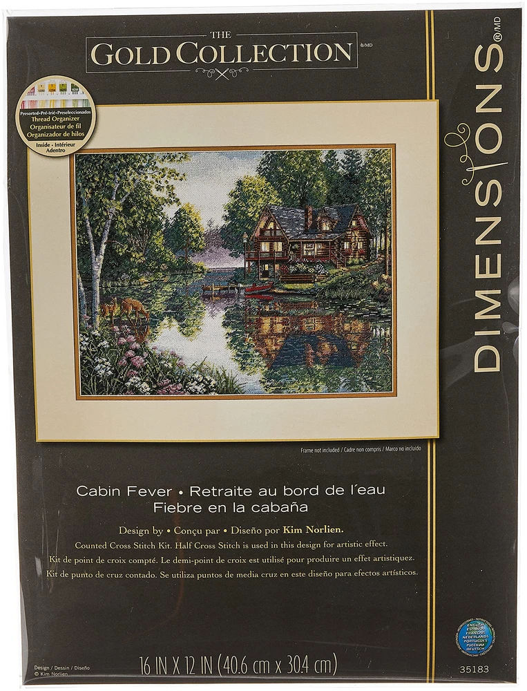 Stitch a calming piece of Day wall art with the Gold Collection Cabin Fever Counted Cross Stitch Kit! This advanced cross stitch pattern features a picturesque cabin nestled on a serene lake, and uses full and half stitches to create stunning depth and detail specifically designed for advanced needlecrafters. Includes 18 count ivory Aida, cotton thread, thread sorter, needle, and easy instructions. Completed lakeside cabin cross stitch measures 16'' x 12''. Cabin Fever advanced counted cross stitch kit includes 18 count ivory Aida, cotton thread, thread sorter, needle, and easy instructions. Completed scenic cabin cross stitch kit measures 16'' x 12''. This advanced counted cross stitch pattern features a picturesque lakeside cabin on a spring day. Specifically designed for experienced needlecrafters, this peaceful cross stitch pattern uses full and half stitches to create exquisite detail. Frame and hang your completed lakeside cabin cross stitch for a beautiful piece of DIY wall art!