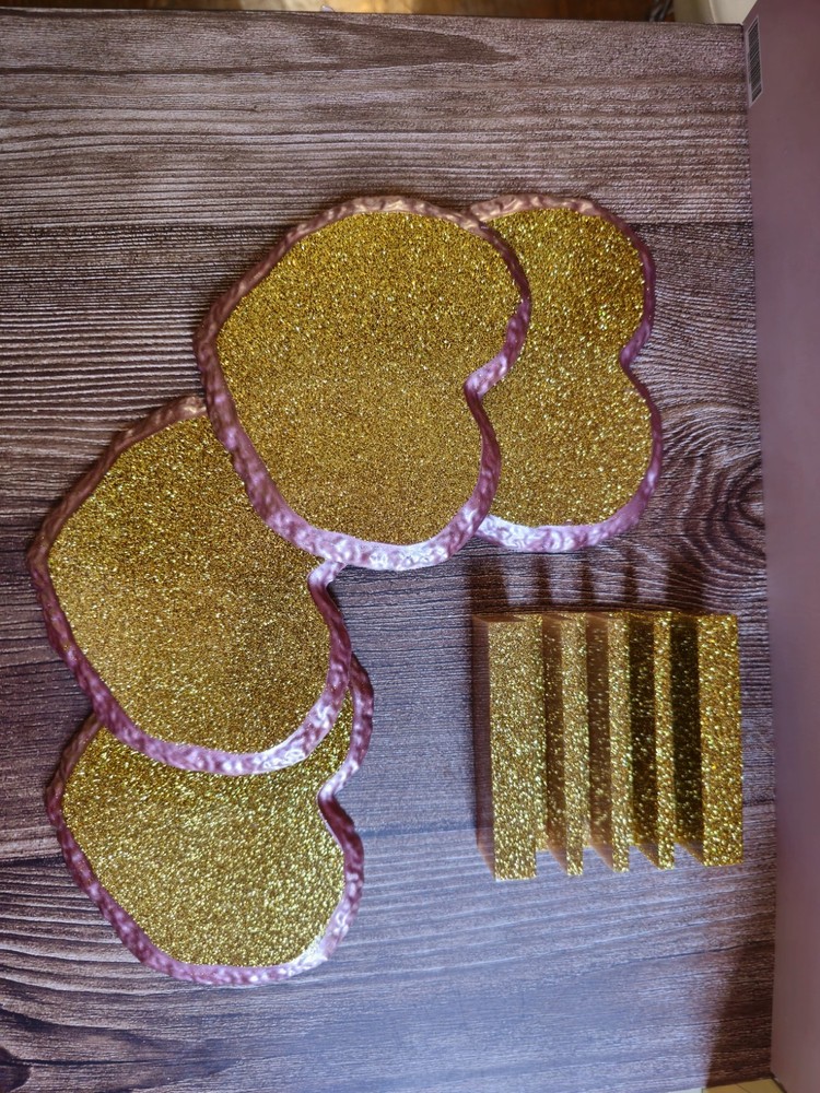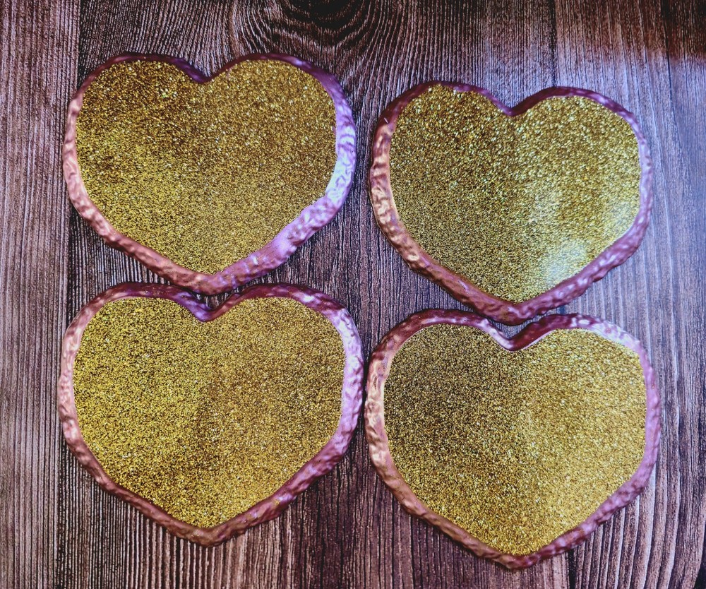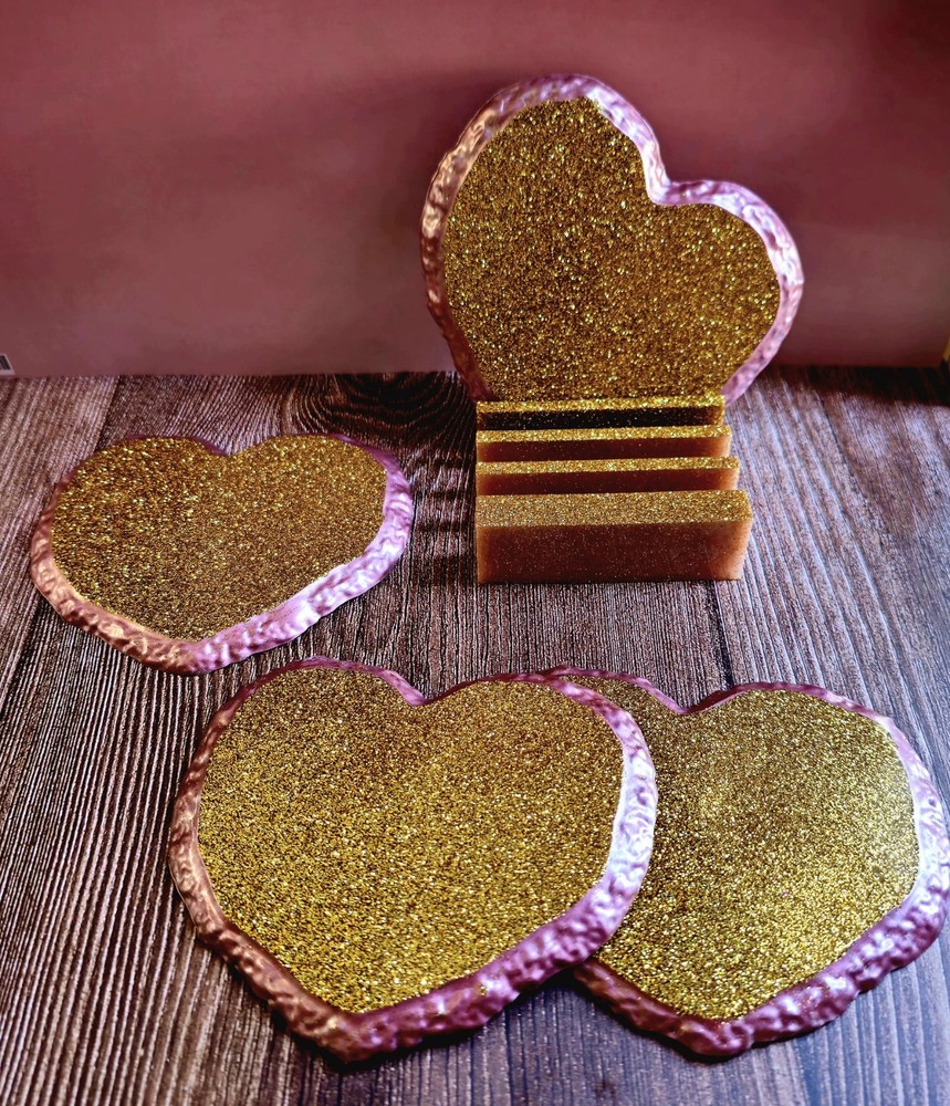 This set of gold glitter and rose gold heart-shaped handmade coasters is perfect for adding a touch of contemporary style to your home decor. Made of resin, these coasters feature a heart-shaped design with a gold color and a shiny finish. Set includes 5 coasters with a diameter of 5 inches and a set rack/holder for easy storage. Ideal for all occasions, these lightweight and stackable coasters are easy to clean and maintain, making them a practical and stylish addition to any space. Made in the United States.