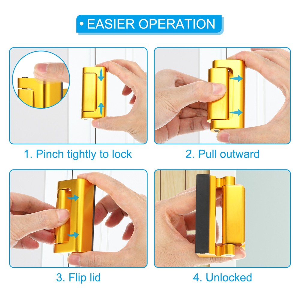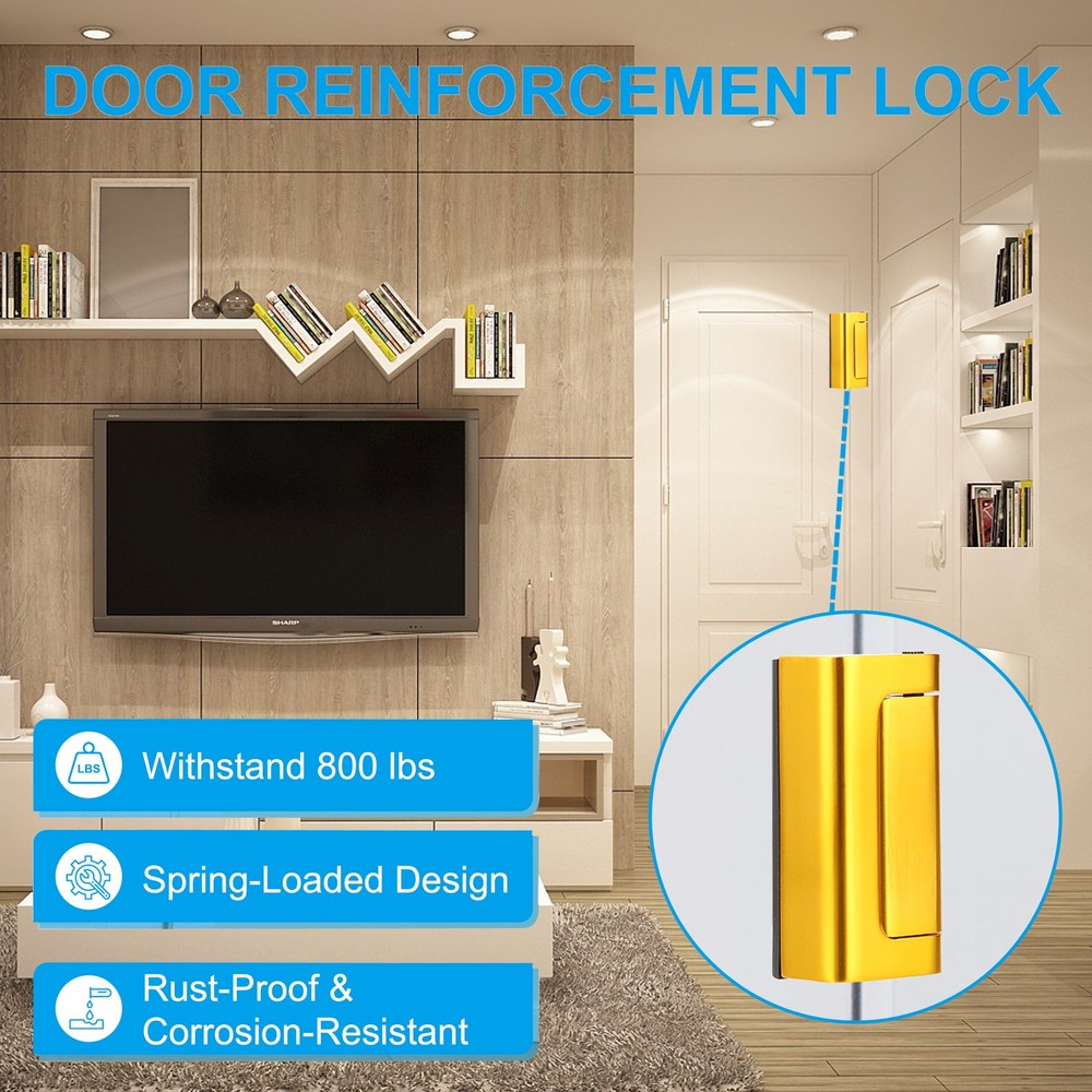 Document The high-security door reinforcement locks help prevent doors from being knocked away enhancing your home security and keeping you and your family safe! Make sure none of the doors can be opened from the outside.SpecificationColor: GoldMaterial: aluminum AlloyMaximum Withstand Capacity: 800 LbsMounting Plate Size: 63.5 x 56 x 1.95 mm/ 2.5 x 2.2 x 0.08 inch (L*W*Thickness)Lock Part Size: 76 x 25.4 x 35 mm/ 2.99 x 1 x 1.38 inch (L*W*H)Screw Mounting Distance: 20mm/ 0.79 inchScrew Length: 28.9mm/ 1.14 inchPacking List: 1 x Door Reinforcement Lock with 4 ScrewsAdvantage1. The security door lock is made of aluminum alloy with electroplating technology on the surface which is rust-proof moisture-proof corrosion-resistant comfortable to touch durable and has a long service life.2. The home anti-theft door lock is a tamper-resistant child-safe lock that prevents unauthorized entry through lock bumping. Designed to withstand up to 800 pounds of force when opening an interior door it enhances home security and prevents doors from being knocked away keeping your family safe.InstructionEquipped with 4 pieces of 28.9mm(1.13") screws and operation manual to help ensure an easy and quick installation.To unlock pinch the top and bottom of the door lock. Then slide the lock sideways along the door towards the hinge direction until it can be pulled outward.NOTE: Please measure the door plate thickness before ordering. Home Security Door Lock Aluminum Reinforcement Lock Withstand 800Lbs Gold The high-security door reinforcement locks help prevent doors from being knocked away enhancing your home security and keeping you and your family safe! Make sure none of the doors can be opened from the outside. Specification Color: Gold Material: aluminum Alloy Maximum Withstand Capacity: 800 Lbs Mounting Plate Size: 63.5 x 56 x 1.95 mm/ 2.5 x 2.2 x 0.08 inch (L*W*Thickness) Lock Part Size: 76 x 25.4 x 35 mm/ 2.99 x 1 x 1.38 inch (L*W*H) Screw Mounting Distance: 20mm/ 0.79 inch Screw Length: 28.9mm/ 1.14 inch Packing List: 1 x Door Reinforcement Lock with 4 Screws Advantage 1. The security door lock is made of aluminum alloy with electroplating technology on the surface which is rust-proof moisture-proof corrosion-resistant comfortable to touch durable and has a long service life. 2. The home anti-theft door lock is a tamper-resistant child-safe lock that prevents unauthorized entry through lock bumping. Designed to withstand up to 800 pounds of force when opening an interior door it enhances home security and prevents doors from being knocked away keeping your family safe. Instruction Equipped with 4 pieces of 28.9mm(1.13") screws and operation manual to help ensure an easy and quick installation. To unlock pinch the top and bottom of the door lock. Then slide the lock sideways along the door towards the hinge direction until it can be pulled outward. NOTE: Please measure the door plate thickness before ordering. Hot Item Payment 1.We accept eBay payment . 2.Payment must be received within 7 business days of auction closing. Shipping 1.We ship to your eBay or Paypal address. Please make sure your eBay and Paypal address is correct before you pay. 2.Items will be shipped within 1-3 business day when we received payment. 3.Delivery time depends on destination and other factors. Description Policy Home Security Door Lock Aluminum Reinforcement Lock Withstand 800Lbs Gold The high-security door reinforcement locks help prevent doors from being knocked away enhancing your home security and keeping you and your family safe! Make sure none of the doors can be opened from the outside. Specification Color: Gold Material: aluminum Alloy Maximum Withstand Capacity: 800 Lbs Mounting Plate Size: 63.5 x 56 x 1.95 mm/ 2.5 x 2.2 x 0.08 inch (L*W*Thickness) Lock Part Size: 76 x 25.4 x 35 mm/ 2.99 x 1 x 1.38 inch (L*W*H) Screw Mounting Distance: 20mm/ 0.79 inch Screw Length: 28.9mm/ 1.14 inch Packing List: 1 x Door Reinforcement Lock with 4 Screws Advantage 1. The security door lock is made of aluminum alloy with electroplating technology on the surface which is rust-proof moisture-proof corrosion-resistant comfortable to touch durable and has a long service life. 2. The home anti-theft door lock is a tamper-resistant child-safe lock that prevents unauthorized entry through lock bumping. Designed to withstand up to 800 pounds of force when opening an interior door it enhances home security and prevents doors from being knocked away keeping your family safe. Instruction Equipped with 4 pieces of 28.9mm(1.13") screws and operation manual to help ensure an easy and quick installation. To unlock pinch the top and bottom of the door lock. Then slide the lock sideways along the door towards the hinge direction until it can be pulled outward. NOTE: Please measure the door plate thickness before ordering. Hot Item Payment 1.We accept eBay payment . 2.Payment must be received within 7 business days of auction closing. Shipping 1.We ship to your eBay or Paypal address. Please make sure your eBay and Paypal address is correct before you pay. 2.Items will be shipped within 1-3 business day when we received payment. 3.Delivery time depends on destination and other factors.