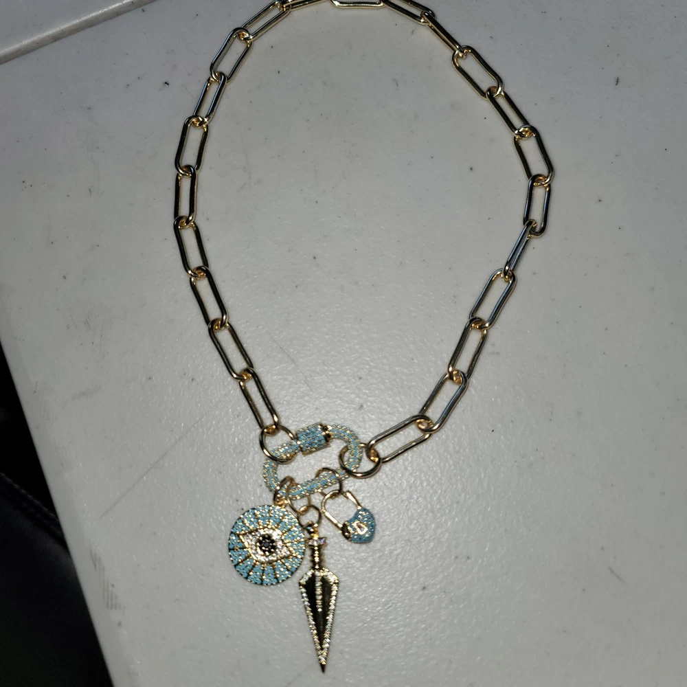 This Gold Paper Clip Crystal Carabiner Charm Necklace features an oval carabiner closure adorned with Aruba Blue Turquoise crystal charms. The necklace is 16 inches in length and made of brass plated metal. The unique design includes a stackable paper clip chain and is suitable for both men and women. With a statement, charm, and choker style, this piece encompasses themes of beauty, biker culture, love, bohemian vibes, ethnic influences, and hip hop fashion. It is a bold and eye-catching accessory perfect for adding a touch of personality to any outfit. Charms as photographed, metal, crystal and enamel. Brass gold plated. Please ask all questions prior to order. All sales are final. To open or close, spin barrel.