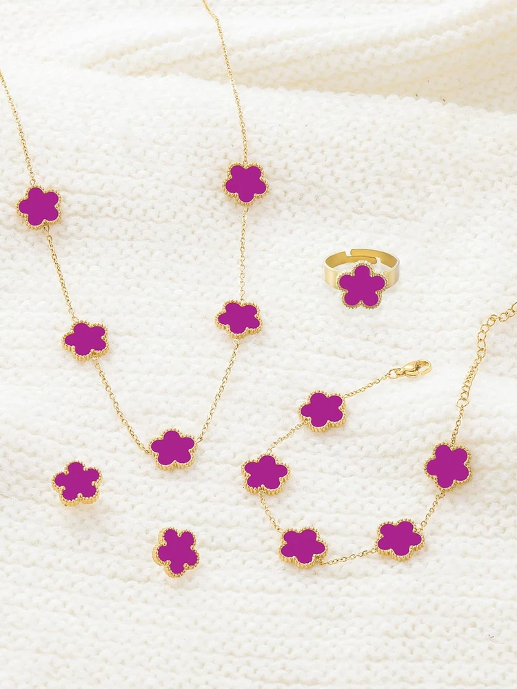 Gold Plated Five Leaf Clover Necklace Bracelet Rings and Stud Earrings Set for Women Lucky Flower Jewelry Product Details Color: Purple-14K Gold Plated Brand: Qinpan MPN: DZTZ1026 UPC: 737745261464 EAN: 0737745261464 Item Weight : 0.8 ounces Department : womens Date First Available : October 21, 2024 Manufacturer : QINPAN Brand, Seller, or Collection Name: Qinpan Material: Stainless Steel Gem Type: No Gemstone Item Length: 18 inches Chain: Link Chain Clasp: Lobster Clasp Ring size: 7.5 Number of stones: 13 Stone Weight: 13 cttw Metal: Yellow Gold Plated Stainless Steel Metal stamp: No Metal Stamp Metal Weight: 20 g Stone shape: Irregular Minimum clarity: Slightly Included Cut: Very Good Add endless sparkle to any special occasion with QINPAN's gorgeous necklace bracelet rings and stud set with plastic. Don't miss these set stunners, meticulously accented with inlaid chalcedony gems. These gleaming dangling necklace bracelet rings and earrings are surefire head-turners, whether worn for proms, bridesmaids, cocktail parties, mothers of the bride, holiday galas or with jeans and a sweater! We love the "dress up" or "dress down" versatility of these fashion dangle necklace earrings rings and bracelet set. Treat yourself or someone you love to some jewelry at a fabulous price. Caring For Your Jewelry: Our Jewelry are made of Genuine high-grade Material, as long as the proper maintenance, ensure wearing years still bright as new. They don't need to use very expensive maintenance water, just to avoid acid-base and moist environment.Perfume is also corrosive to jewelry. Humid conditions include: don't wear when shower, washing face, sweating, deposit before application of dry cloth to wipe dry.