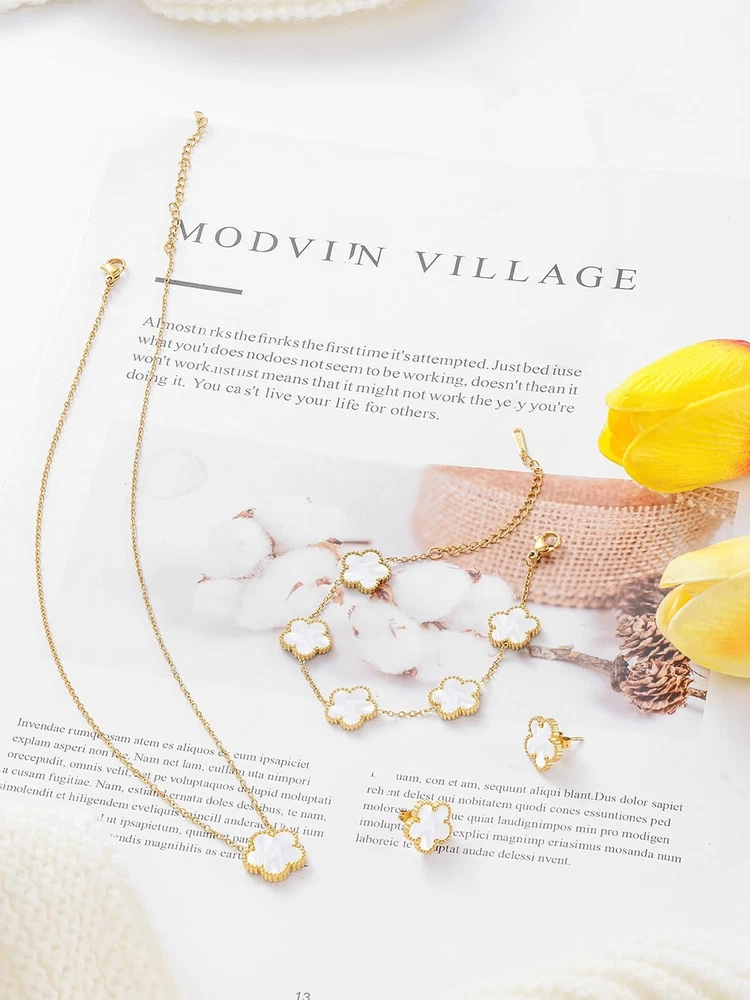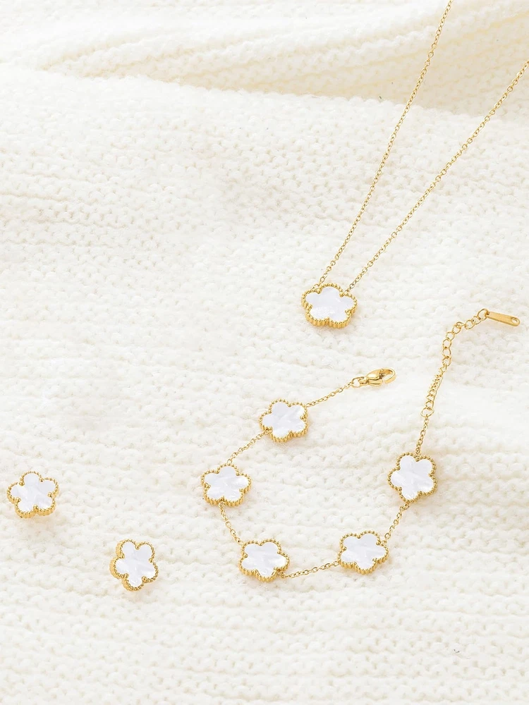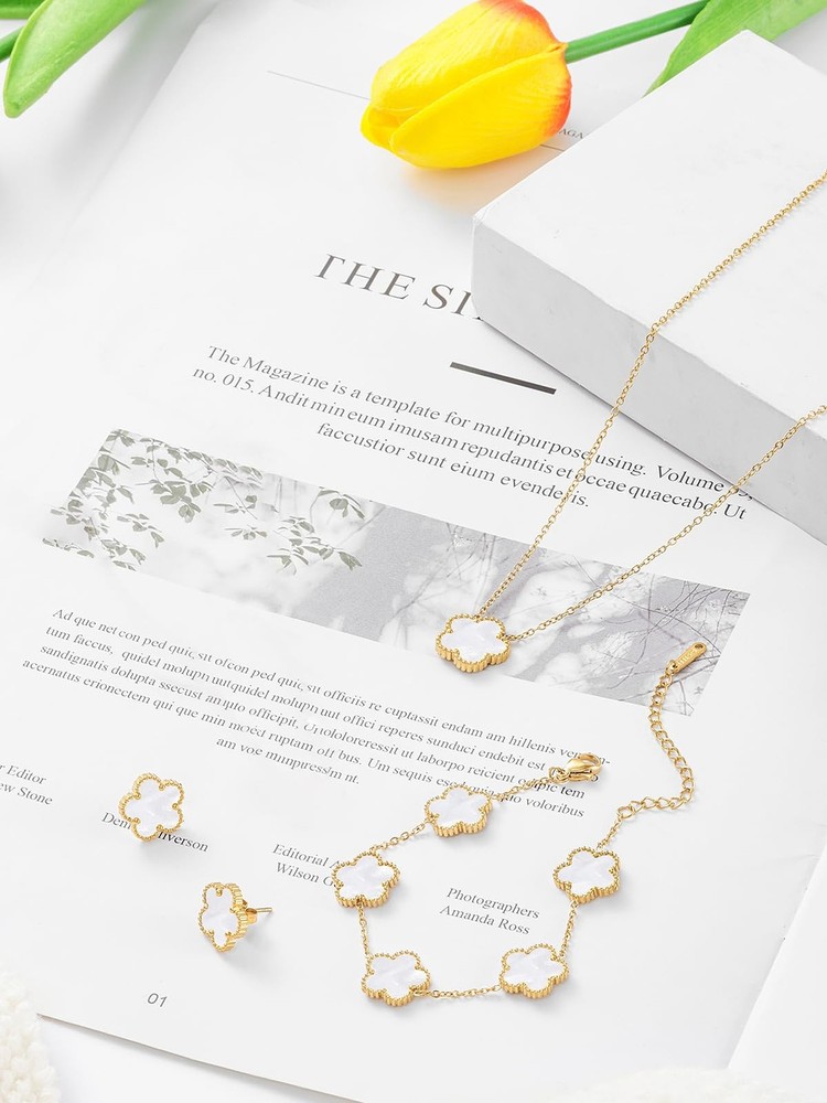Gold Plated Five Leaf Clover Dot Necklace Bracelet and Stud Earrings Set for Women Lucky Flower Jewelry Product Details Color: White-14K Gold Plated Brand: Qinpan MPN: DZTZ1024 UPC: 737745260863 EAN: 0737745260863 Item Weight : 0.5 ounces Department : womens Date First Available : October 10, 2024 Manufacturer : QINPAN Brand, Seller, or Collection Name: Qinpan Material: Stainless Steel Gem Type: No Gemstone Item Length: 18 inches Chain: Link Chain Clasp: Lobster Clasp Number of stones: 8 Stone Weight: 10 cttw Metal: Yellow Gold Plated Stainless Steel Metal stamp: No Metal Stamp Metal Weight: 12 g Stone shape: Irregular Minimum clarity: Slightly Included Cut: Very Good Add endless sparkle to any special occasion with QINPAN's gorgeous necklace bracelet and earring stud set with plastic. Don't miss these set stunners, meticulously accented with inlaid chalcedony gems. These gleaming dangling necklace bracelet and earrings are surefire head-turners, whether worn for proms, bridesmaids, cocktail parties, mothers of the bride, holiday galas or with jeans and a sweater! We love the "dress up" or "dress down" versatility of these fashion dangle necklace earrings and bracelet set. Treat yourself or someone you love to some jewelry at a fabulous price. Caring For Your Jewelry: Our Jewelry are made of Genuine high-grade Material, as long as the proper maintenance, ensure wearing years still bright as new. They don't need to use very expensive maintenance water, just to avoid acid-base and moist environment.Perfume is also corrosive to jewelry. Humid conditions include: don't wear when shower, washing face, sweating, deposit before application of dry cloth to wipe dry.