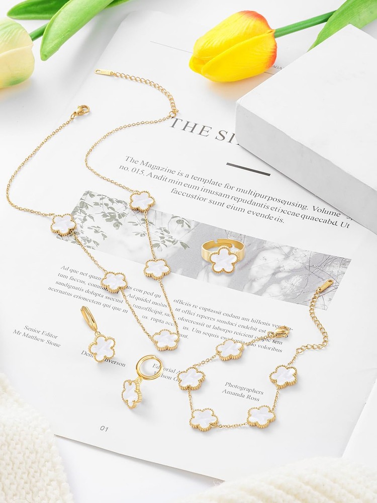 Gold Plated Five Leaf Clover Necklace Bracelet Rings and Dangle Earrings Set for Women Lucky Flower Jewelry Product Details Color: White-14K Gold Plated Brand: Qinpan MPN: DZTZ1032 UPC: 737745262072 EAN: 0737745262072 Item Weight : 0.85 ounces Department : womens Date First Available : October 22, 2024 Manufacturer : QINPAN Brand, Seller, or Collection Name: Qinpan Material: Stainless Steel Gem Type: No Gemstone Item Length: 18 inches Chain: Link Chain Clasp: Lobster Clasp Ring size: 7.5 Number of stones: 13 Stone Weight: 13 cttw Metal: Yellow Gold Plated Stainless Steel Metal stamp: No Metal Stamp Metal Weight: 21 g Stone shape: Irregular Minimum clarity: Slightly Included Cut: Very Good Add endless sparkle to any special occasion with QINPAN's gorgeous necklace bracelet rings and earrings set with plastic. Don't miss these set stunners, meticulously accented with inlaid chalcedony gems. These gleaming dangling necklace bracelet rings and dangle earrings are surefire head-turners, whether worn for proms, bridesmaids, cocktail parties, mothers of the bride, holiday galas or with jeans and a sweater! We love the "dress up" or "dress down" versatility of these fashion dangly earrings necklace rings and bracelet set. Treat yourself or someone you love to some jewelry at a fabulous price. Caring For Your Jewelry: Our Jewelry are made of Genuine high-grade Material, as long as the proper maintenance, ensure wearing years still bright as new. They don't need to use very expensive maintenance water, just to avoid acid-base and moist environment.Perfume is also corrosive to jewelry. Humid conditions include: don't wear when shower, washing face, sweating, deposit before application of dry cloth to wipe dry.
