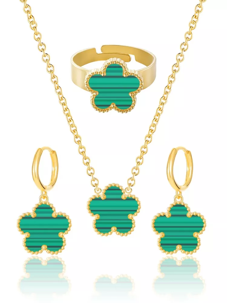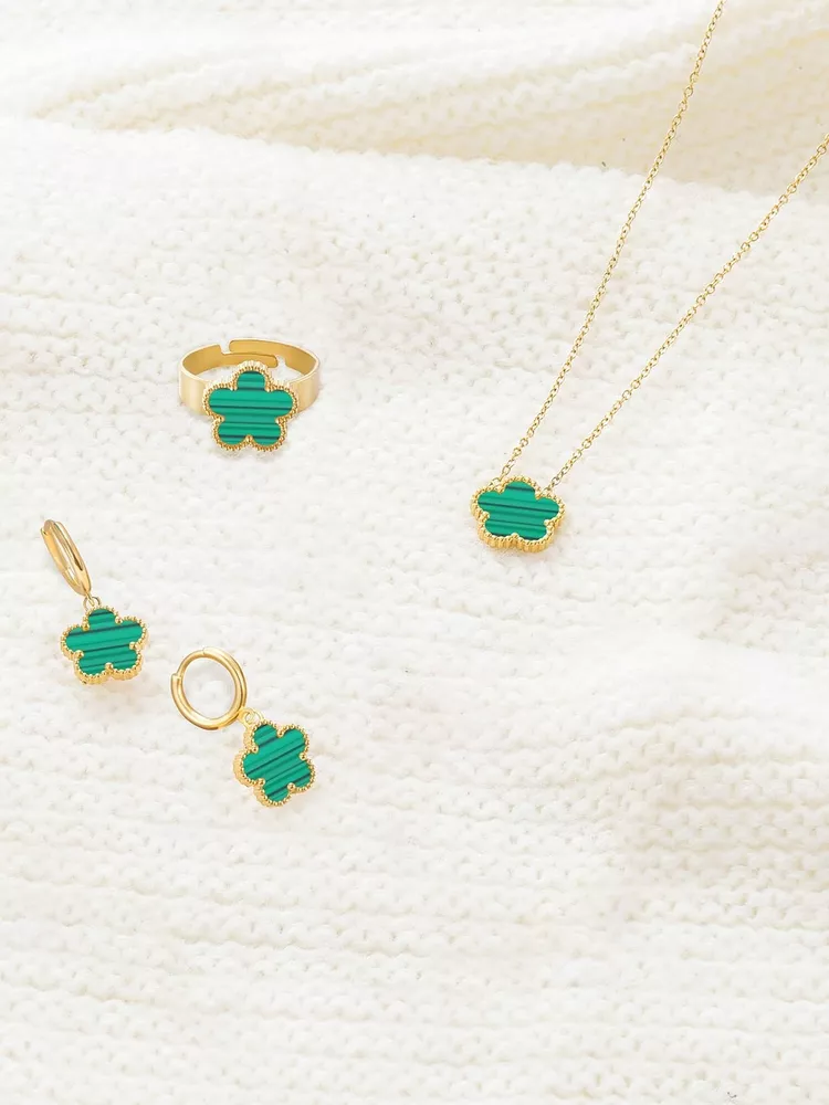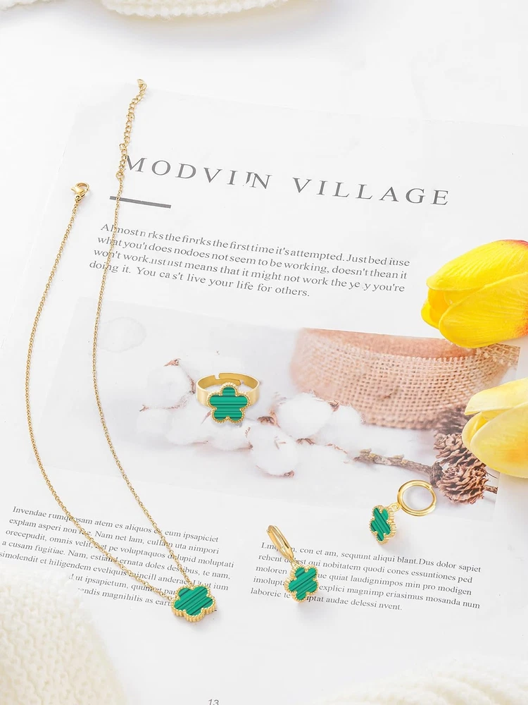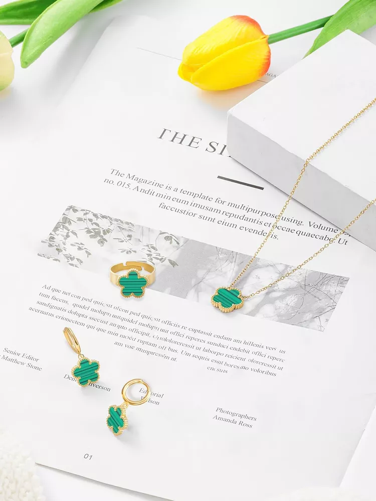 Gold Plated Five Leaf Clover Necklace Rings and Dangle Earrings Set for Women Lucky Flower Jewelry Product Details Color: Green Stripe-14K Gold Plated Brand: Qinpan MPN: DZTZ1036 UPC: 737745262591 EAN: 0737745262591 Item Weight : 0.35 ounces Department : womens Date First Available : October 22, 2024 Manufacturer : QINPAN Brand, Seller, or Collection Name: Qinpan Material: Stainless Steel Gem Type: No Gemstone Item Length: 18 inches Chain: Link Chain Clasp: Lobster Clasp Ring size: 7.5 Number of stones: 4 Stone Weight: 4 cttw Metal: Yellow Gold Plated Stainless Steel Metal stamp: No Metal Stamp Metal Weight: 9 g Stone shape: Irregular Minimum clarity: Slightly Included Cut: Very Good Add endless sparkle to any special occasion with QINPAN's gorgeous necklace rings and earrings set with plastic. Don't miss these set stunners, meticulously accented with inlaid chalcedony gems. These gleaming dangling necklace rings and dangle earrings are surefire head-turners, whether worn for proms, bridesmaids, cocktail parties, mothers of the bride, holiday galas or with jeans and a sweater! We love the "dress up" or "dress down" versatility of these fashion dangly earrings necklace and rings set. Treat yourself or someone you love to some jewelry at a fabulous price. Caring For Your Jewelry: Our Jewelry are made of Genuine high-grade Material, as long as the proper maintenance, ensure wearing years still bright as new. They don't need to use very expensive maintenance water, just to avoid acid-base and moist environment.Perfume is also corrosive to jewelry. Humid conditions include: don't wear when shower, washing face, sweating, deposit before application of dry cloth to wipe dry.