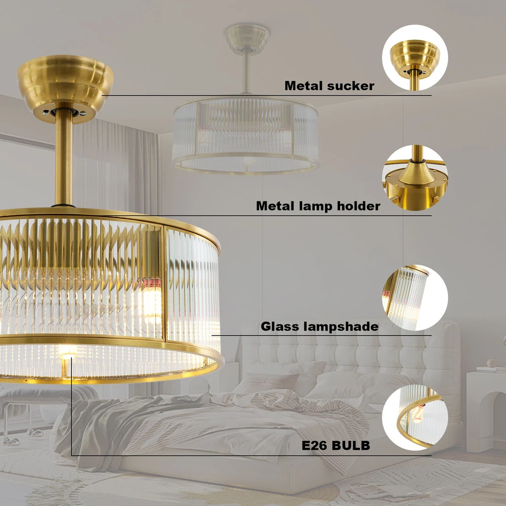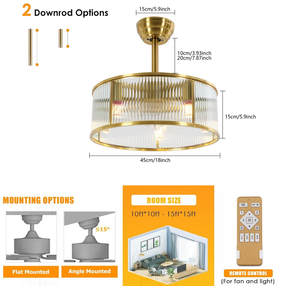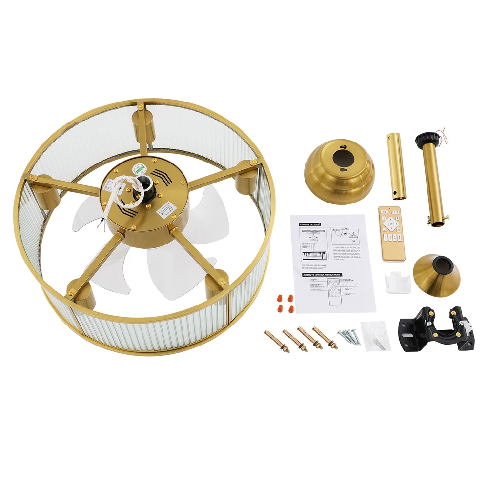 Gold Ceiling Fan Light Indoor Ceiling Fan Lamp for Bedroom with Remote Control Description This ceiling fan light can not only bring light but also allow you to enjoy the coolness. With its generous appearance, it can be integrated with different decoration styles, adding a beautiful visual effect. The adjustable wind speed can meet your various needs. It is not only a lamp, but also a beautiful decorative piece. Key Features Build to Last: Made of pure copper and glass, with an electroplating process, this product is impact-resistant , rust-resistant, and reliable, ensuring your long-term use. Good Lighting Effect: This product supports 5 E26 bulbs (not included), and the high-transmittance lampshade with a semi-open structure that will not block lights, providing great lighting for your room. Healthy and Energy-saving: This product provides more comprehensive air circulation and cooling, thereby reducing the frequency and time of air conditioning use, saving energy, and reducing expenses. It can avoid direct blowing and reduce the risk of air conditioning diseases. Embrace Smart Life : With the remote control, you can freely adjust the wind speed (6 gears) and set time (1/2/4/8 hour) while lying in bed, avoiding getting up and walking to the switch every time you want to change its settings, reducing catching a cold, and saving electricity bills. Reversible Function: The normal mode of the fan can bring coolness in summer. You can also reverse the direction of the fan in winter, blowing hot air from the top into the room and increasing the indoor temperature. Generous Appearance: The gold frame, circular shape, and the water ripples design of the lampshade give this product a generous and delicate appearance, making it an eye-catching decoration for your home. Exquisite Gift: With good performance and generous appearance, it can be used as a housewarming gift for parents, friends, and lovers so that they can also enjoy a more exquisite life. Simple Clean-up: With its simple construction and smooth surface, you can simply wipe off surface dust with a soft cloth. Details Round Base: The 5.9" diameter round base increases stress area, and ensures stable support for the light body without falling easily. Standard E26 Lamp Holders: They support the use of LEDs, Halogens, etc., making it very convenient for you to purchase and replace. Selectable Suspension Rods: The 3.93" and 7.87" suspension rods provide you with the flexibility to install this product according to your needs. Application With an applicable area of 107.64-161.46 ft² , it is suitable for a bedroom, living room, study, reading room, living room, cafe, store, bar, office, lounge, library, club, hotel, kindergarten, and so on. It is not only suitable for indoor lighting but also can be used as a ceiling fan. Specification Material: Glass, Pure Copper Process: Electroplating Motor Type: Pure Copper Motor Color: Gold Style: Modern Shape: Round Efficiency: E Assembly Required: Yes Mounting Type: Ceiling Mount Indoor/Outdoor Usage: Indoor Control Method: Remote Control(Included) Battery Type: 2* AAA Batteries(Not Included) Light Source: 5* E26 Bulbs(Not Included) Single Bulb Max. Power: 12W Number of Fan Blades: 5 Wind Speed Gears: 6 Voltage: 110V Timing: 1/2/4/8H Noise: < 35 dB Applicable Area: 10-15m²/107.64-161.46ft² Base Diameter: 15cm/5.9in Short Rod Length: 10cm/3.93in Long Rod Length: 20cm/7.87in Lampshade Size(D*H): 45*15cm/18*5.9in Package Size: 51*51*24cm/20.08*20.08*9.45in Gross Weight: 6.4kg/14.11lbs Net Weight: 5kg/11.02lbs Package Included 1* Ceiling Fan Light 1* Remote Control 1* English Manual All Accessories for Installation Notes Please check the dimensions of the product before ordering to ensure it fits your home. Please note that this product does not include 5 E26 bulbs, you need to purchase them by yourself. Normally, the expansion screw will blow up after the force is applied. Please read the operating manual completely before use. And pay particular attention to the safety instructions included. Please do not install the light next to the air conditioner or heater to avoid rusting due to moisture, which will affect the service life of the light. Please wear electric insulation gloves (not included) and avoid scratching the surface of the lamp and the electric wire when installing. Please make sure that the power supply has been cut off before installation, and conduct a power test before installation. Please install it by a licensed electrician if necessary. Please clean the light regularly. Please cut off the power supply when you clean the light. Please wipe with a soft cloth, it is not suitable to clean with cleaning agents. Please allow the slight color difference caused by the shooting light and 1-3cm error due to manual measurement, and make sure you do not mind before ordering. Payment Delivery details Terms of sales About us Contact us Payment We accept ebay payment 。 Fees such as import duties, taxes are not included in the item price or shipping costs. These charges are the buyer's responsibility. Delivery details Shipping: 2-9 working days to: USA Terms of sales We maintain high standards of excellence and strive for hundred percent customer satisfaction. Feedback is very important to us. We hope that you contact us immediately before you give neutral or negative feedback, so that we can address your concerns. It is impossible to address issues if we do not know about them! About us Your satis faction is our ultimate goal. We work hard to earn your trust and future business. Our certified technicians have tested each item before shipping. The unit comes with 1 year limited warranty on all manufacturing defects. a) If you receive a defective item, you may return it or ask for a discount. Please contact us within 14 days after you receive the package. b) What you returned must be intact and in its original packaging as re? u. Customer is responsible for shipping costs of the returned item. c)