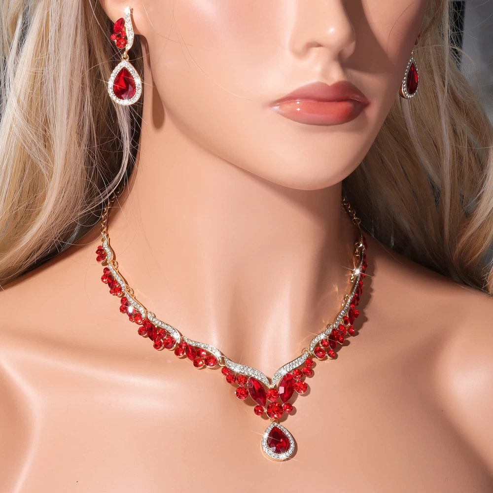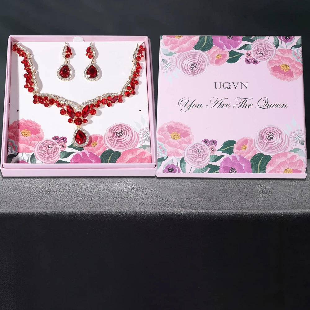Gold Silver Red Emerald Pink Black Blue Necklace Earrings Jewelry Gifts Set for Bride Mom Wife Grandmother Women on Wedding Birthday Party, Crystal Diamond Jewelry Set Gift Product Details Color: Red Brand: uqvn MPN: Does not apply UPC: Does not apply EAN: Does not apply Package Dimensions : 5.91 x 5.91 x 0.98 inches; 5.76 ounces Department : womens Date First Available : December 23, 2022 Brand, Seller, or Collection Name: uqvn Metal: alloy Material: Zinc Gem Type: Rhinestone Clasp: Lobster Clasp Number of stones: 50