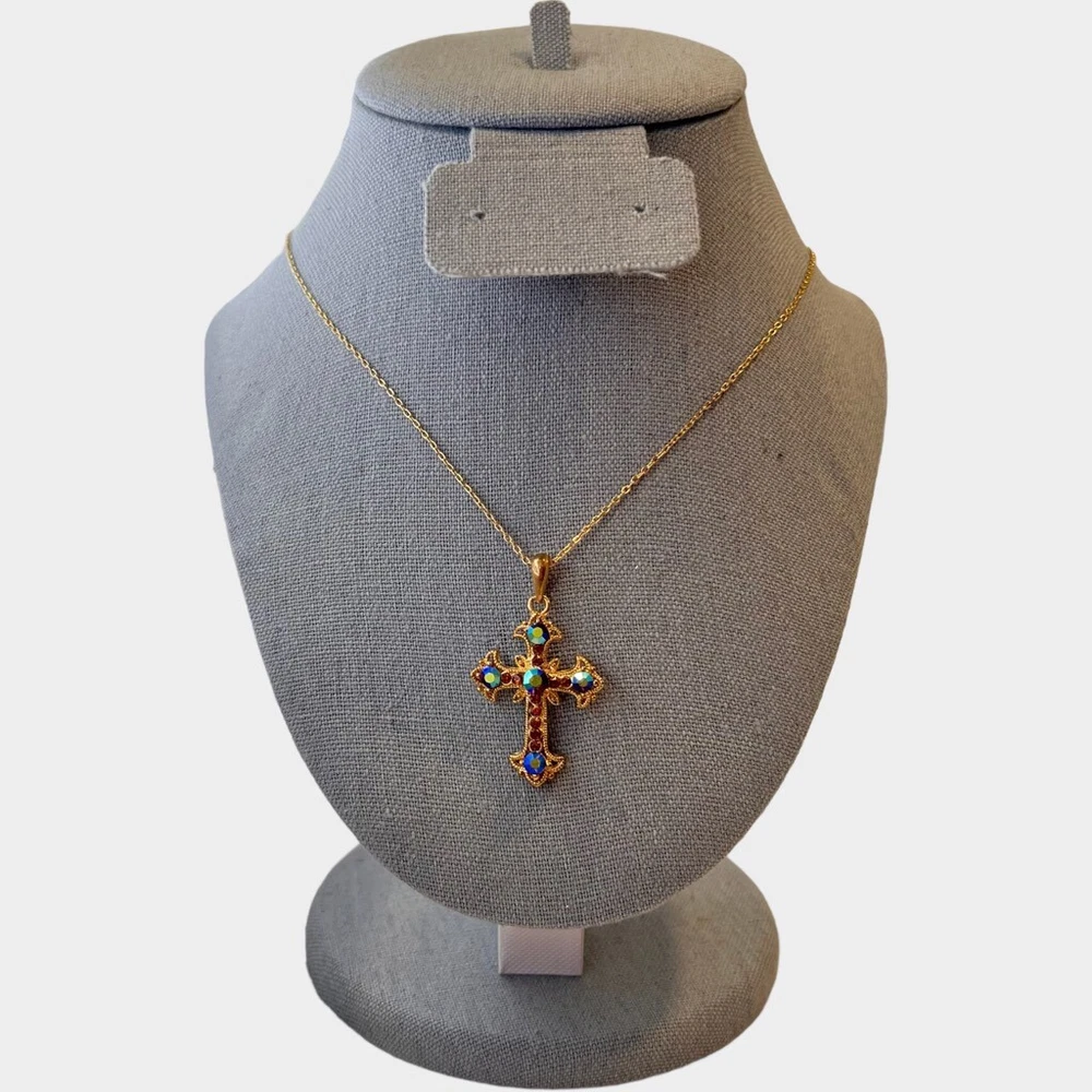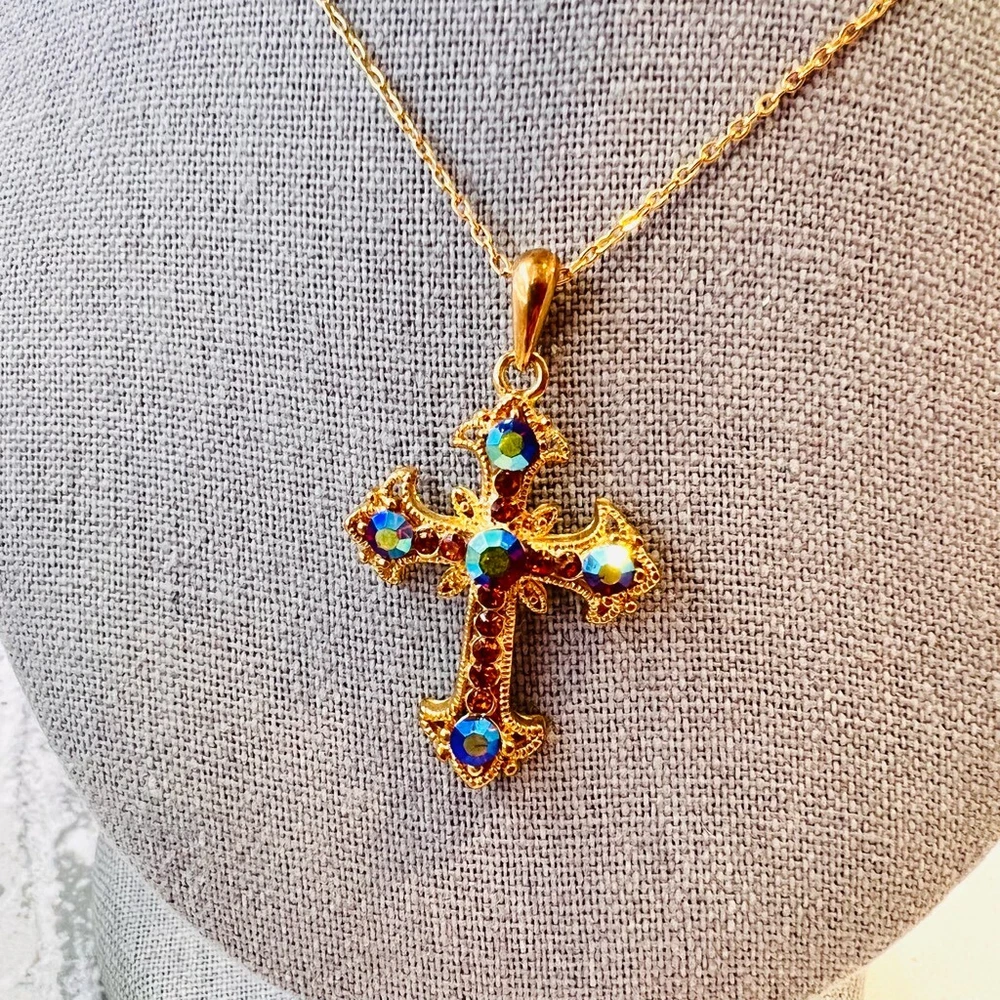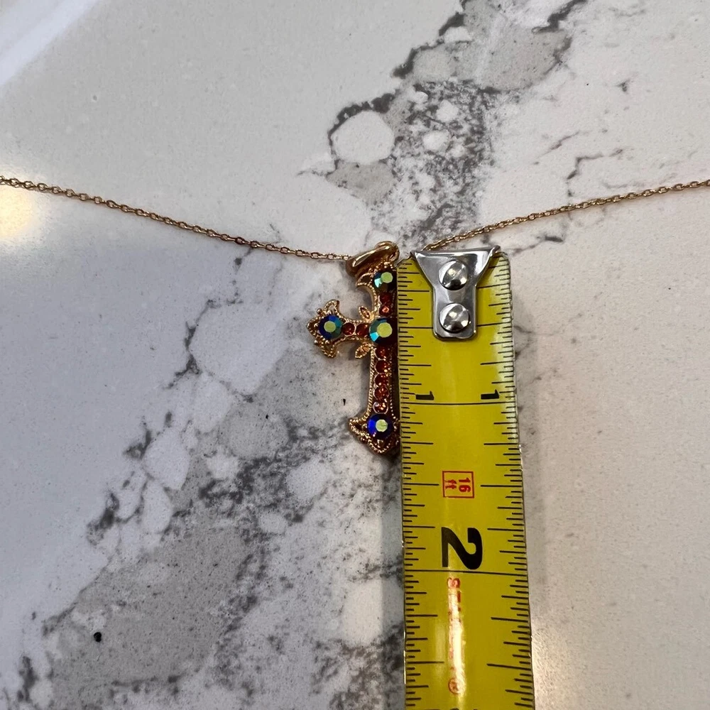 Gold Tone Cross Pendant with Blue / Purple Aurora Crystal Rhinestones Accents Gold tone cross pendant with aurora and amber rhinestone accents. Lobster clasp closure Approximate Measurements 18” full Length 2.5” extension 1.25” length x 1” width pendant Smoke Free | Pet Free Environment