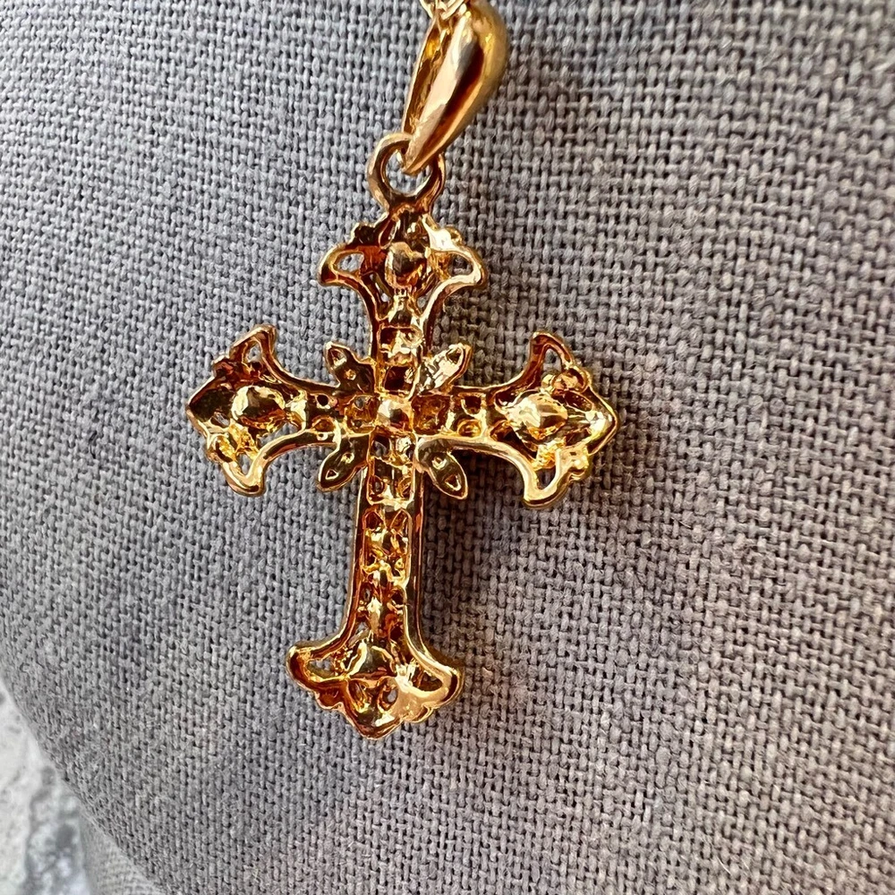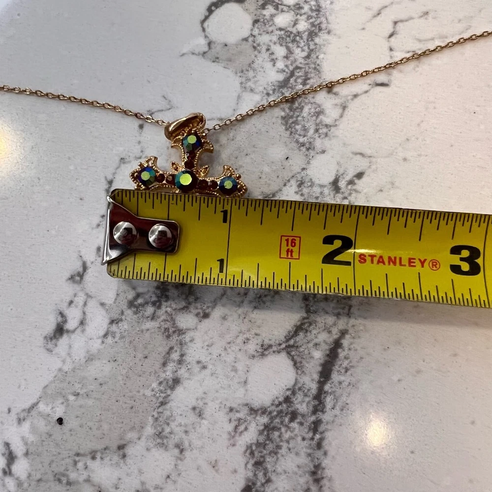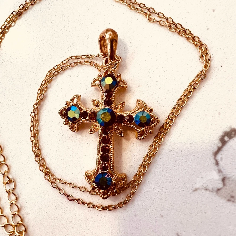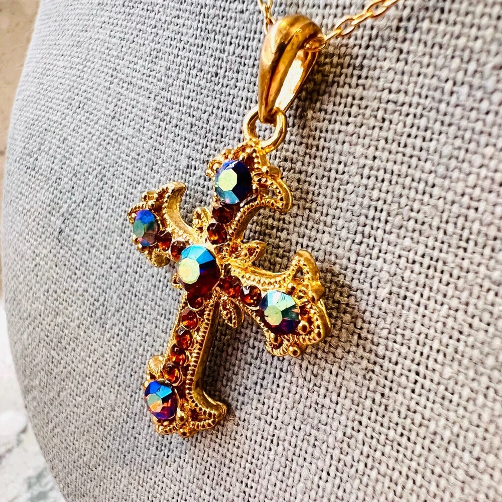 Gold Tone Cross Pendant with Blue / Purple Aurora Crystal Rhinestones Accents Gold tone cross pendant with aurora and amber rhinestone accents. Lobster clasp closure Approximate Measurements 18” full Length 2.5” extension 1.25” length x 1” width pendant Smoke Free | Pet Free Environment