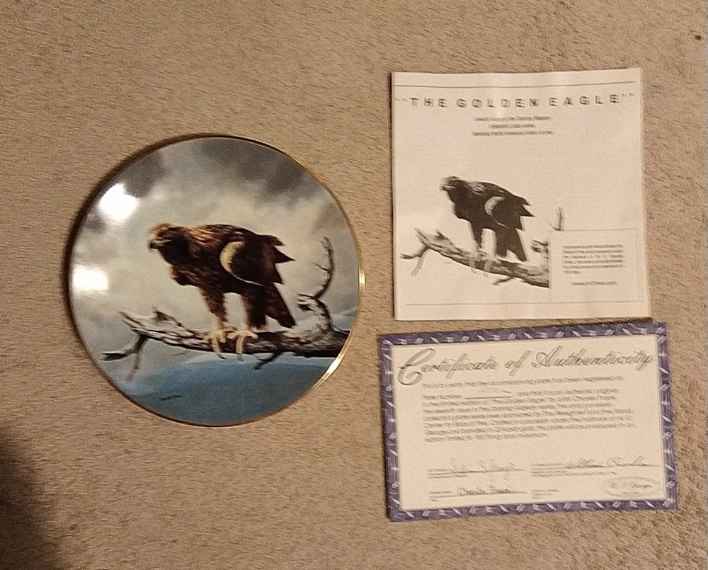 Elevate your collection with the Bradford Exchange Soaring Majesty collector plate, featuring the exquisite craftsmanship of Charles Frace. This 8.5-inch ceramic plate, from the 1991 series, showcases a majestic golden eagle in vivid, multicolor detail, capturing the spirit of wild animal themes beloved by collectors. The round shape and decorative style reflect the artistry of late 20th-century American pottery, making it a standout piece for any display. Complete with a stand for easy presentation, this collector's item embodies the production style of art pottery with a touch of historical significance. Whether you're commemorating special occasions or simply celebrating the beauty of nature, this plate is a timeless representation of both the Bradford Exchange legacy and the enduring allure of collector's items. You Will Receive The Item(s) Pictured. We Do COMBINE SHIPPING So Take A Look At Our Other Items. If You Would Like To Take Advantage Of The COMBINED SHIPPING Please Wait For Invoice Before Payment. If You Have Any Questions We Will Be Happy To Answer Them.