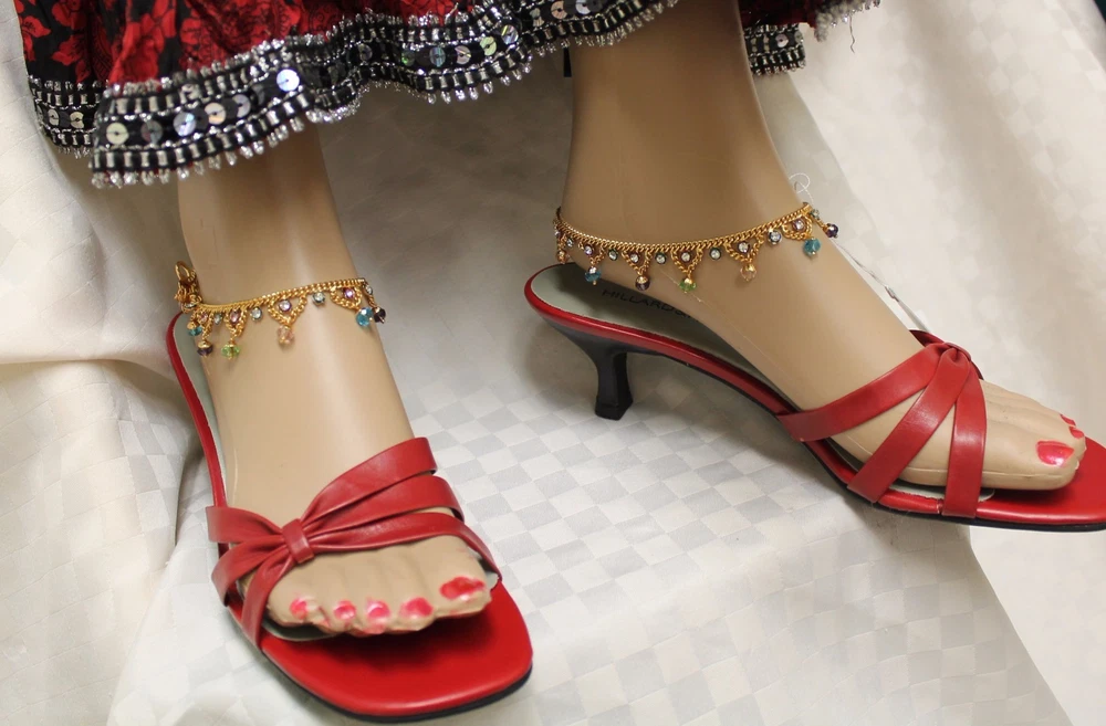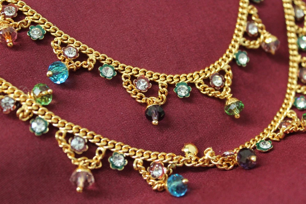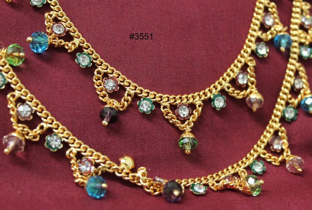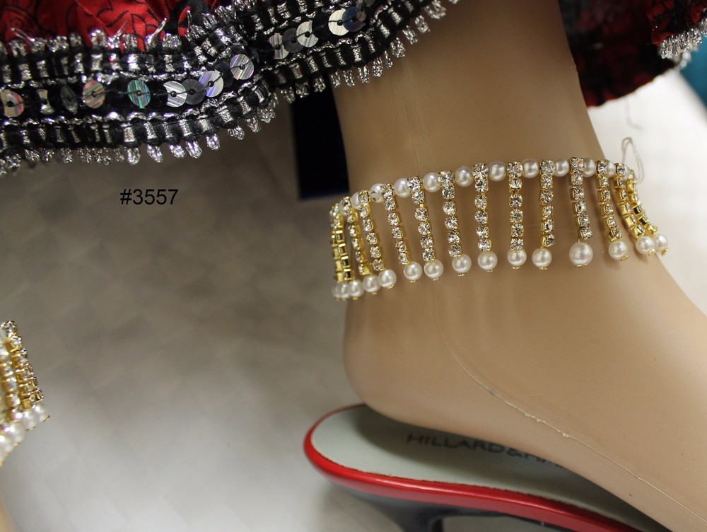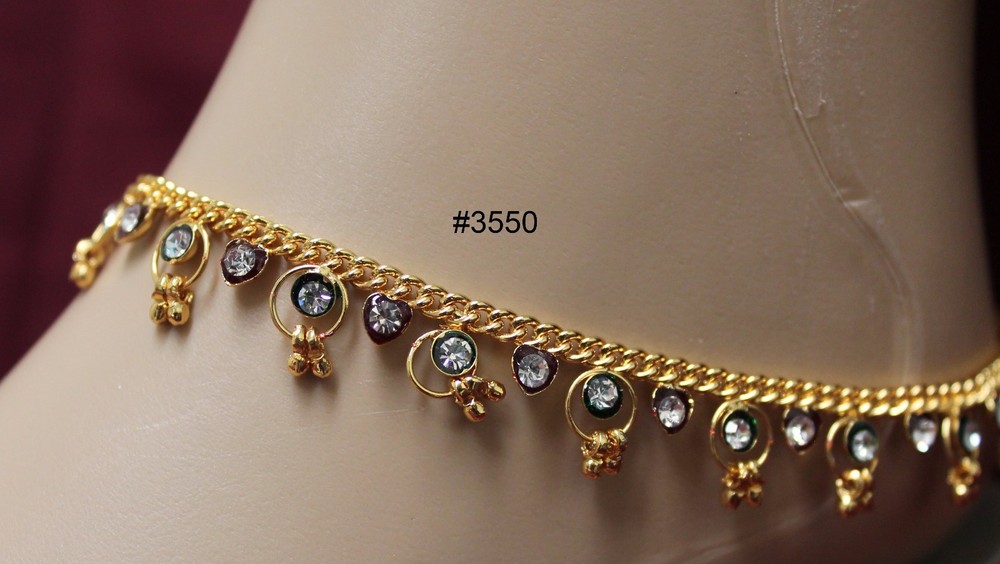 Anklets Payal Anklets Payals with Filigree Work Indulge yourself with India's rich artistic heritage with modern flair and style. #3550 SOLD Pair of Golden, Red and Green Meenakari pair of Payal. Straight Length 9.5" (Stock #2003550) #3551 Pair of Golden Multi Color Crystals and dangling Beads pair of Payal. Straight Length 9.5" (Stock #2003551) #3554 SOLD Pair of Silver multicolored dangling beads with zirconia along whole length pair of Payal. Straight length: 9.5" (Stock #2003554) #3557 Pair of Golden Payal with dangling Zircons and Pearls, Spiral, no hooks or lock, Clasp round ankle pair of Payal. (Stock #2003557) #5495 SOLD Pair of Golden Multi-color with glass dangling beads. 10" long. #5496 SOLD Pair of Golden three rows Zircons Payal . 9" long #5497 SOLD Pair of Silver two rows dangling fringe of zircon Payal . 9" long. #5498 SOLD Pair of light Golden two rows and fringe of Zircons Payal . 8" long. #7051 Pair of Golden Payal Anklet, Clear Round Beads and Flower. 10" length #7052 Pair of Golden Payal Anklet, Clear Oblong Beads and Flower. 10" length #7053 SOLD Pair of Silver Payal Anklet, Petal Flower. 9" length. All sizes are approx. from half to an inch more or less than the given measurement. The actual color may vary from the pictures slightly due to digital images Stock # 3500