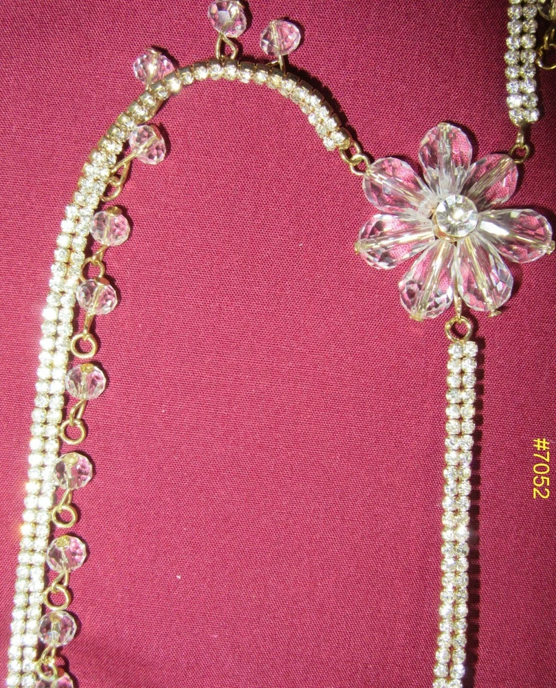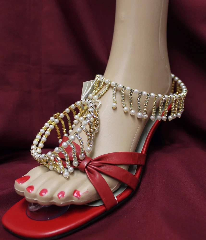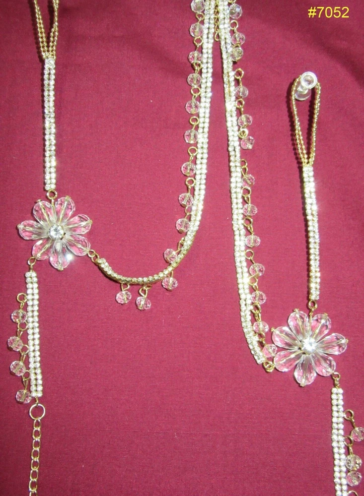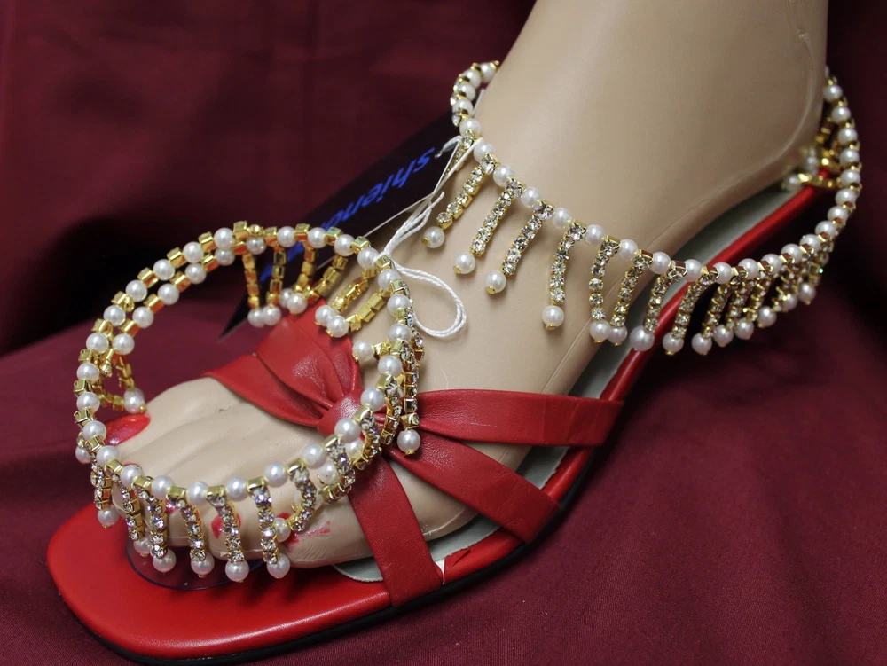 Anklets Payal Anklets Payals with Filigree Work Indulge yourself with India's rich artistic heritage with modern flair and style. #3550 SOLD Pair of Golden, Red and Green Meenakari pair of Payal. Straight Length 9.5" (Stock #2003550) #3551 Pair of Golden Multi Color Crystals and dangling Beads pair of Payal. Straight Length 9.5" (Stock #2003551) #3554 SOLD Pair of Silver multicolored dangling beads with zirconia along whole length pair of Payal. Straight length: 9.5" (Stock #2003554) #3557 Pair of Golden Payal with dangling Zircons and Pearls, Spiral, no hooks or lock, Clasp round ankle pair of Payal. (Stock #2003557) #5495 SOLD Pair of Golden Multi-color with glass dangling beads. 10" long. #5496 SOLD Pair of Golden three rows Zircons Payal . 9" long #5497 SOLD Pair of Silver two rows dangling fringe of zircon Payal . 9" long. #5498 SOLD Pair of light Golden two rows and fringe of Zircons Payal . 8" long. #7051 Pair of Golden Payal Anklet, Clear Round Beads and Flower. 10" length #7052 Pair of Golden Payal Anklet, Clear Oblong Beads and Flower. 10" length #7053 SOLD Pair of Silver Payal Anklet, Petal Flower. 9" length. All sizes are approx. from half to an inch more or less than the given measurement. The actual color may vary from the pictures slightly due to digital images Stock # 3500