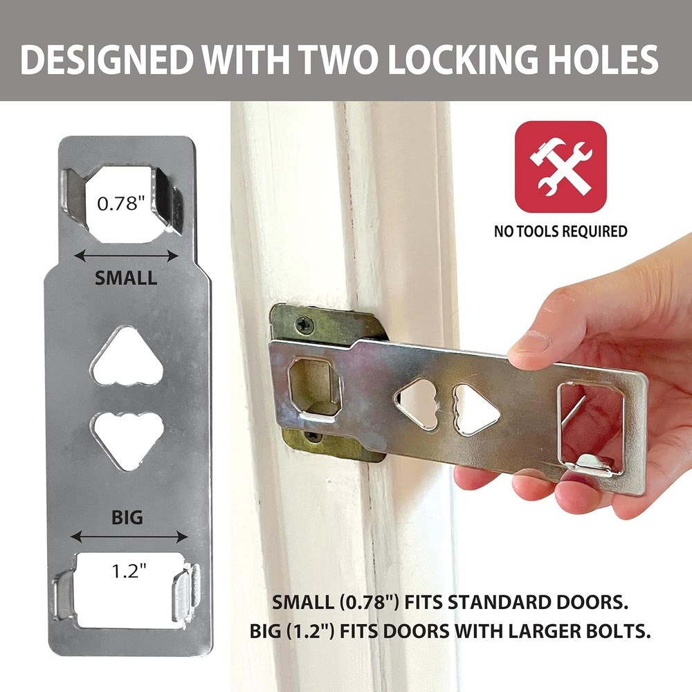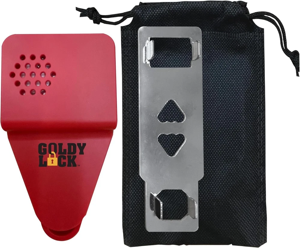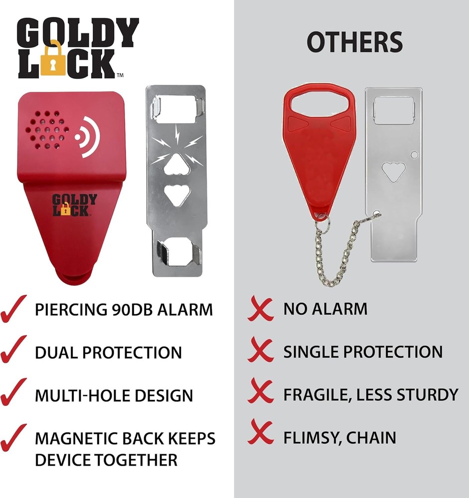 Goldy Lock Portable Door and Alarm 2-in-1 Protection Home & Hotel Red Product Details Sensor Technology: Contact Sensor Manufacturer: GOLDY LOCK Part Number: 60365 Item Weight: 4.6 ounces Product Dimensions: 5.1 x 1.4 x 6.3 inches Item model number: 60365 Item Package Quantity: 1 Included Components: Inclusive storage/travel pouch Batteries Included?: No Batteries Required?: No Color: Red Brand: GOLDY LOCK Power Source: Battery Powered Control Method: Touch Mounting Type: Door Mount Easy To Use, No Installation or Tools Required: The Goldy Lock door jam lock and alarm increase safety and privacy to any door. Designed with a heavy-duty steel reinforcement locking system, this portable door stopper provides a reliable defense against unauthorized entry without requiring any tools (not even a key will open the door). The alarm device is 90 dB (decibels). The removable door lock has a magnetic back to keep the metal plate and device together. Includes a handy pouch for storage. Prevents Unauthorized Entry: The 90dB alarm volume is instantly activated when someone tries to open the door without permission, preventing unauthorized entry. Goldy Lock is the ideal door lock protector, adds extra security and extra safety to everyone, especially singles, if you live alone, traveling solo, children, and pets. Goldy Lock is a reliable door stopper and door lock against intruders or unwanted visitors. Travel Safety Essentials: This door security lock and alarm is the ideal temporary door lock to use in hotels and rental properties when you want extra privacy and security. The Goldy Lock Alarm Portable Anti-Theft Device provides peace of mind with its reliable security features. Universal Multi-Size Design: Goldy Lock has two locking holes, 0.78” to fit small standard doors and 1.2” for larger bolts. The unique dual door protection, alarm and extra security door lock provides extra security against intruders. Its easy-to-use design makes it an excellent choice for anyone looking for increased privacy and protection at home, work or while traveling.